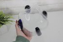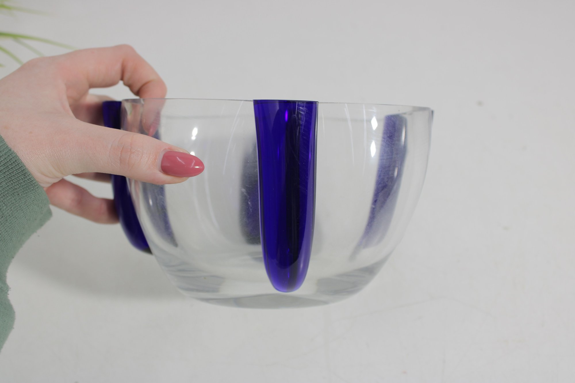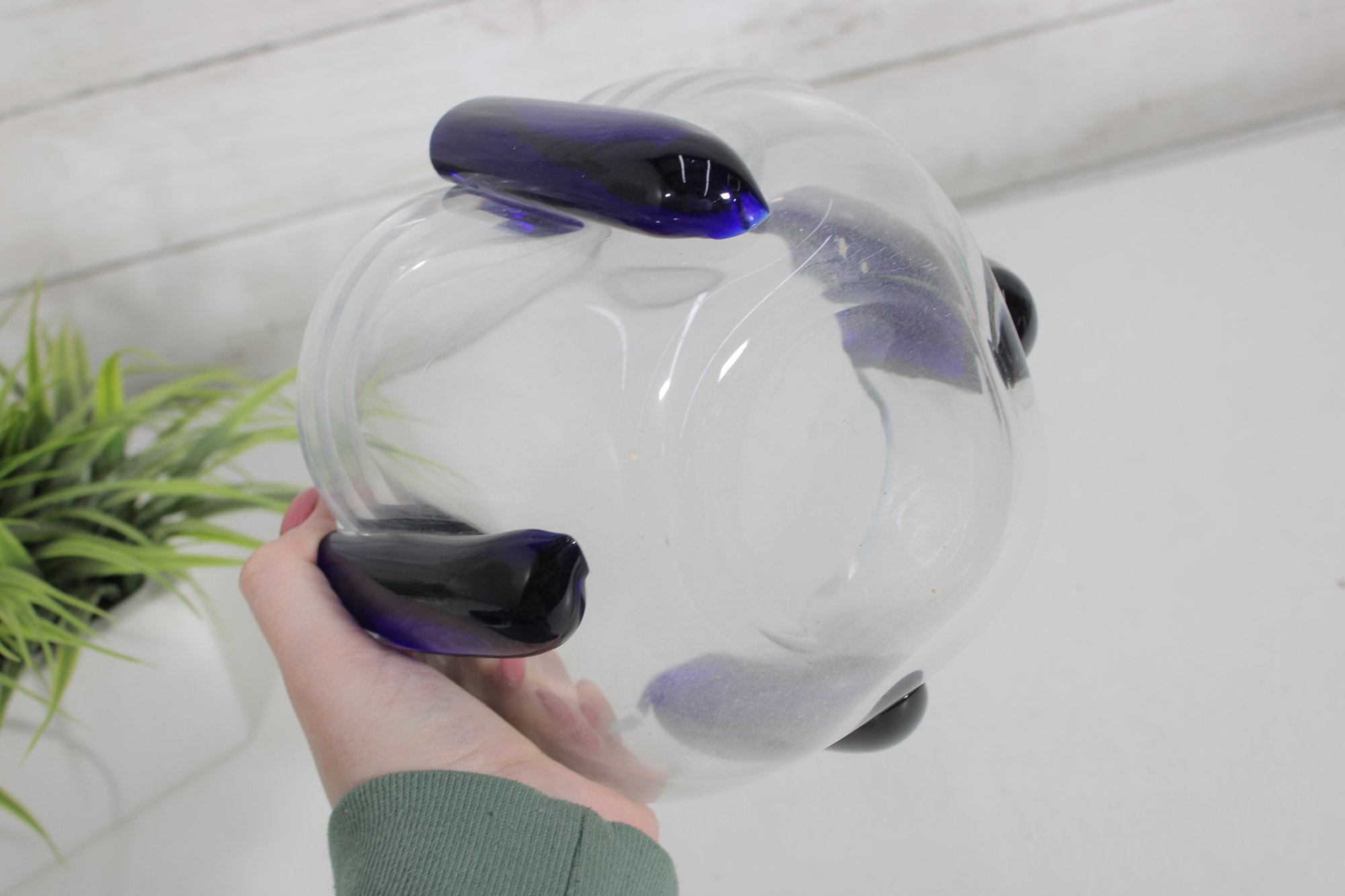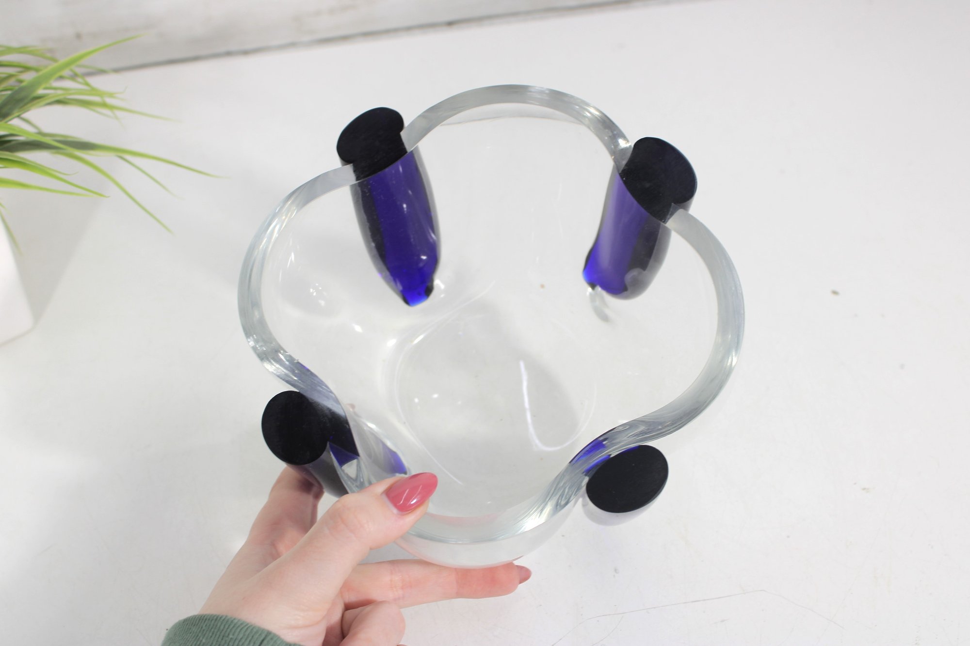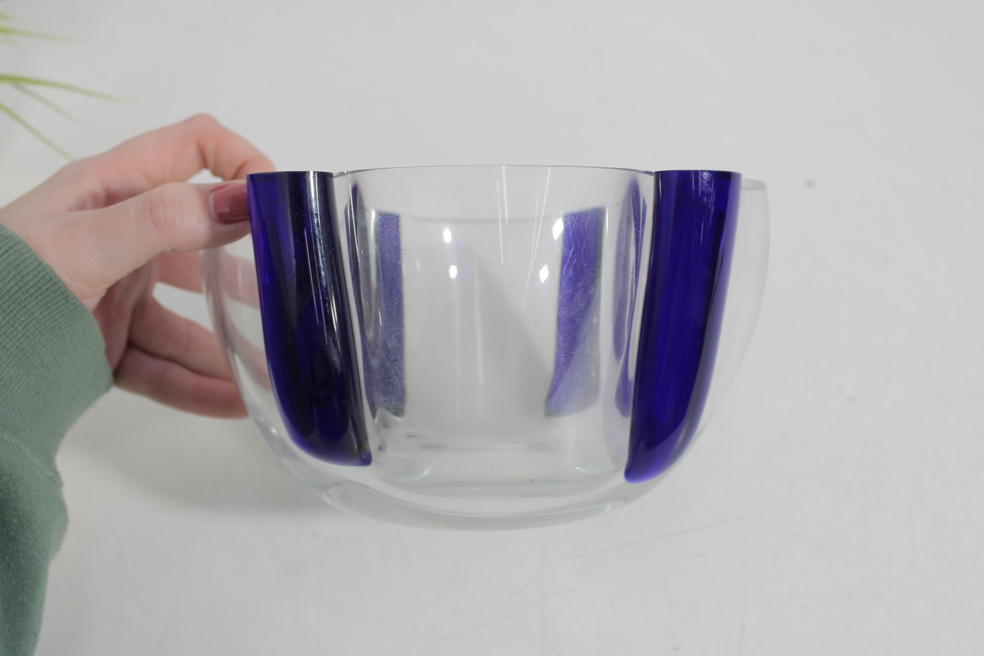 The unique design allows it to serve as both a decorative bowl or a low-profile vase, making it a versatile addition to any home or art glass collection. The deep blue accents contrast beautifully with the clear crystal, creating a visually dynamic piece.