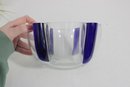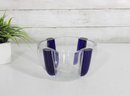 Beautiful Sasaki crystal art glass bowl/vase featuring a clear glass body accented with bold cobalt blue vertical swirl panels. The thick, high-quality crystal construction and sculptural form give this piece a striking modern aesthetic, perfect for display or functional use.