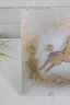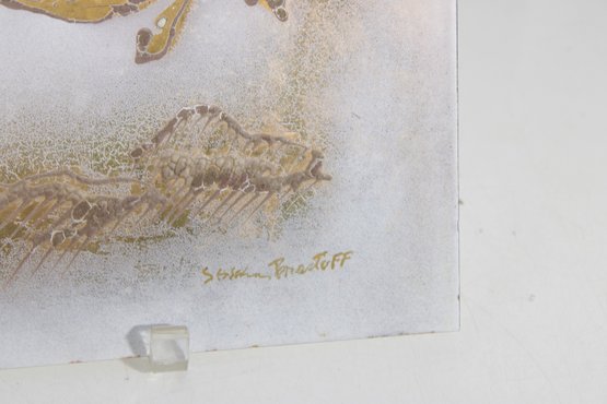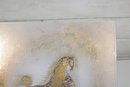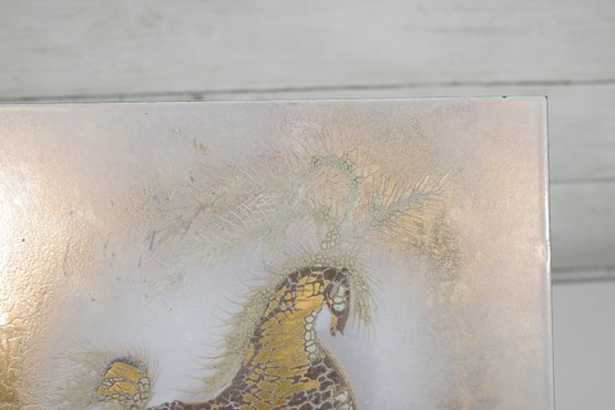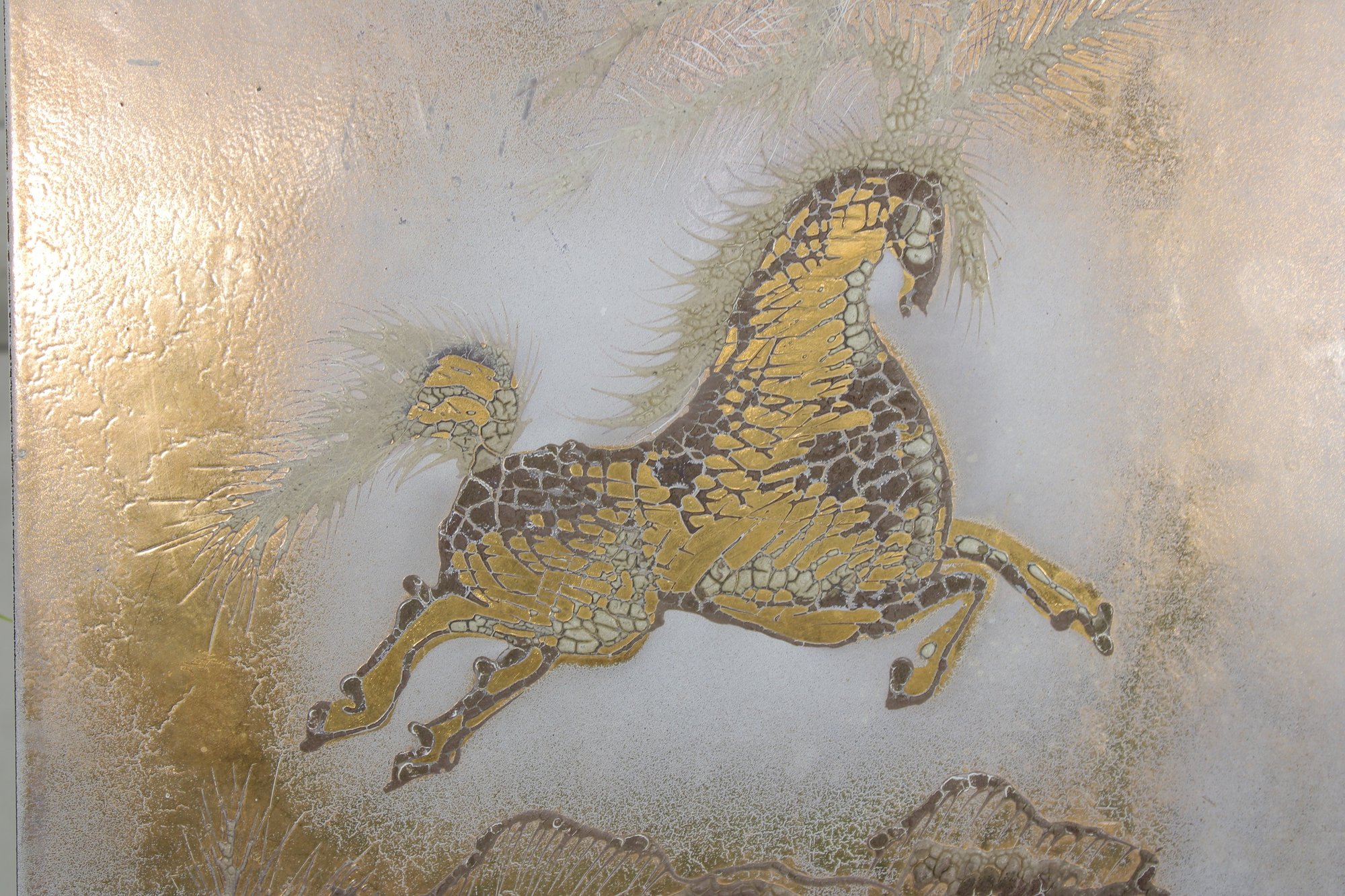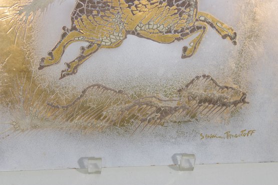 mid-century modern enamel on copper plaque attributed to Sascha Brastoff. This piece features a dynamic, stylized horse in motion, rendered in rich gold tones with intricate detailing against a softly textured, abstract background. The composition captures movement and elegance, characteristic of Brastoff’s iconic design aesthetic.