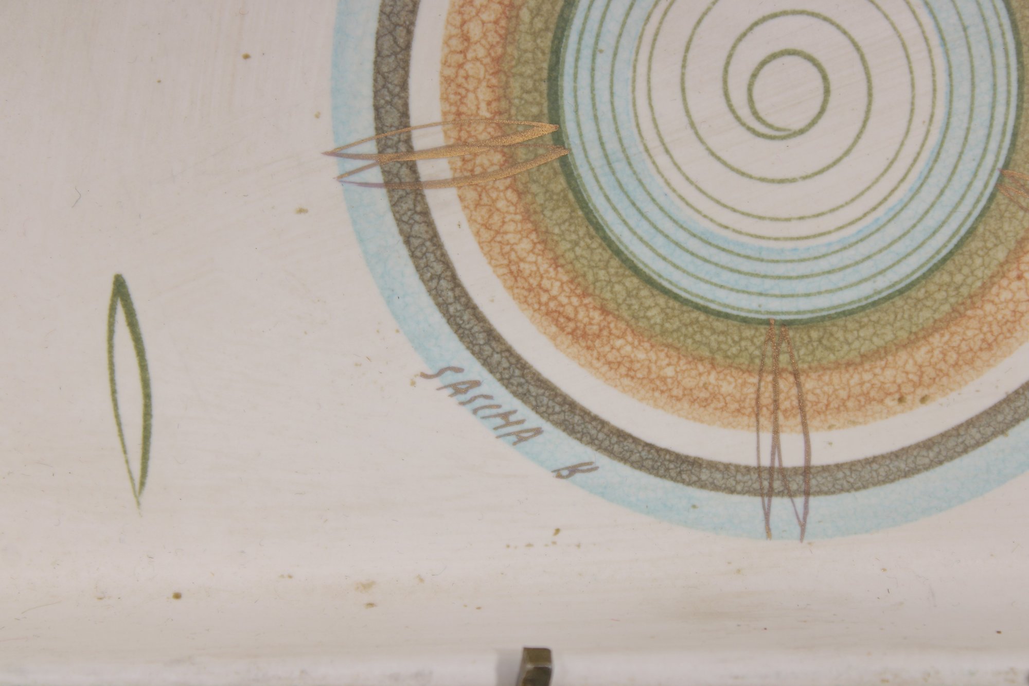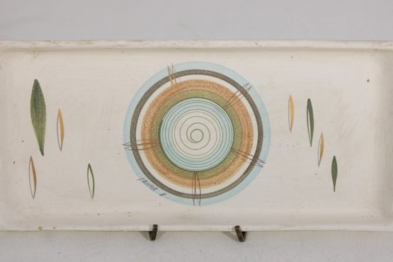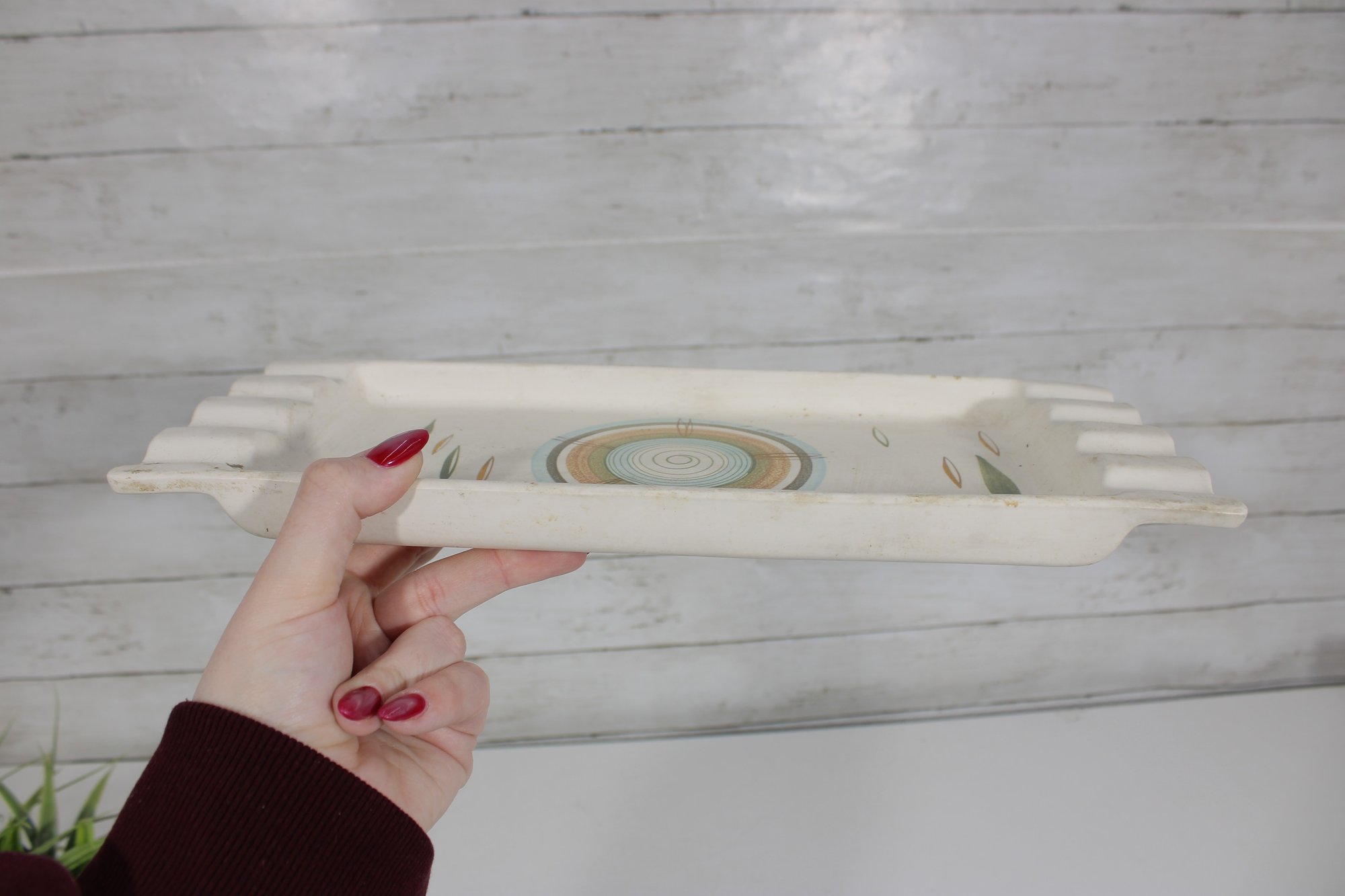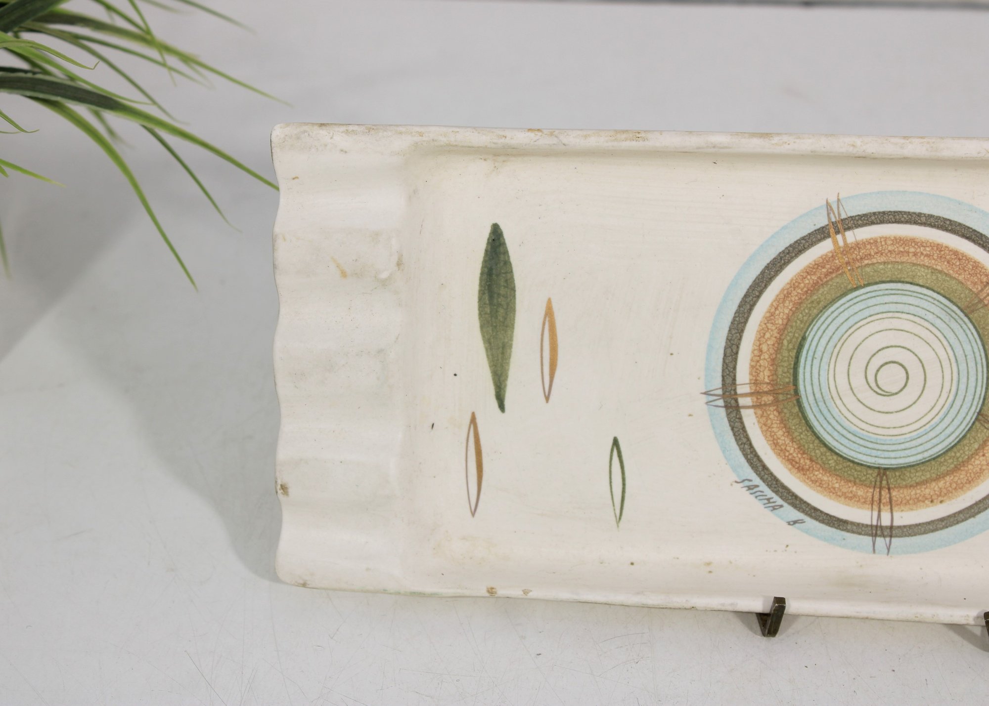 Sascha Brastoff mid-century modern art pottery tray featuring a classic atomic-era design. The rectangular form is accented with sculpted edges and showcases a vibrant central target motif in aqua, gold, and earth tones, complemented by elongated atomic leaf shapes along the sides.