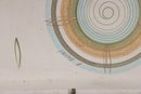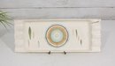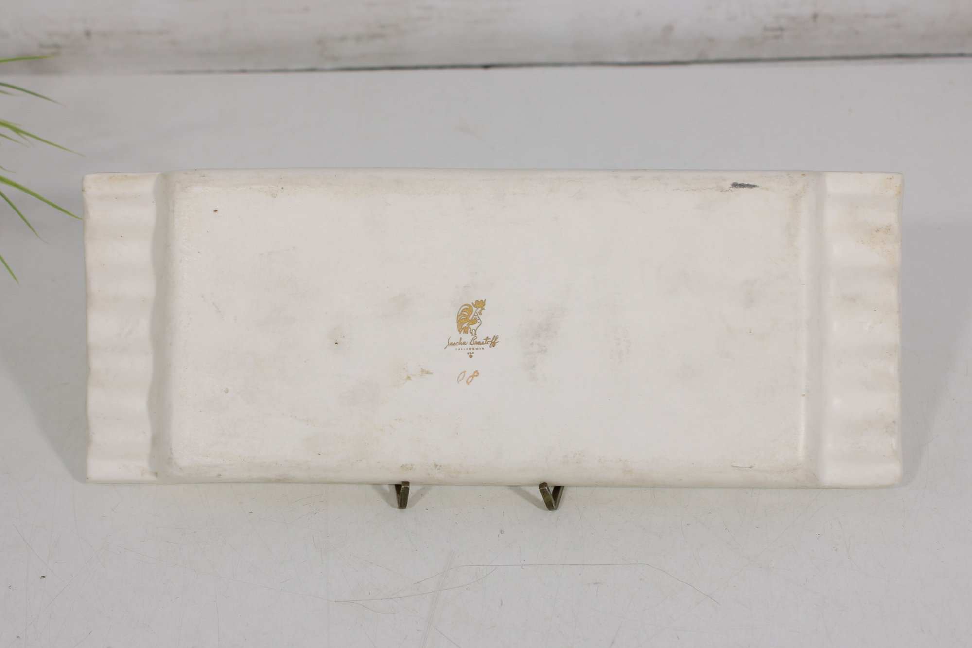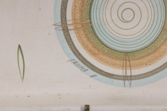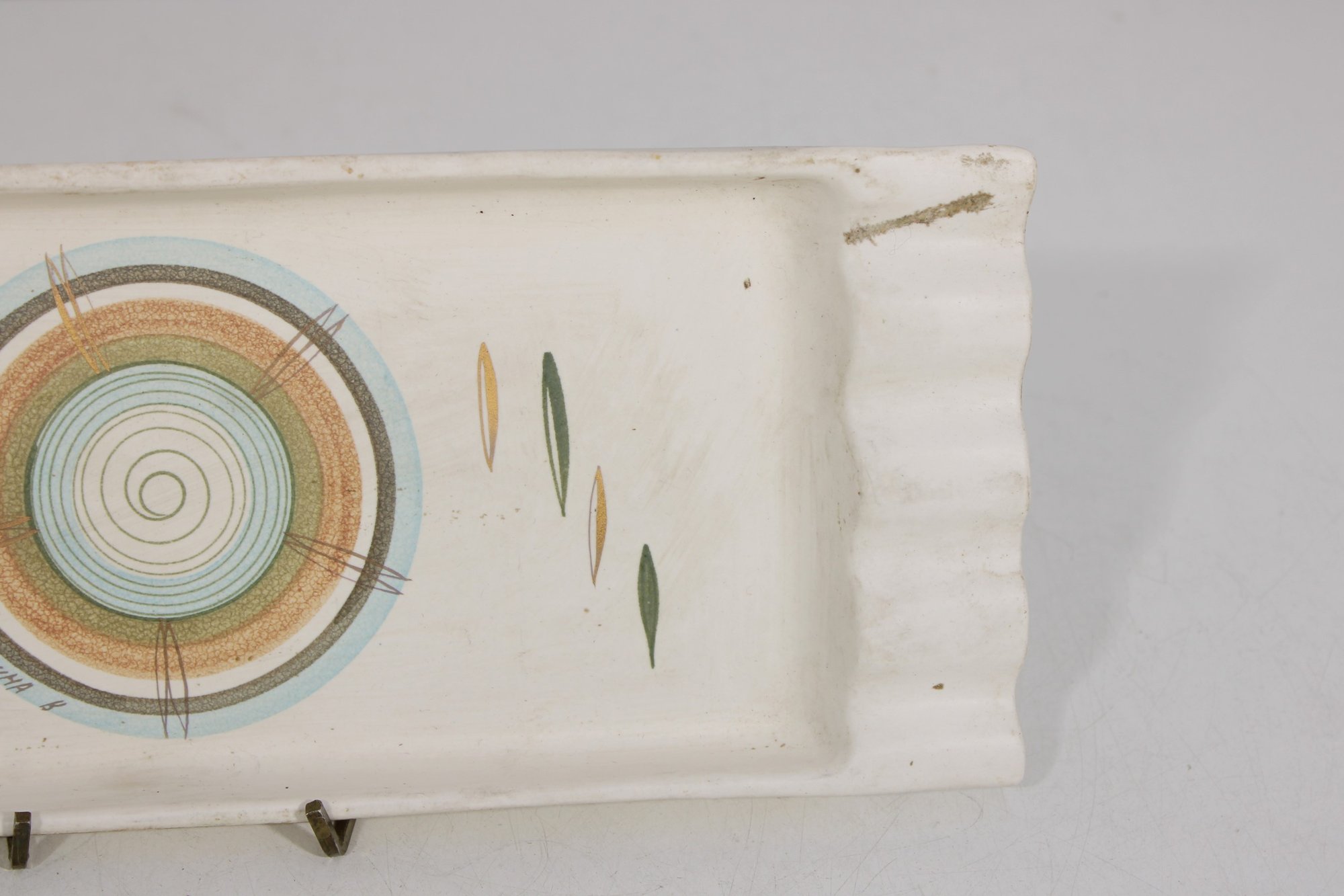 Sascha Brastoff mid-century modern art pottery tray featuring a classic atomic-era design. The rectangular form is accented with sculpted edges and showcases a vibrant central target motif in aqua, gold, and earth tones, complemented by elongated atomic leaf shapes along the sides.