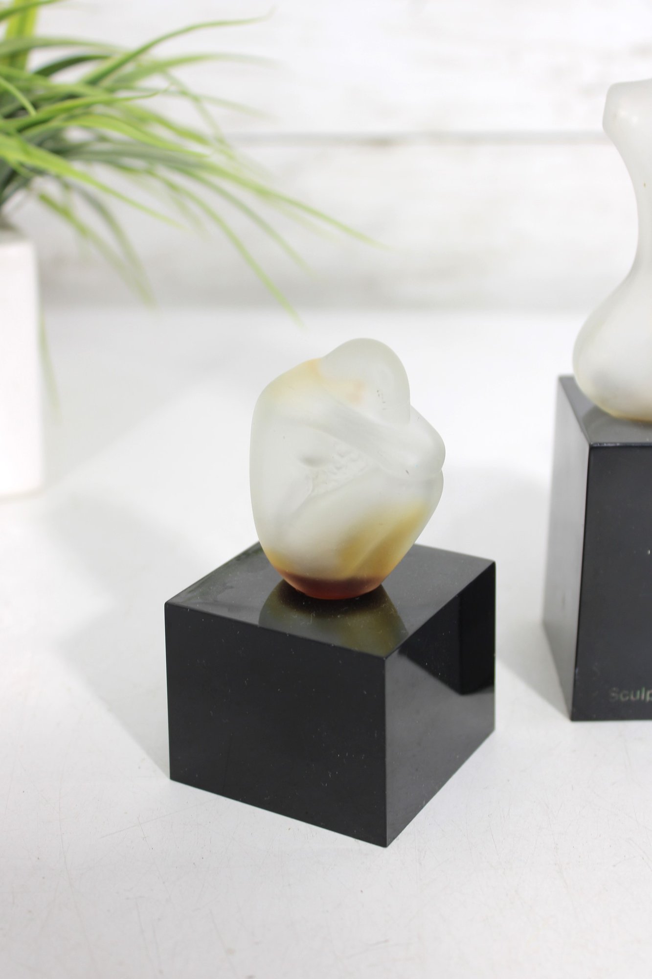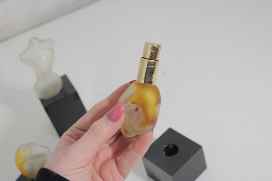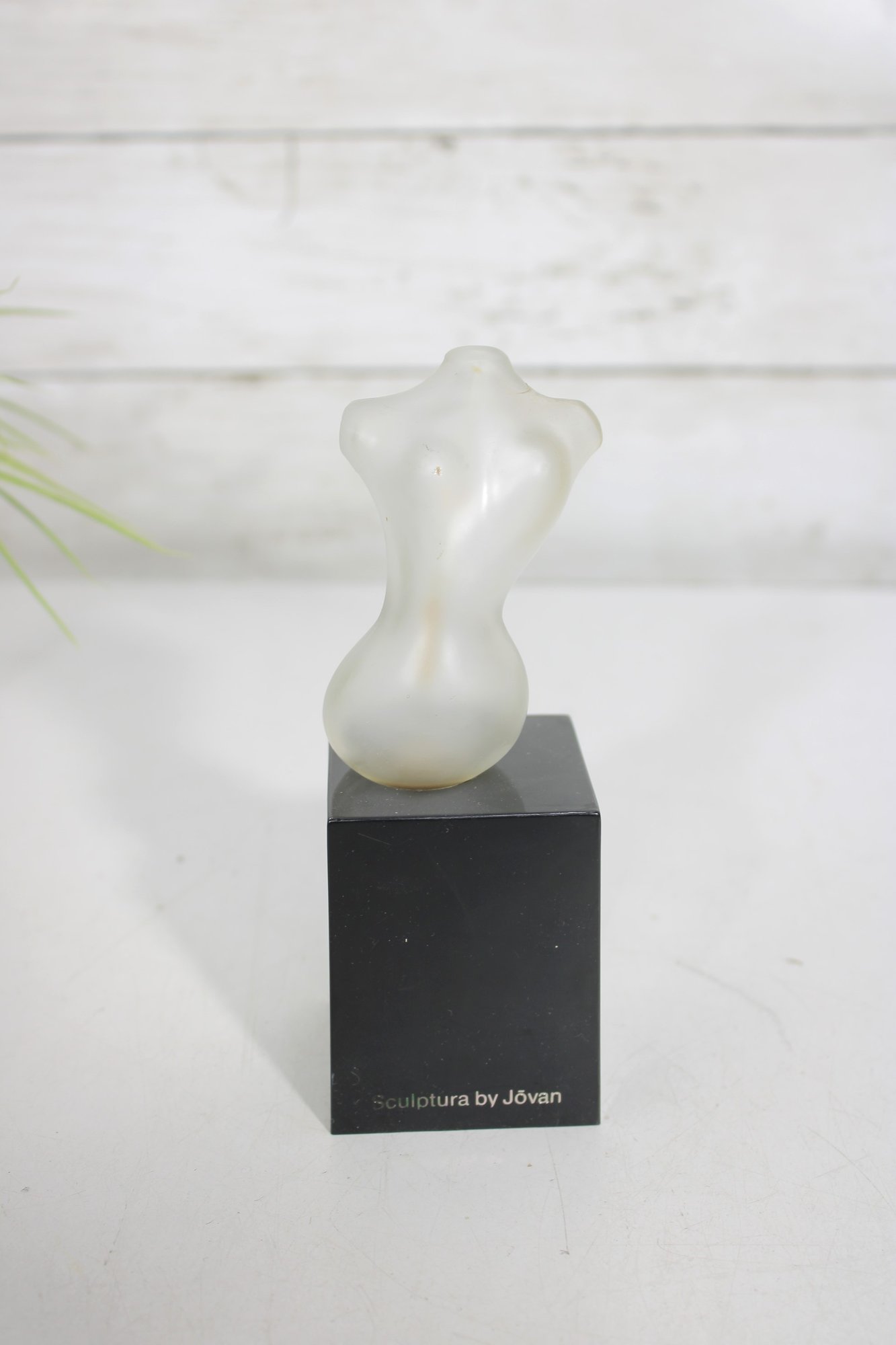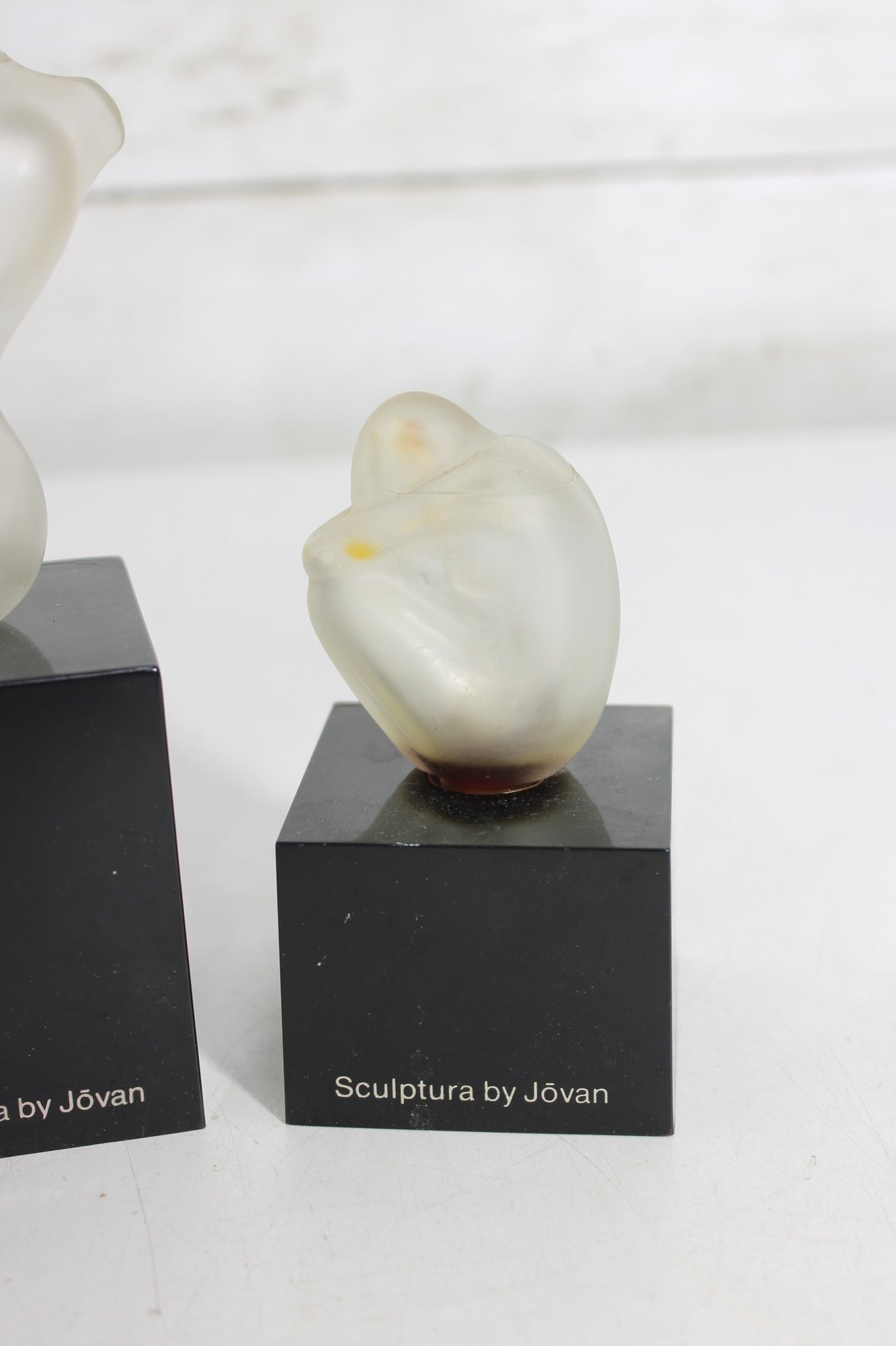 Unique vintage Sculptura by Jovan perfume bottle set featuring three stylized nude figurine forms mounted on black display bases. These artistic bottles double as sculptural décor, showcasing smooth frosted glass bodies with soft amber accents.