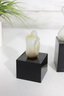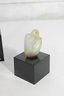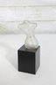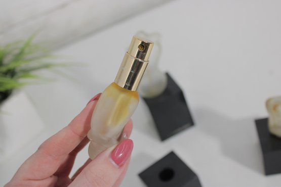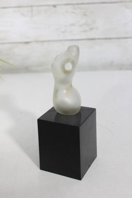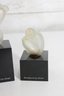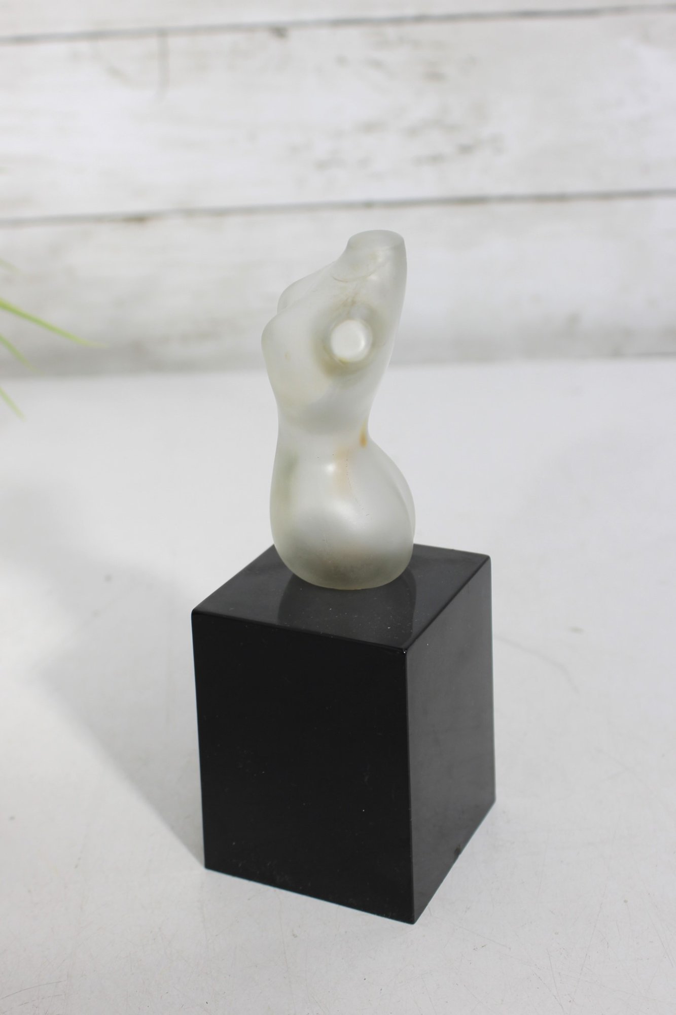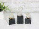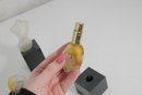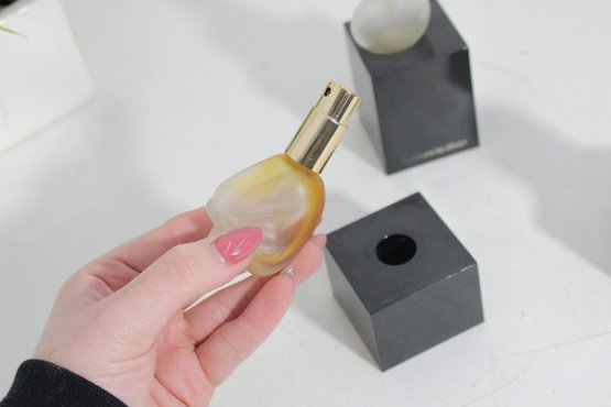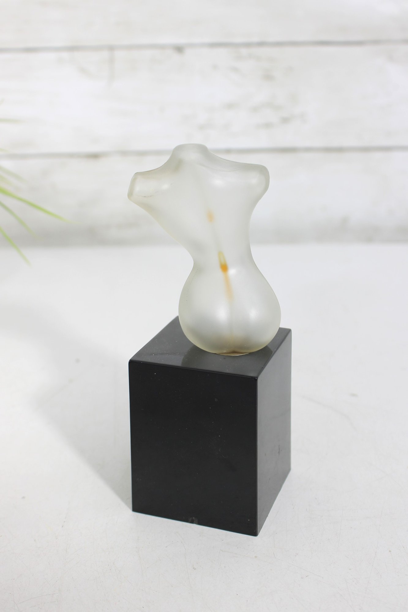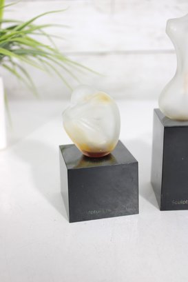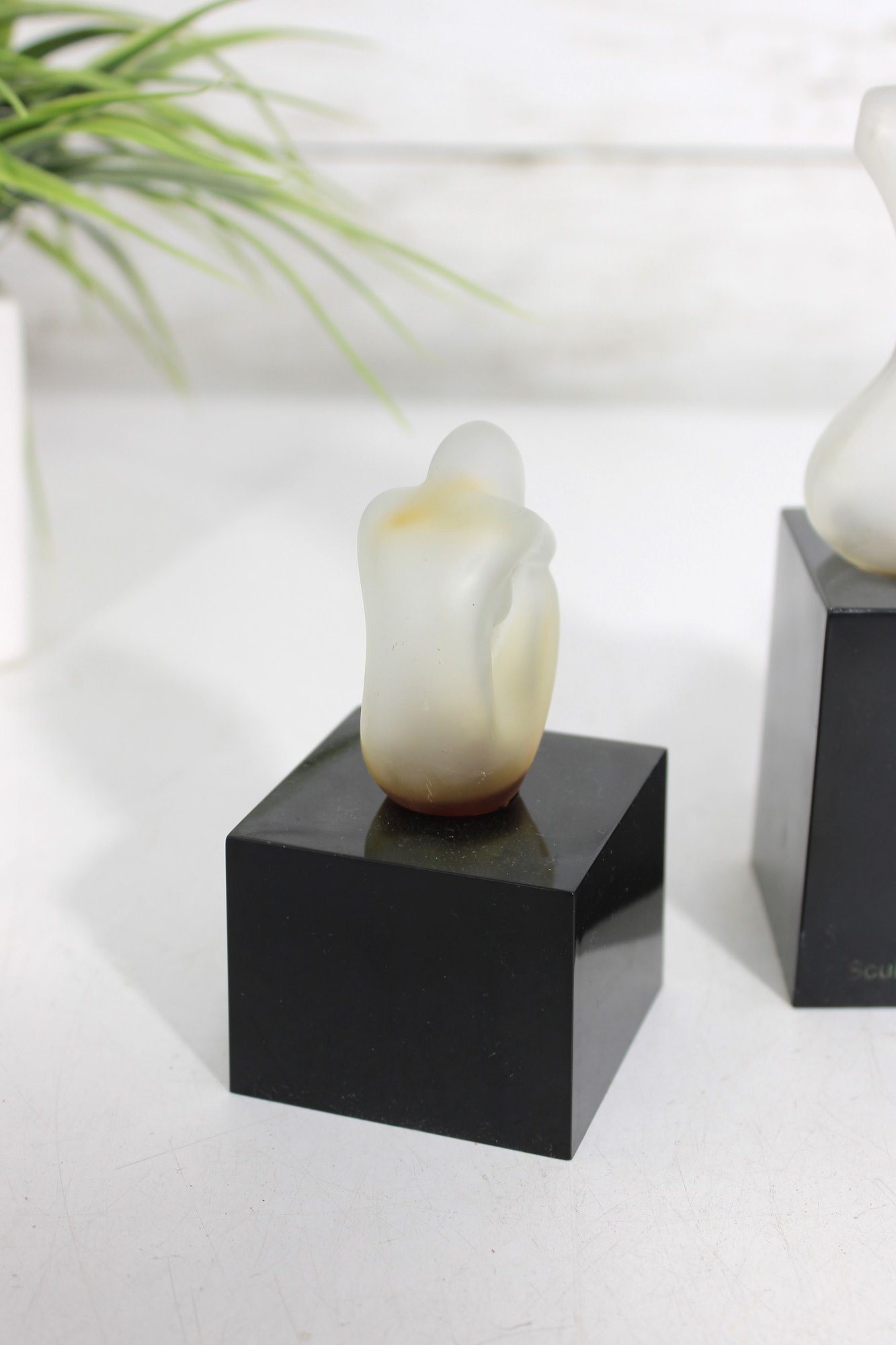 Unique vintage Sculptura by Jovan perfume bottle set featuring three stylized nude figurine forms mounted on black display bases. These artistic bottles double as sculptural décor, showcasing smooth frosted glass bodies with soft amber accents.