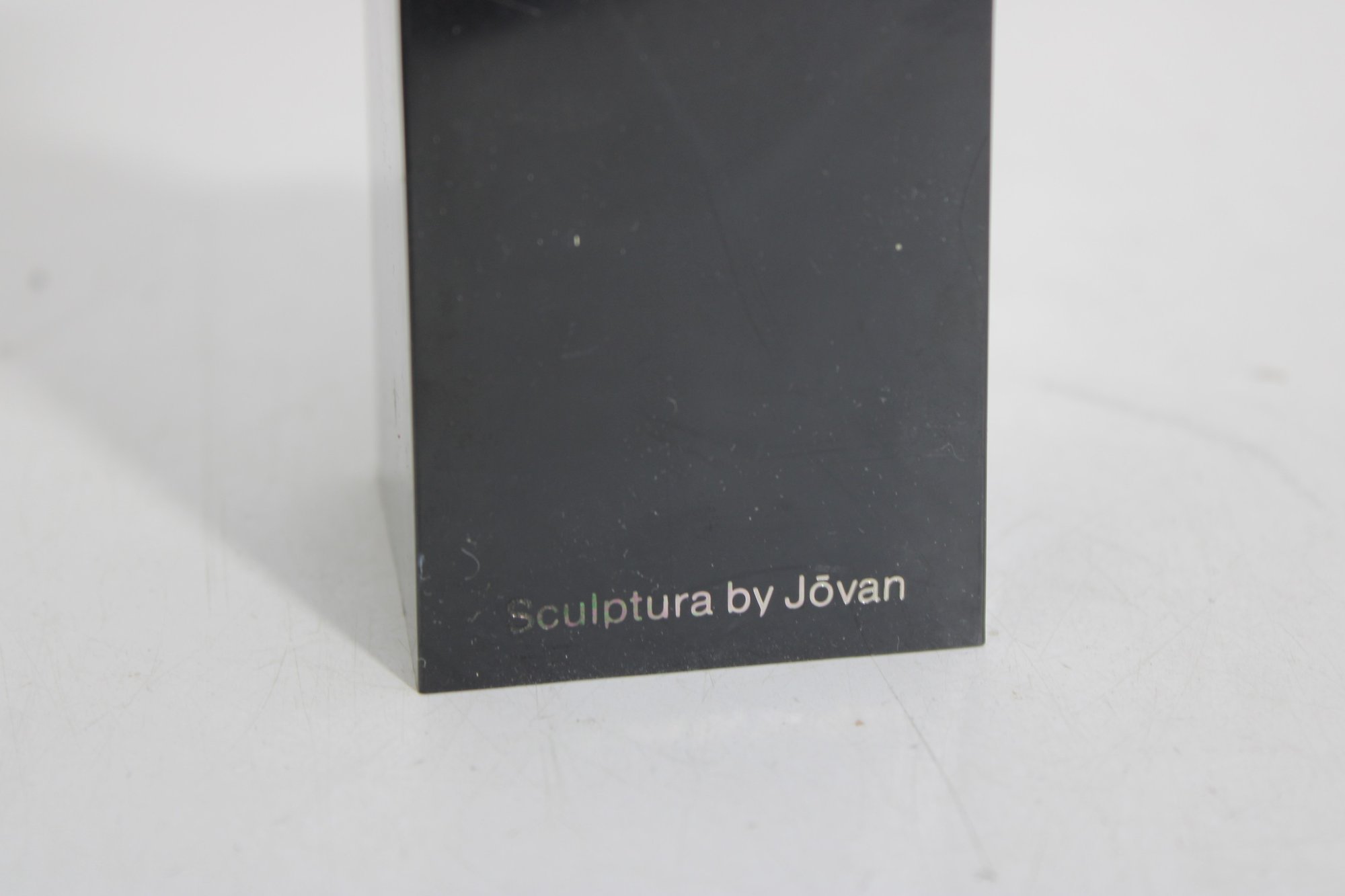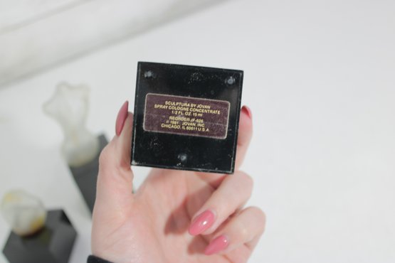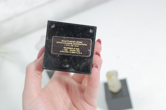 One bottle retains its spray cologne top, while the others are display forms. Each sits on its original black base labeled “Sculptura by Jovan.”