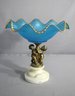 Three finely crafted brass cherubs are depicted in joyful abandon, their forms gilded with a warm patina that beautifully complements the celestial blue of the glass bowl they uplift. The compote bowl shimmers with a textural pattern, reminiscent of serene ocean waves, with an opulent gold-trimmed, wavy edge that catches the light with every turn.