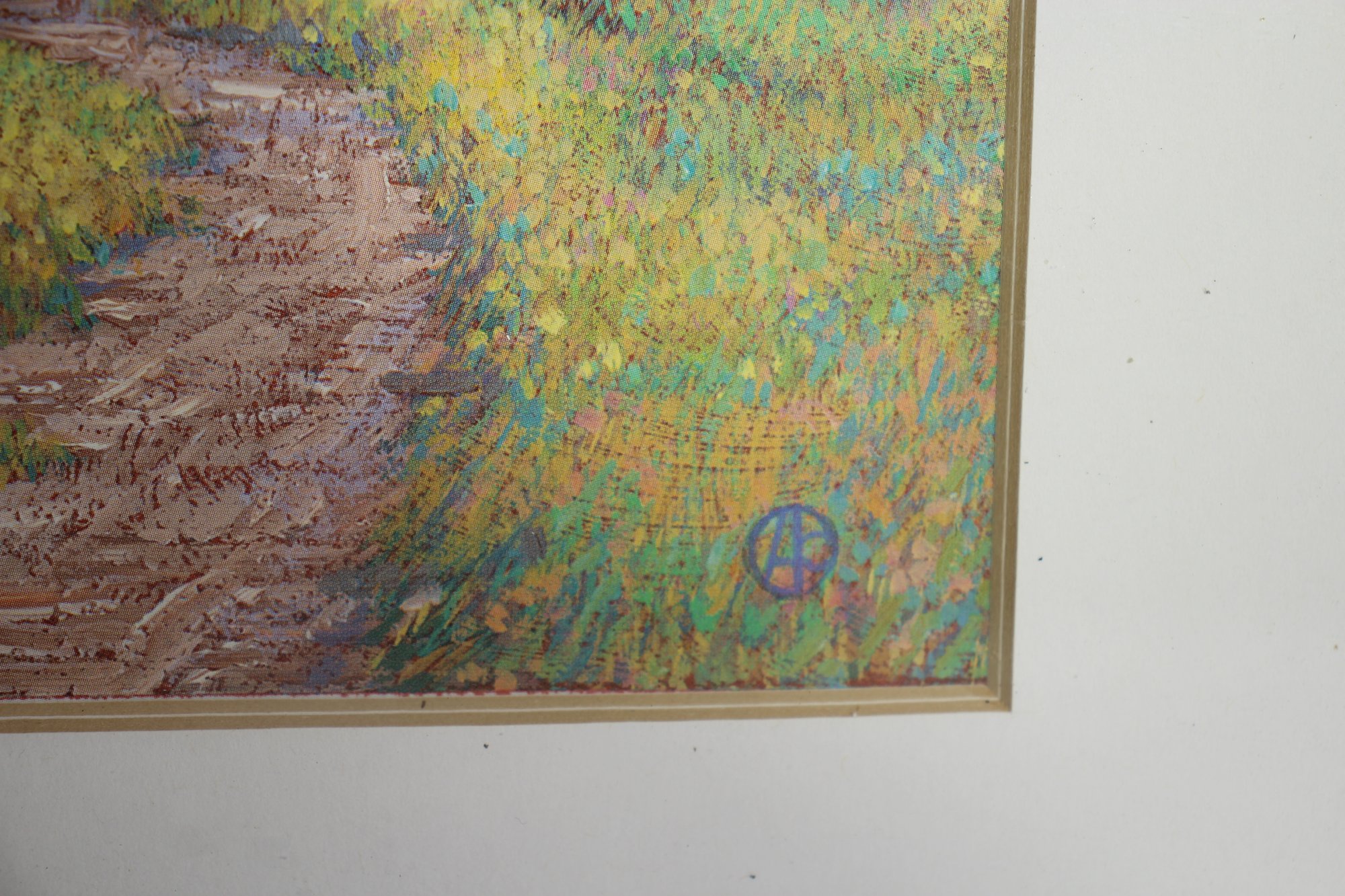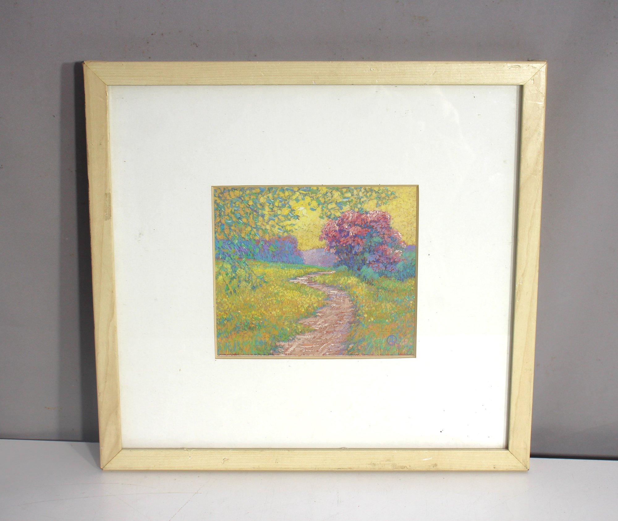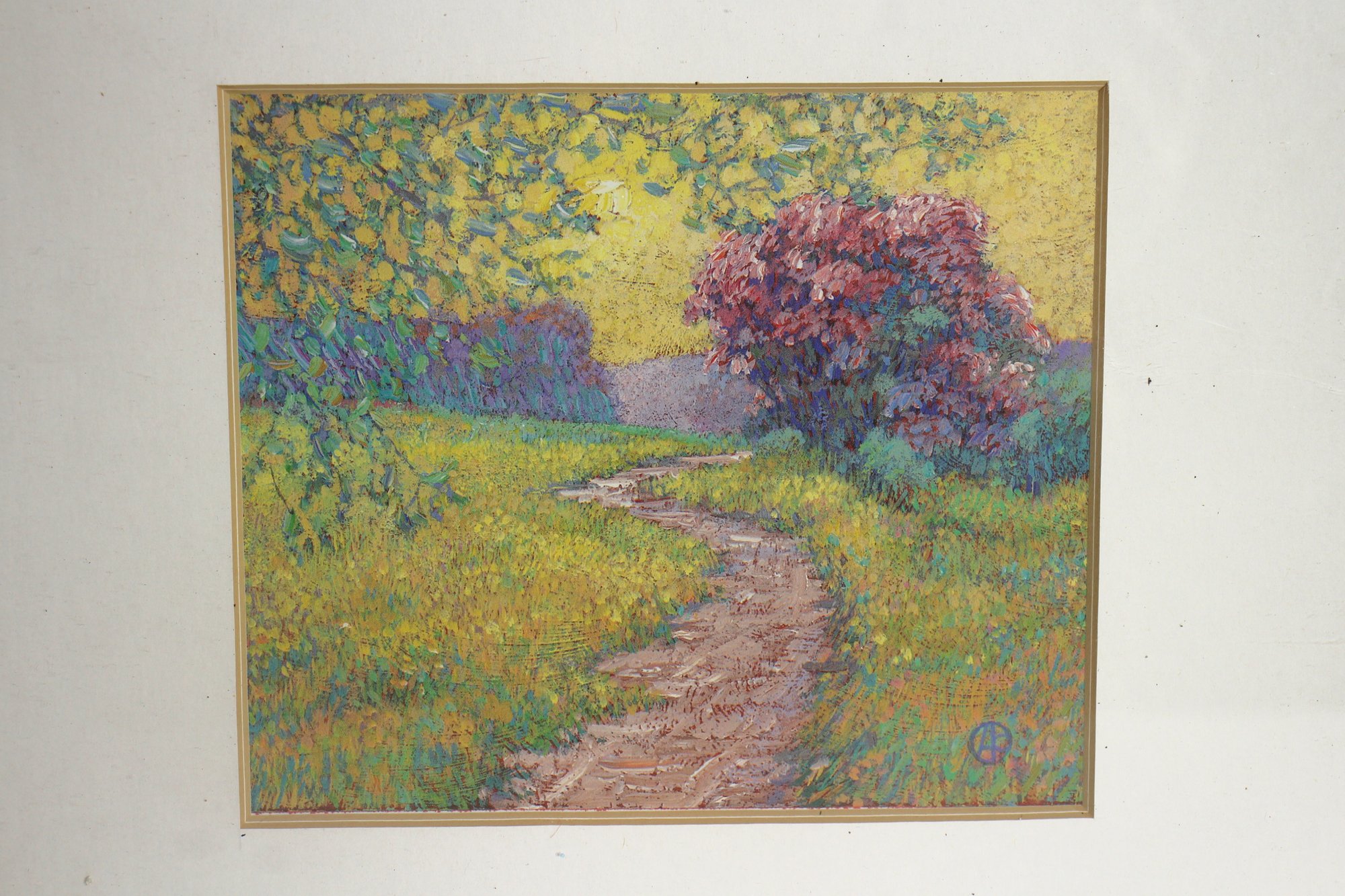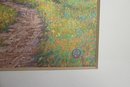 This beautifully detailed impressionist landscape painting captures a tranquil countryside pathway winding through a lush field, leading toward a vibrant flowering tree. The rich, textured strokes and harmonious blend of colors create a dreamlike atmosphere, reminiscent of classic impressionist techniques. The artwork is framed in a simple off-white wooden frame with a large mat border, emphasizing its delicate beauty. A subtle artist's signature or mark is visible in the lower corner.