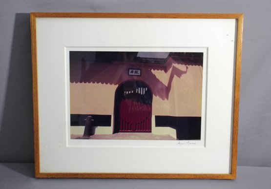 "Serene Threshold" is a captivating photographic print by Helen Marcey, renowned for her meticulous compositions and vibrant color use. This particular piece, pencil signed by the artist, portrays the striking entrance of a traditional building, marked by a vibrant red door and ornate architectural details. The composition masterfully captures the interplay of shadows and sunlight, highlighting the rich textures and colors of the walls and the intricately carved roof.