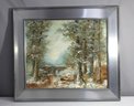 This beautiful winter landscape on canvas captures a serene forest scene with a stone bridge over a gently flowing stream. The artist's use of earthy tones and soft blues evokes the quiet, reflective beauty of a snowy woodland. The textured brushwork brings depth and movement to the trees and water, making the viewer feel immersed in the peaceful atmosphere.