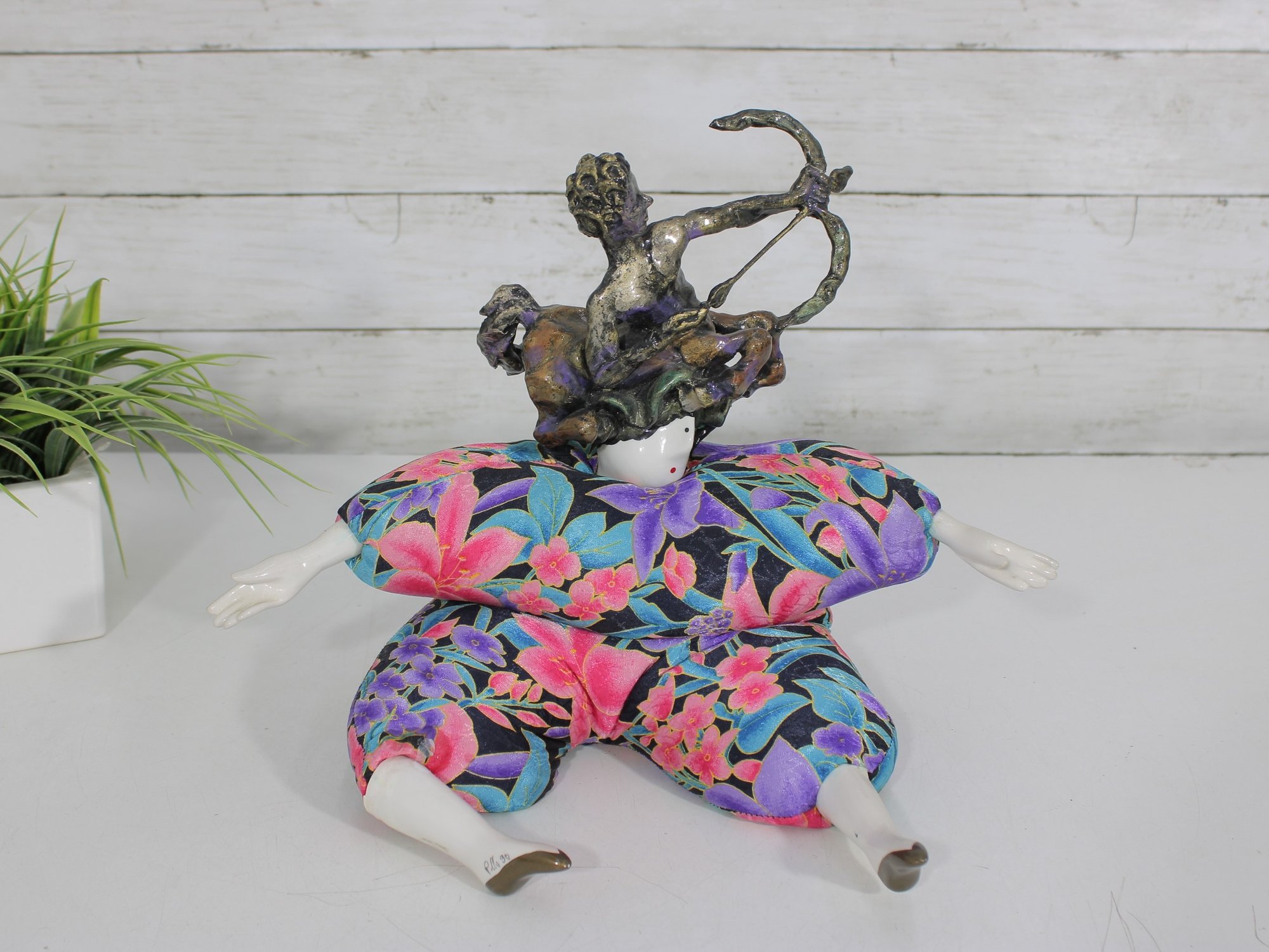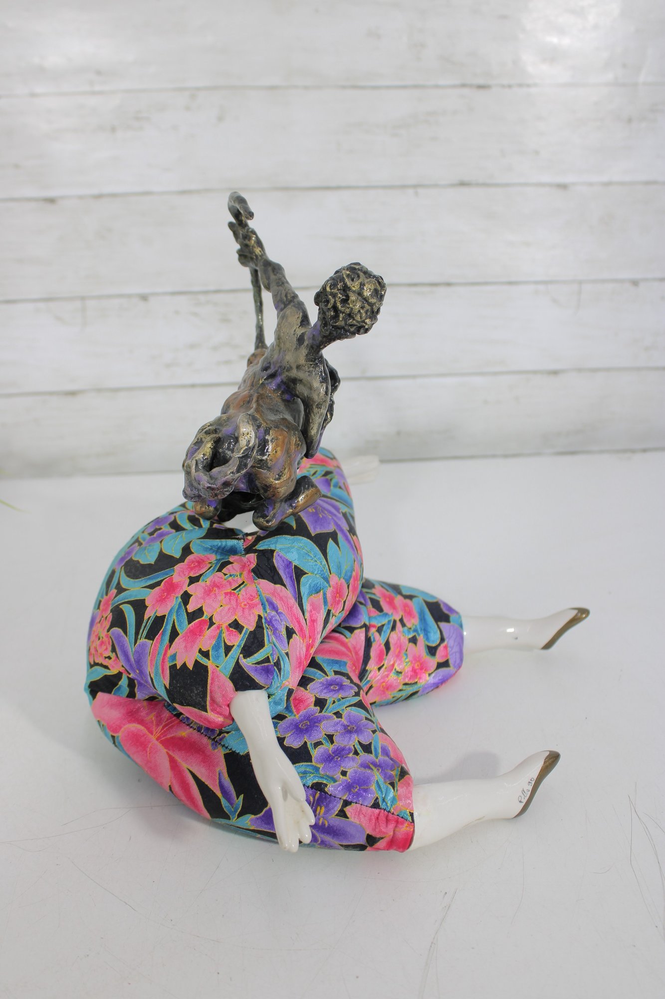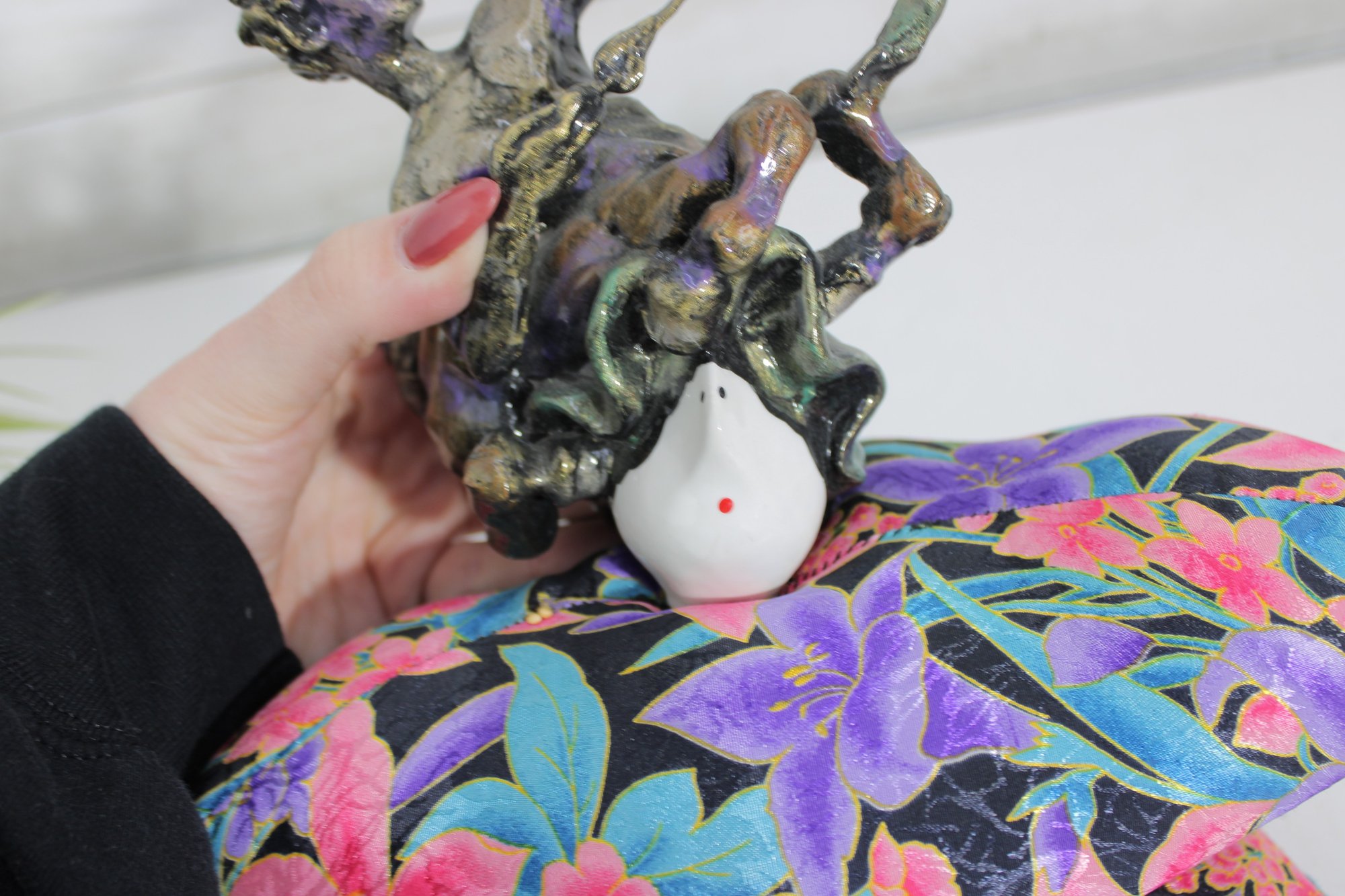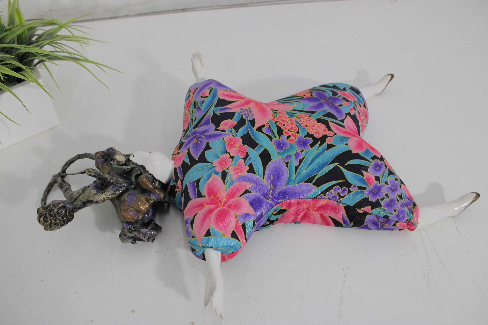 The contrast between the dark, textured sculptural head and the colorful, padded fabric form creates a powerful visual statement. With outstretched limbs and a reclining pose, this doll functions as a true art object rather than a traditional toy—ideal for collectors of contemporary art dolls, mixed-media sculpture, or avant-garde décor.