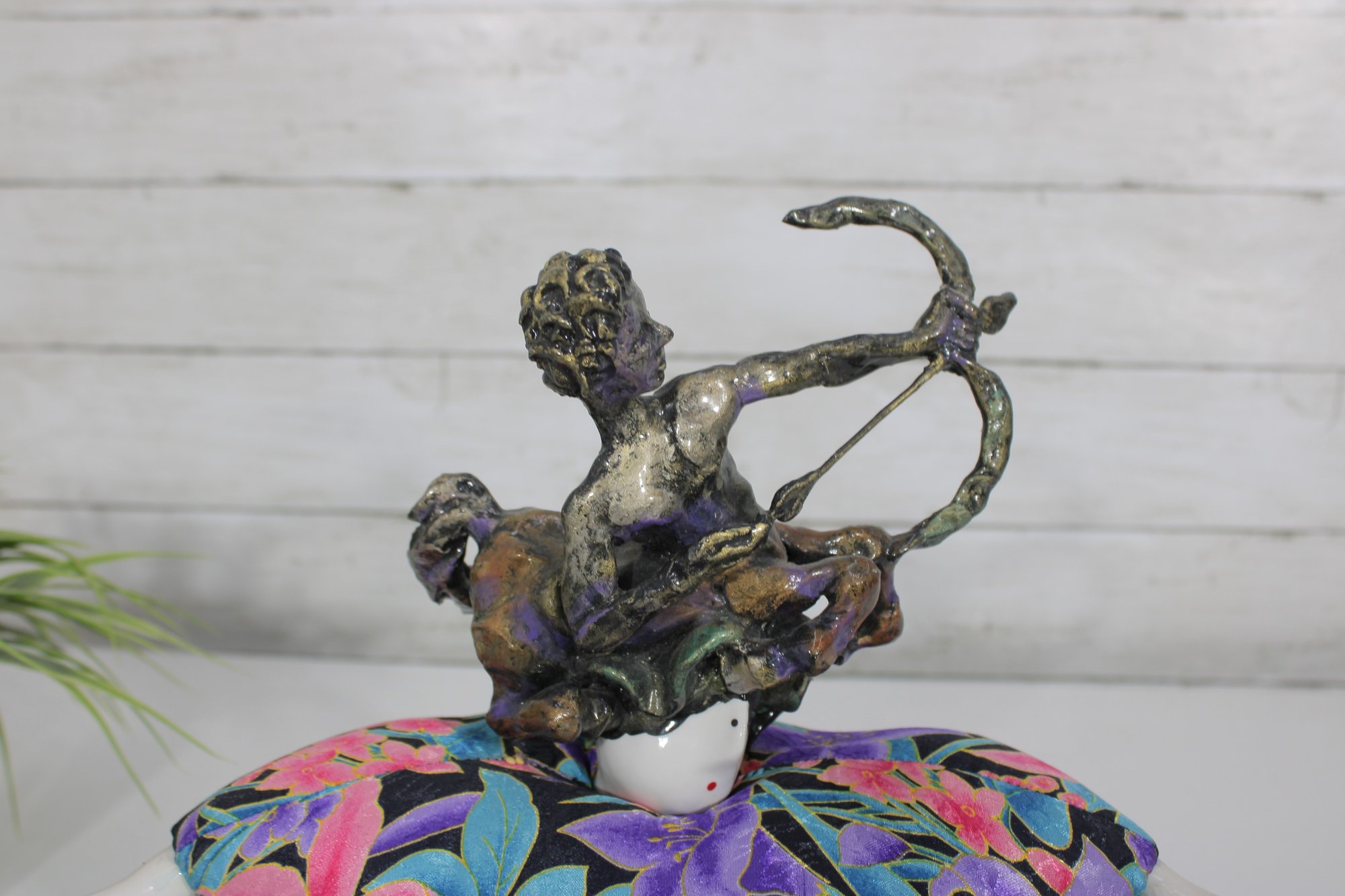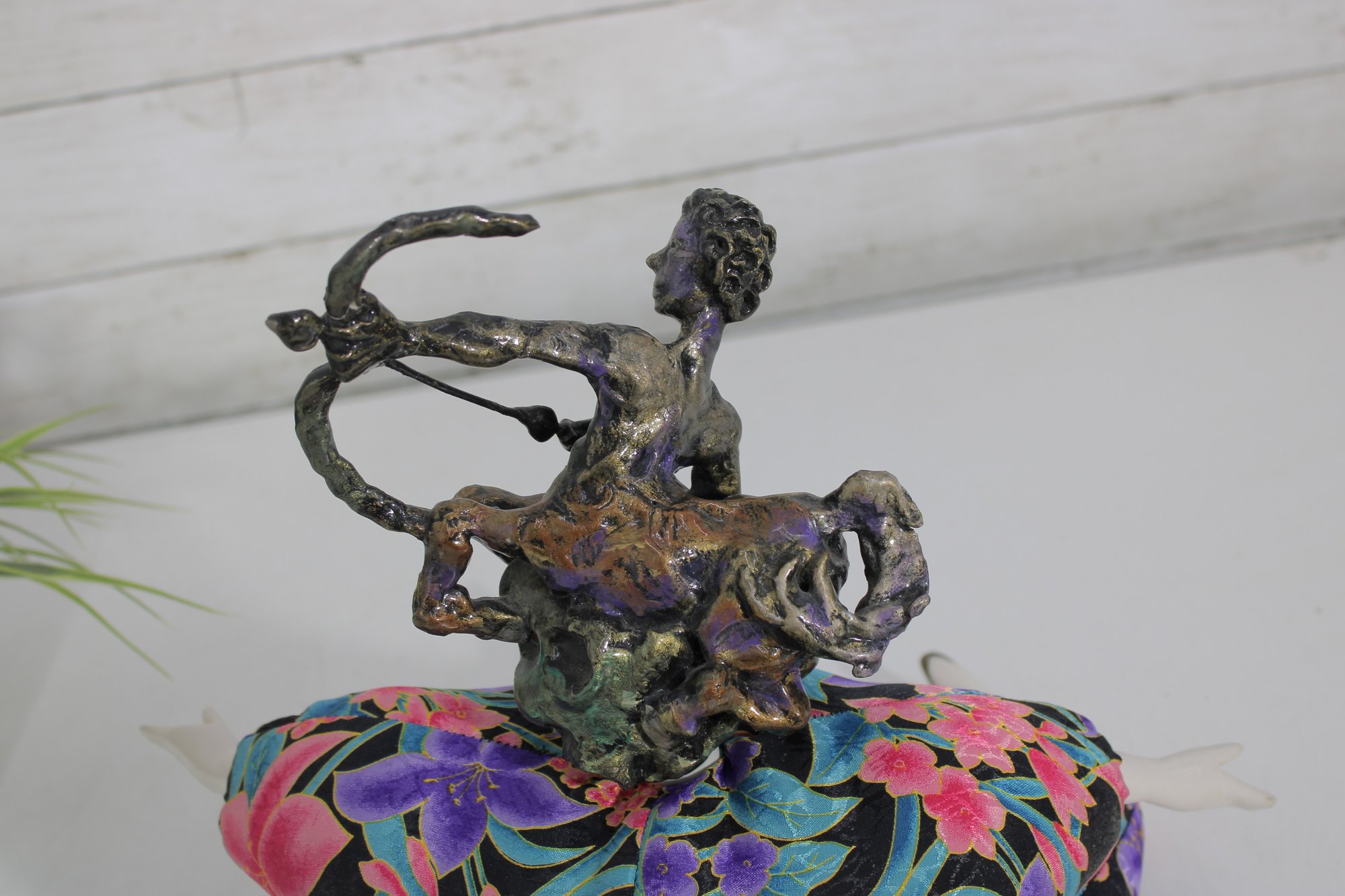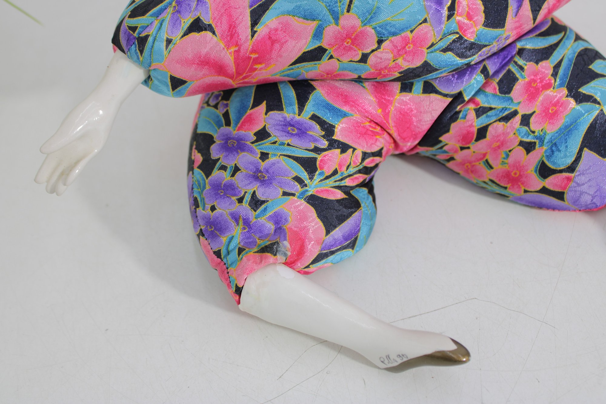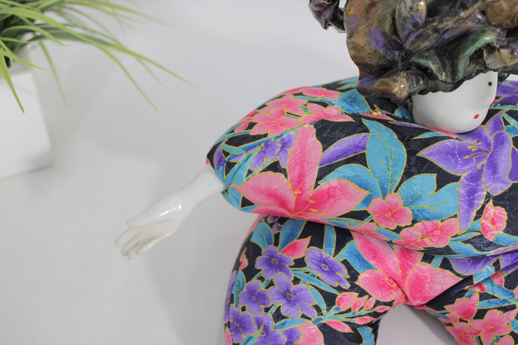 The contrast between the dark, textured sculptural head and the colorful, padded fabric form creates a powerful visual statement. With outstretched limbs and a reclining pose, this doll functions as a true art object rather than a traditional toy—ideal for collectors of contemporary art dolls, mixed-media sculpture, or avant-garde décor.
