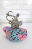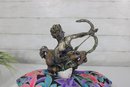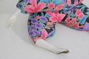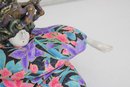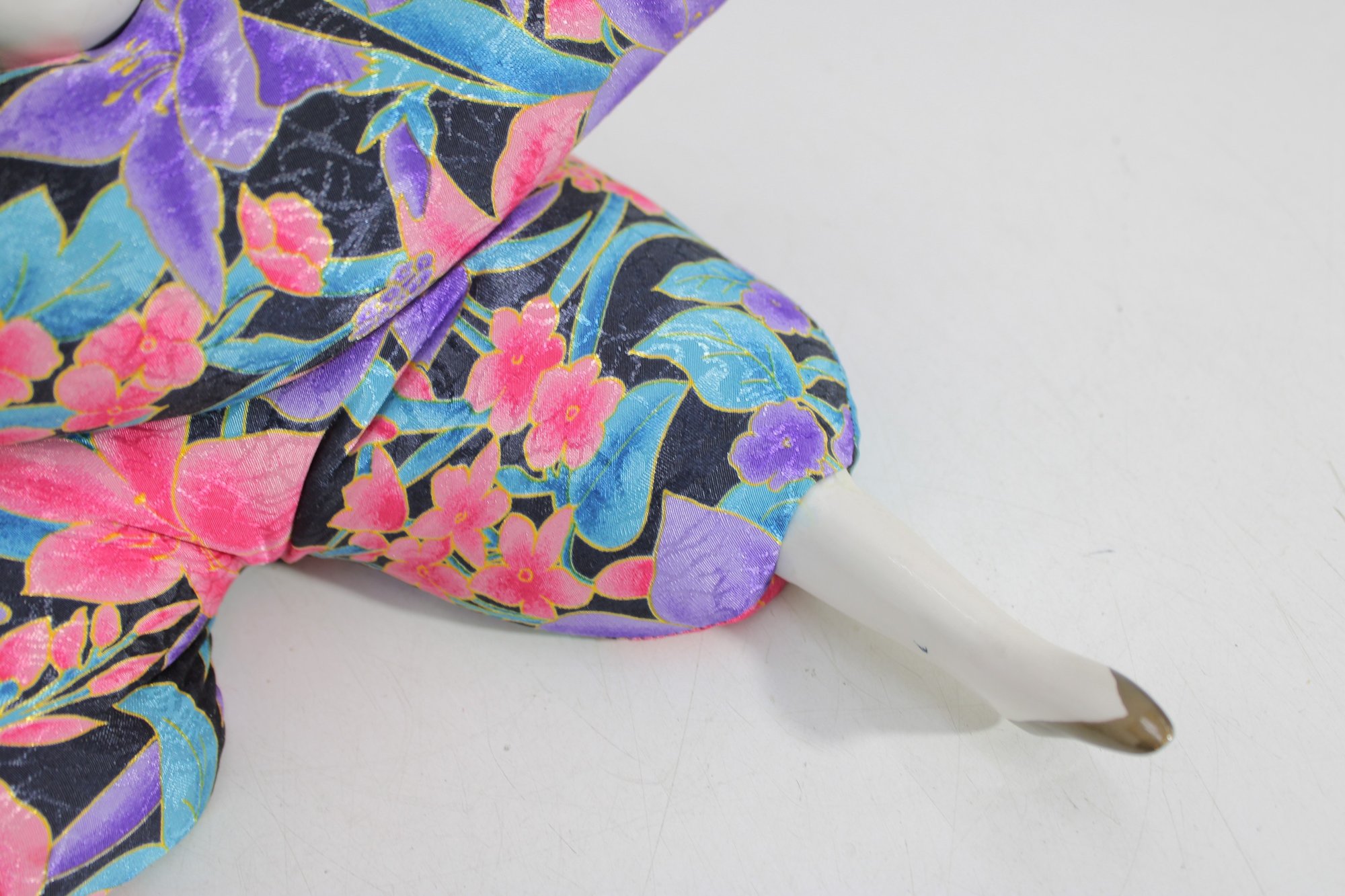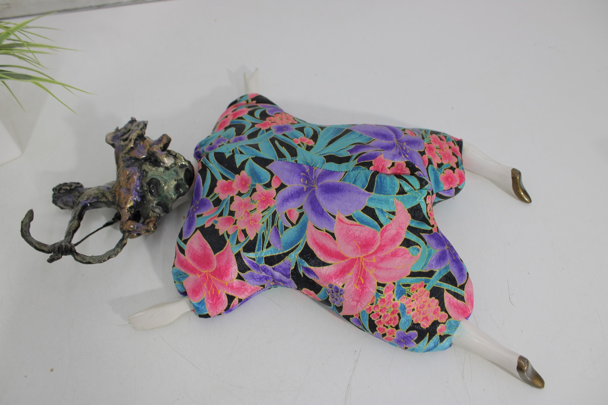 Unique and expressive art doll by Serge Millet, featuring a dramatic mixed-media sculptural head paired with a soft, floral fabric body. This striking piece blends fine art and textile design, showcasing an abstract, hand-sculpted figure with flowing, organic form and rich patina, mounted atop a vividly patterned body in bold tropical florals.