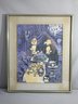 Rendered in a bold color palette dominated by purples and blues, this piece is filled with expressive details and playful elements that create a lively narrative. The characters, dressed in formal attire and engaging in dinner party antics, add a surreal yet familiar touch to the composition.