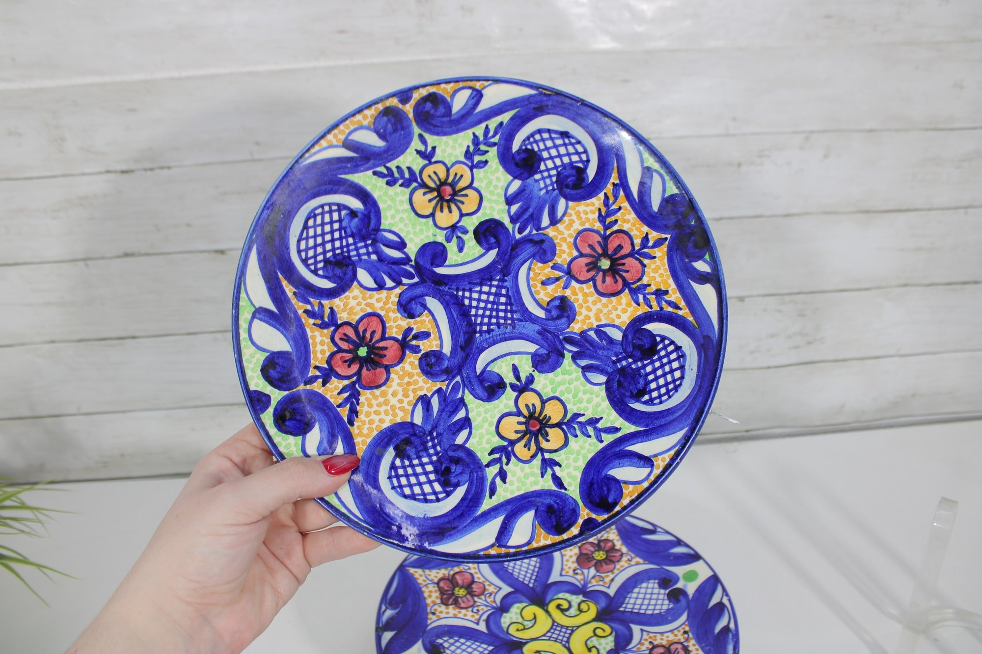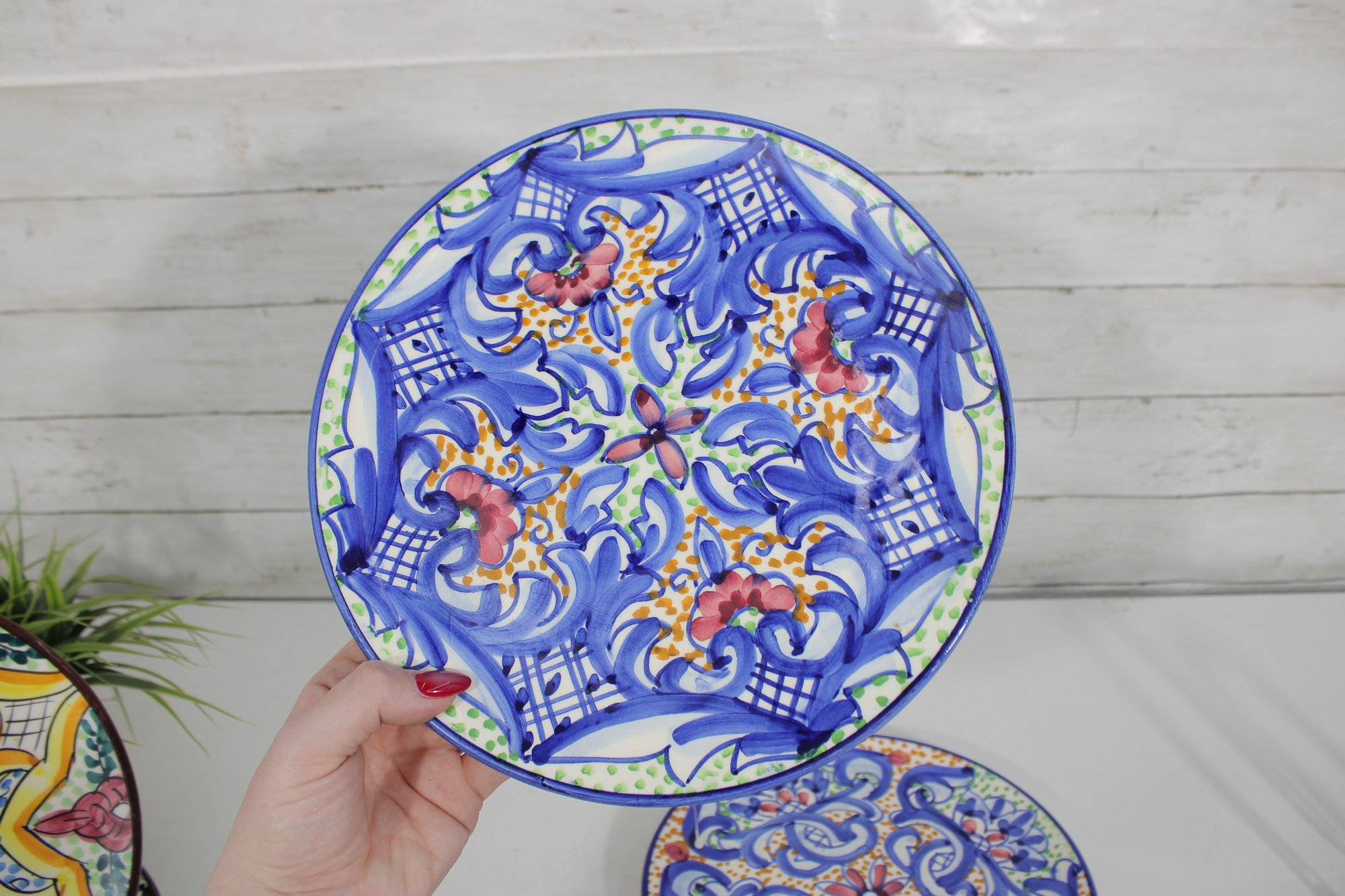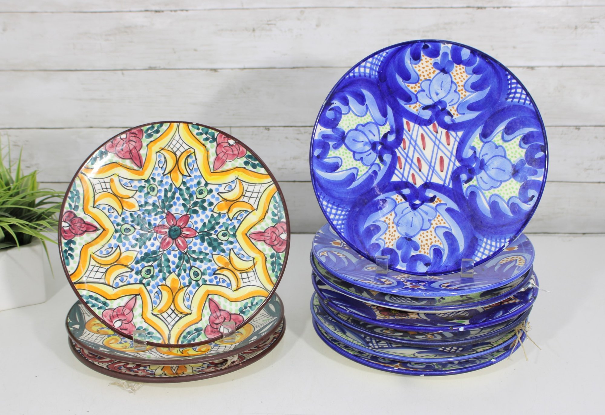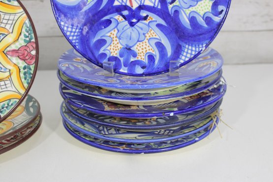 This set includes 8 plates, each measuring approximately 10” in diameter, ideal for wall display, shelf décor, or accenting a gallery wall. The detailed hand-painted motifs give each piece a unique, artisanal character.