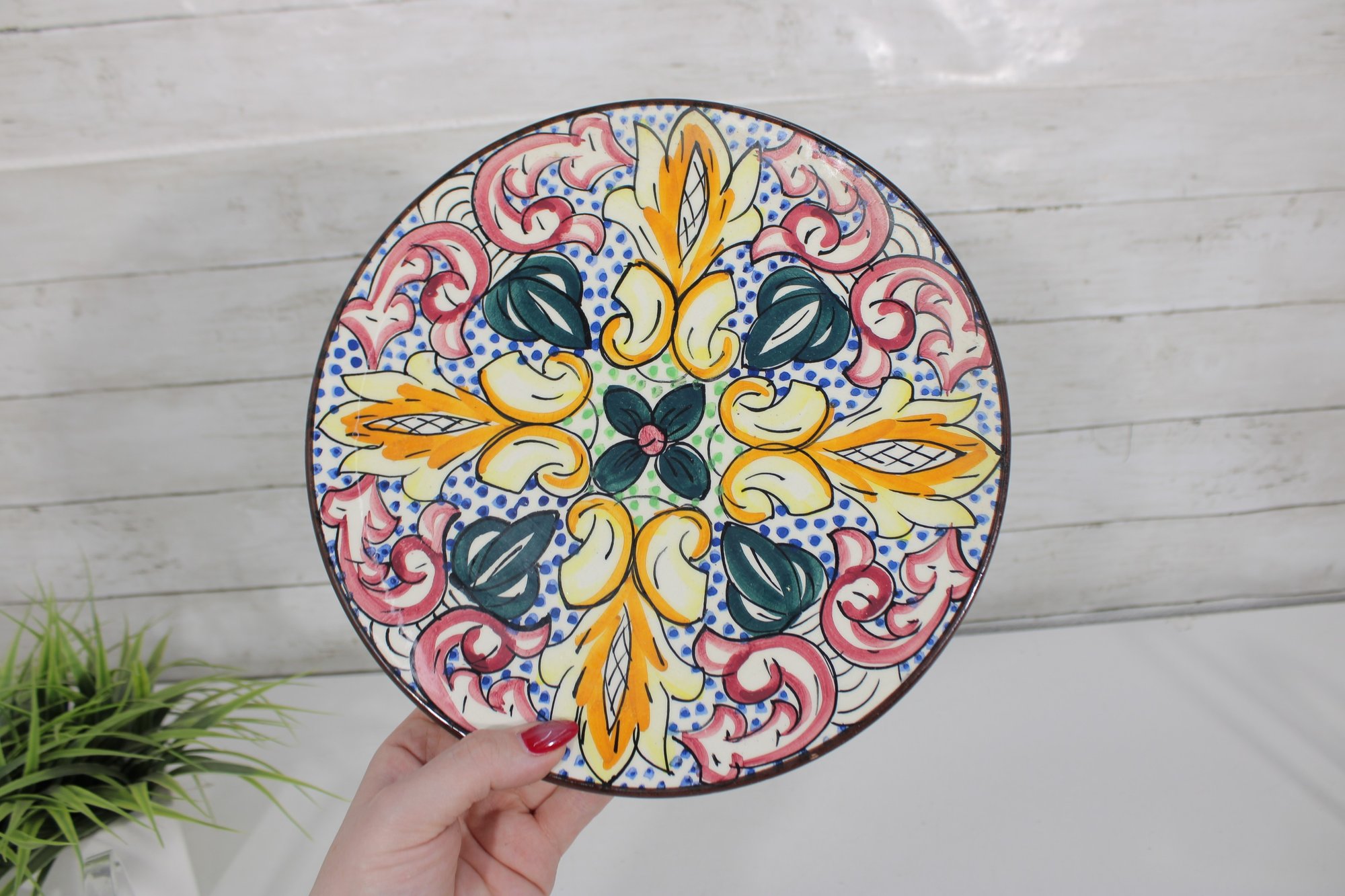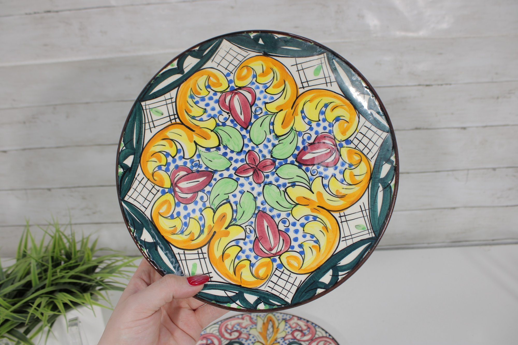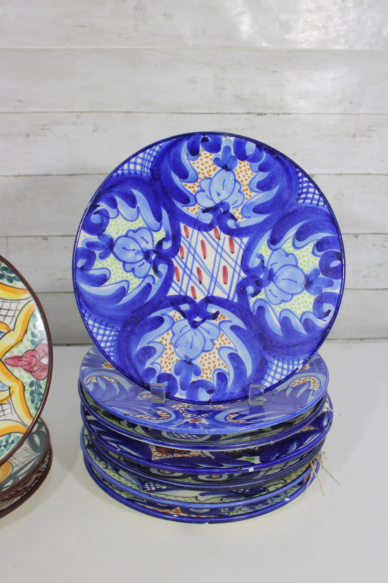 This set includes 8 plates, each measuring approximately 10” in diameter, ideal for wall display, shelf décor, or accenting a gallery wall. The detailed hand-painted motifs give each piece a unique, artisanal character.