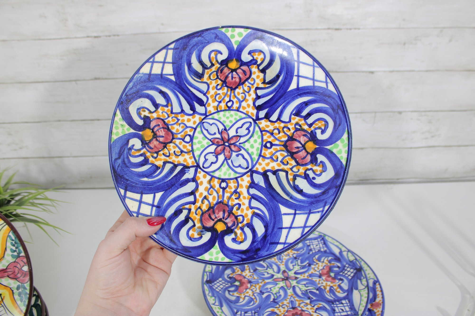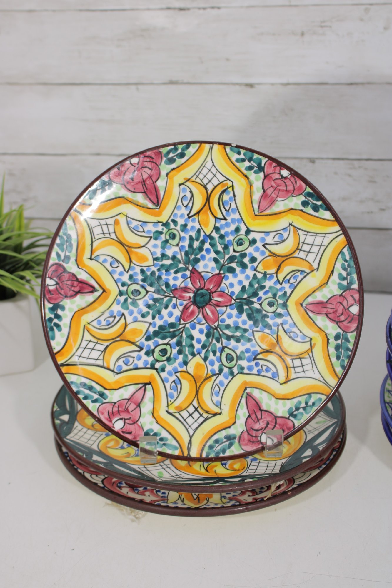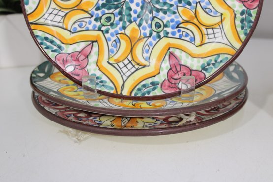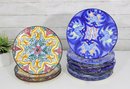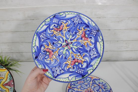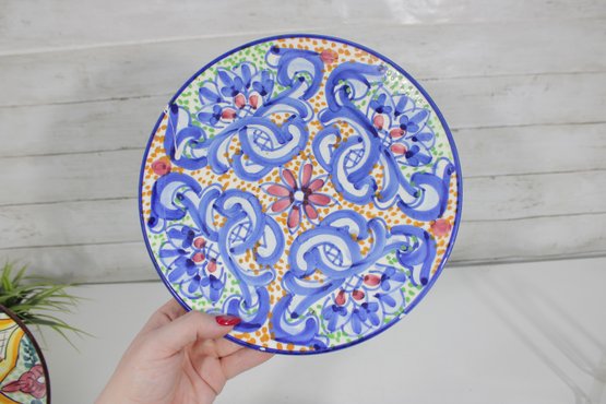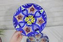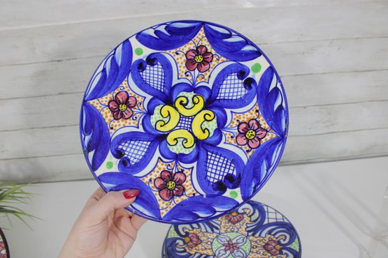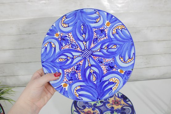 Beautiful set of Talavera-style hand-painted decorative plates, featuring bold, colorful patterns inspired by traditional Mexican folk art. Each plate showcases intricate geometric and floral designs in rich hues of blue, yellow, red, and green, making them eye-catching statement pieces for any space.