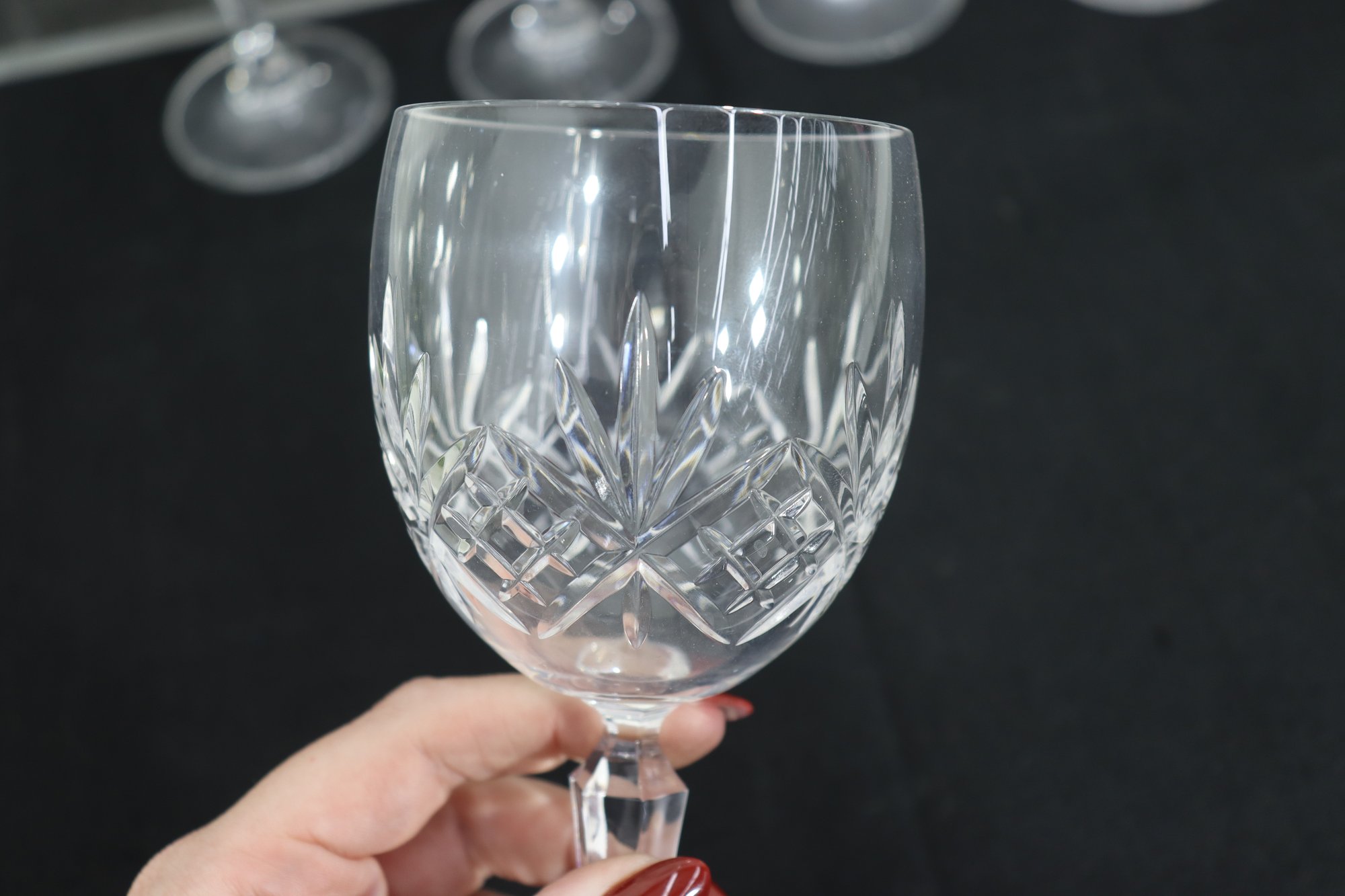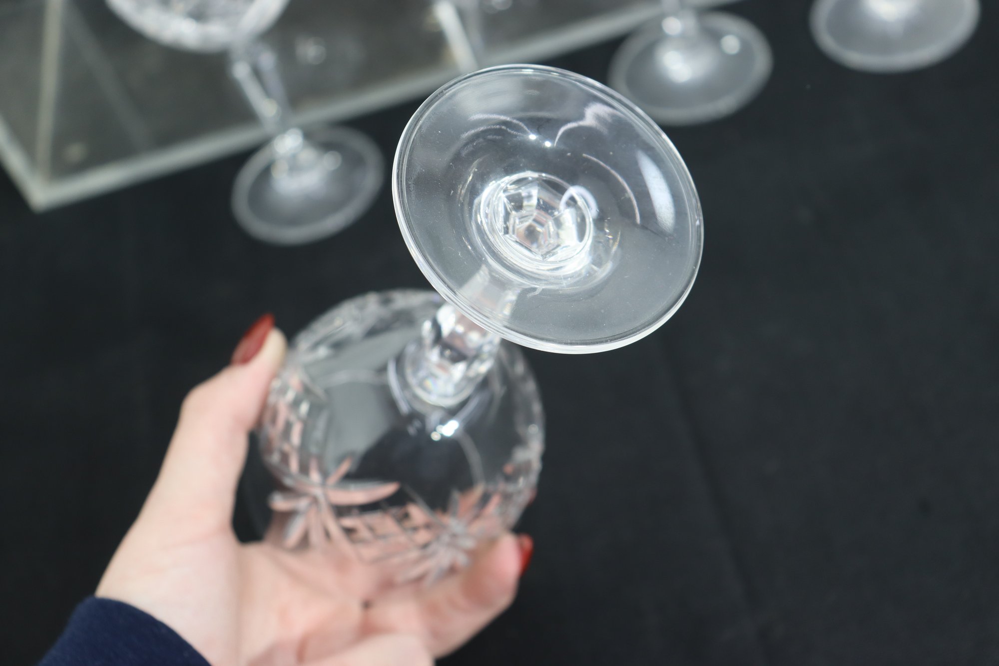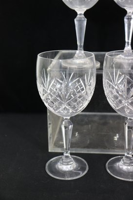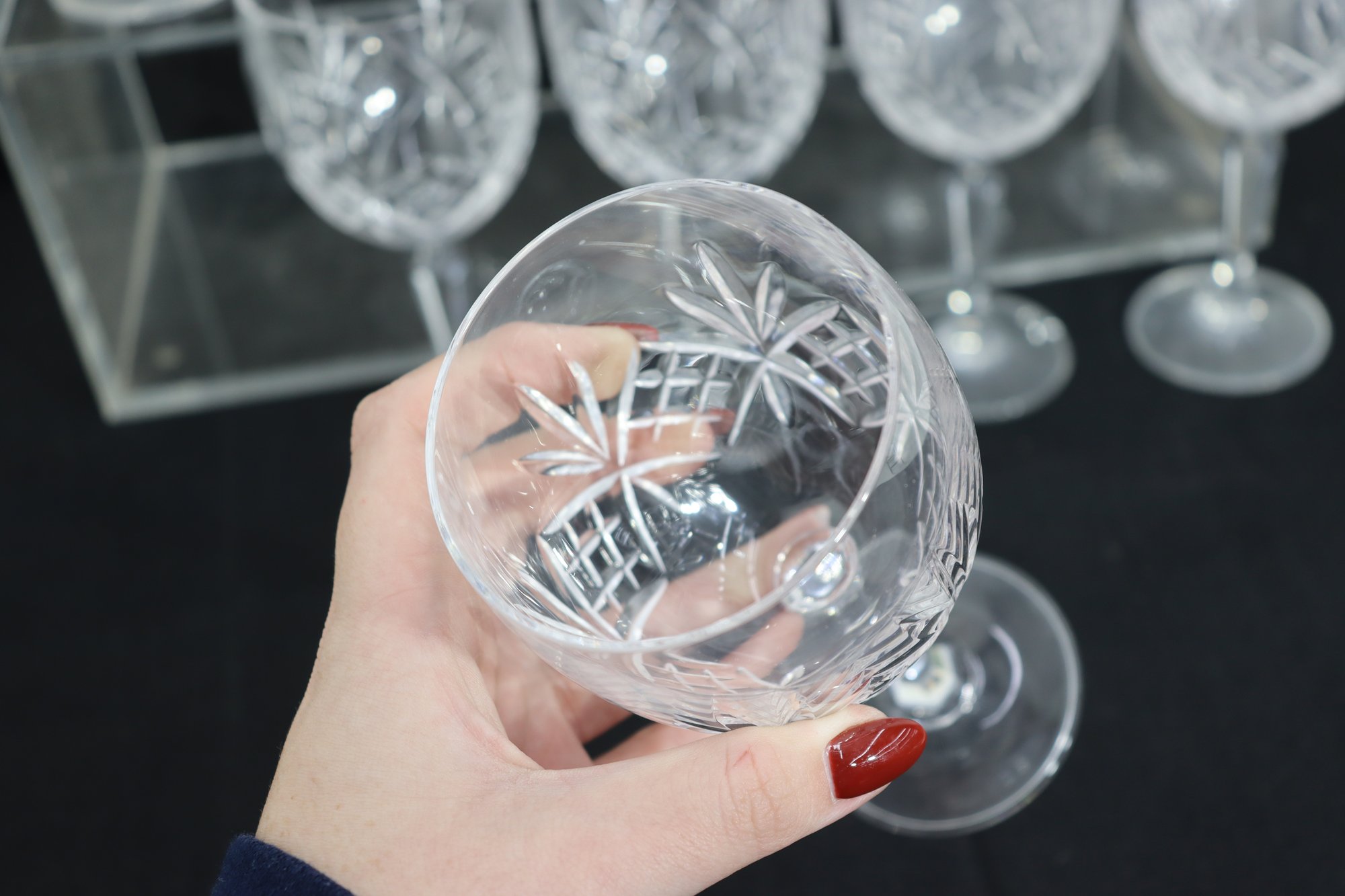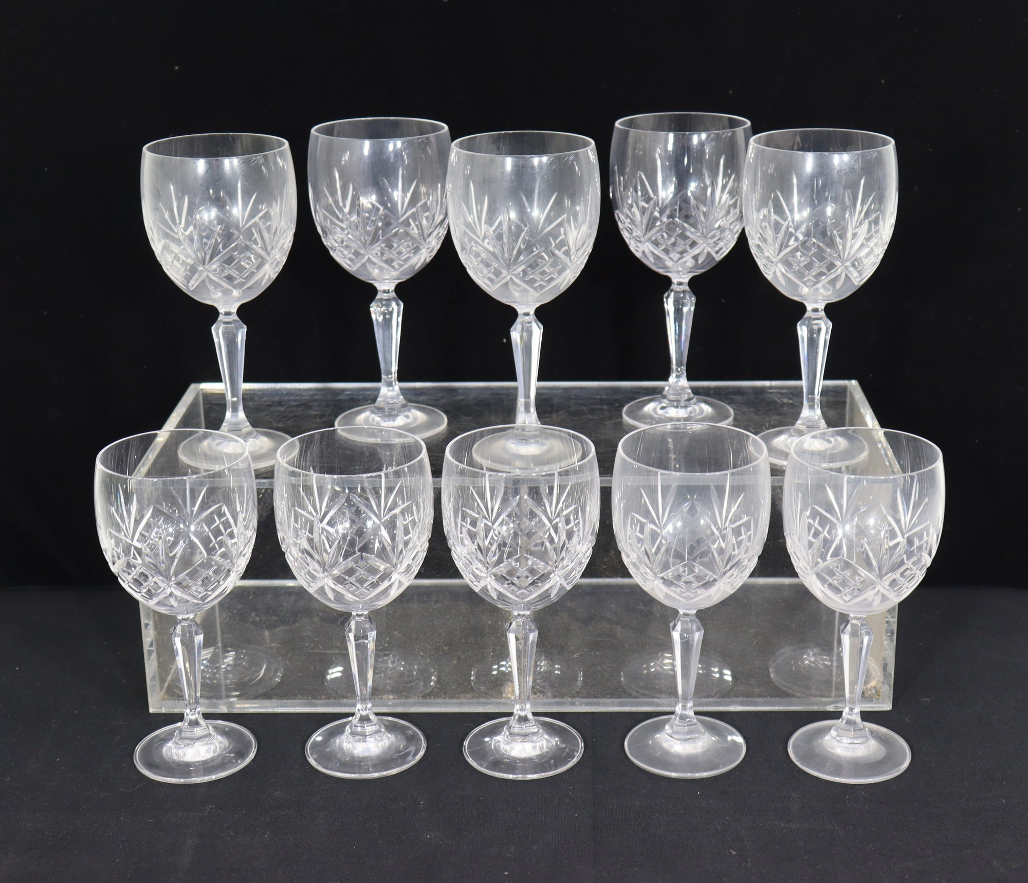 Beautiful set of 10 vintage cut crystal wine goblets featuring a classic diamond / crosshatch cut design. Each goblet measures approx. 7” tall with a clear stem and rounded bowl.