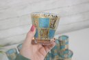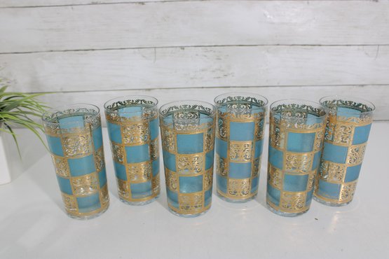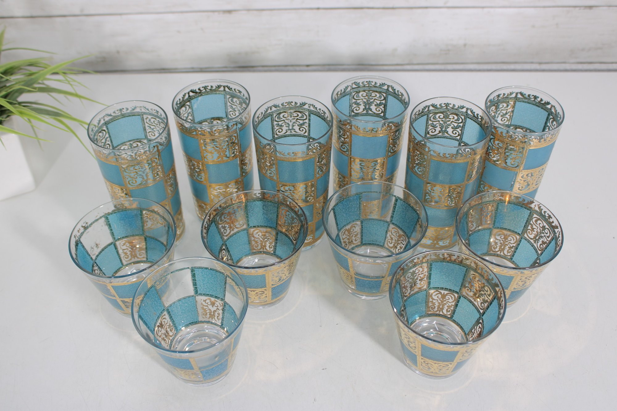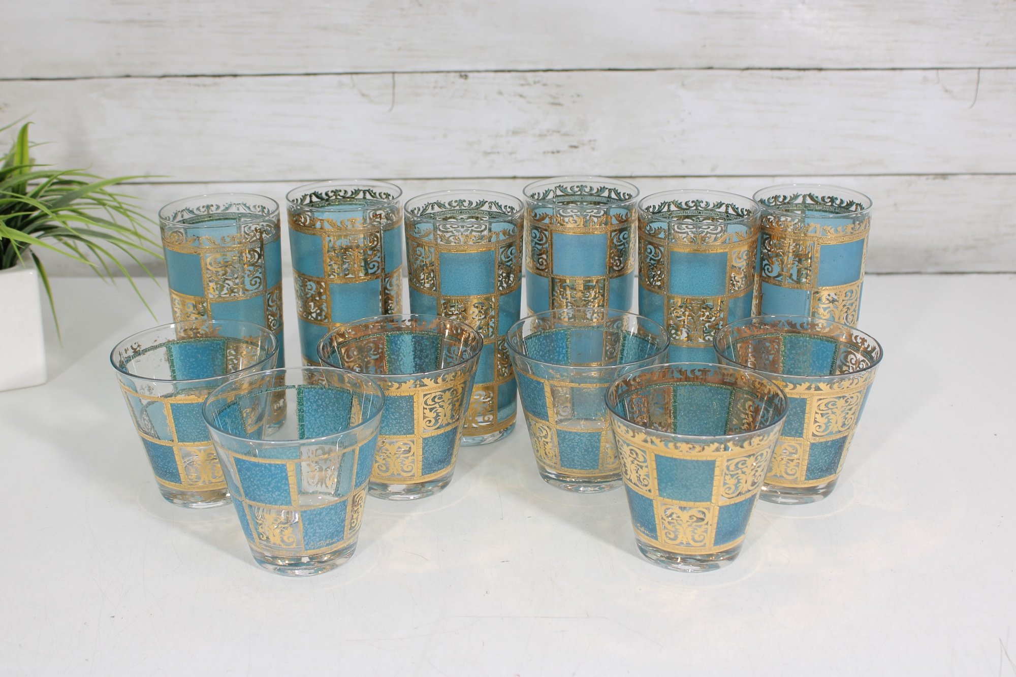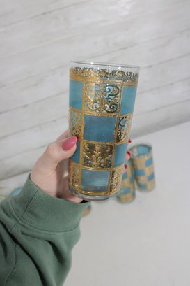 The set includes six tall highball glasses (approx. 5.5" tall) and six matching old fashioned/lowball glasses (approx. 3.5" tall), making it perfect for a complete bar setup. The rich gold decoration paired with the textured turquoise background creates a striking visual effect.