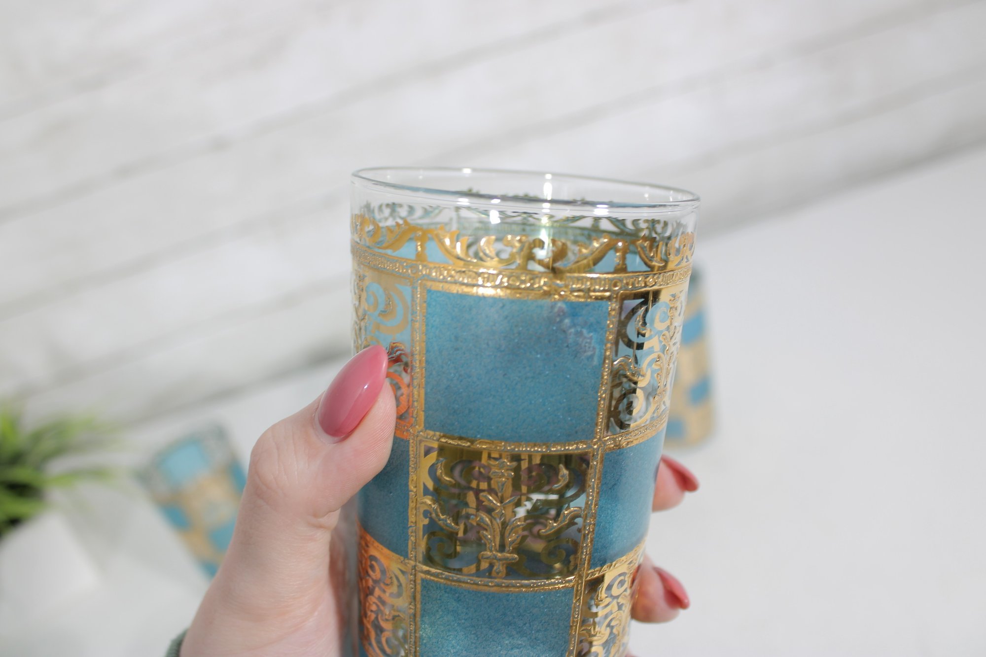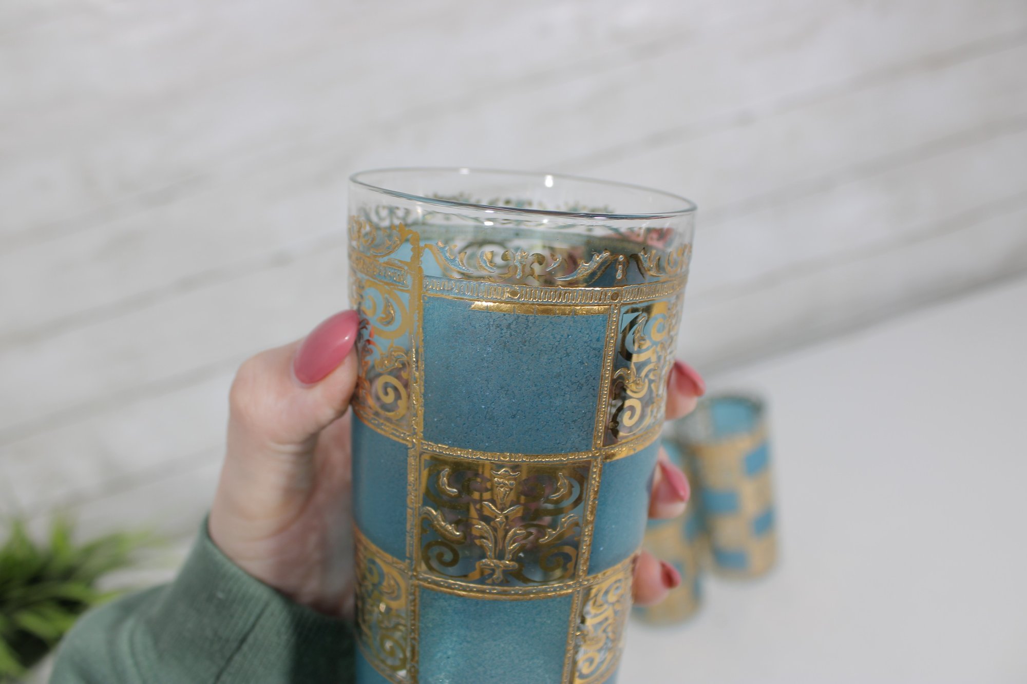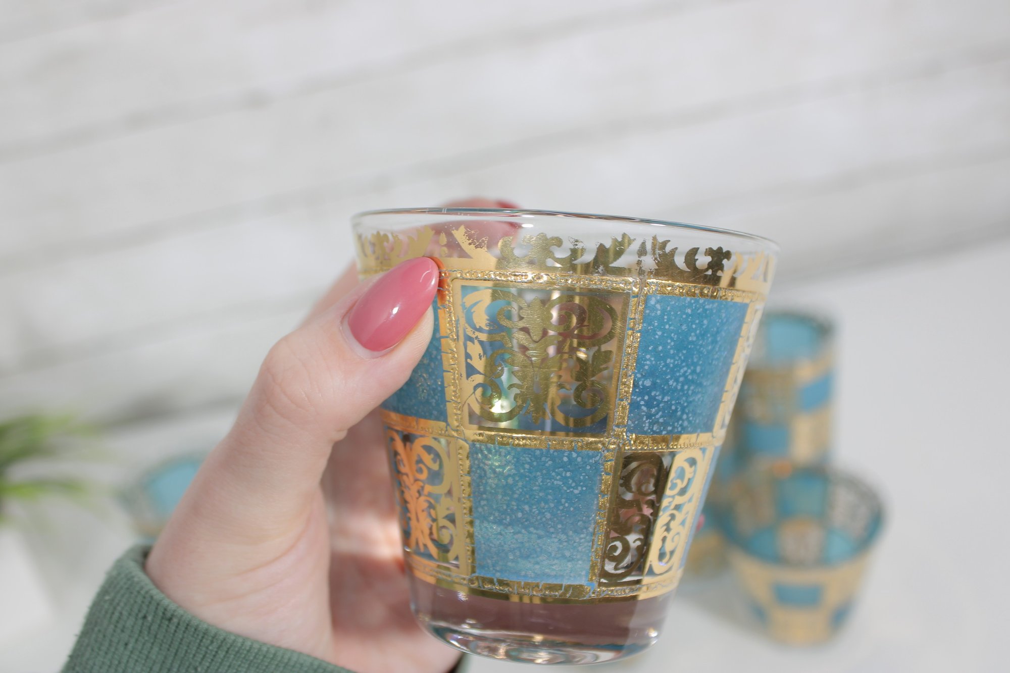 The set includes six tall highball glasses (approx. 5.5" tall) and six matching old fashioned/lowball glasses (approx. 3.5" tall), making it perfect for a complete bar setup. The rich gold decoration paired with the textured turquoise background creates a striking visual effect.