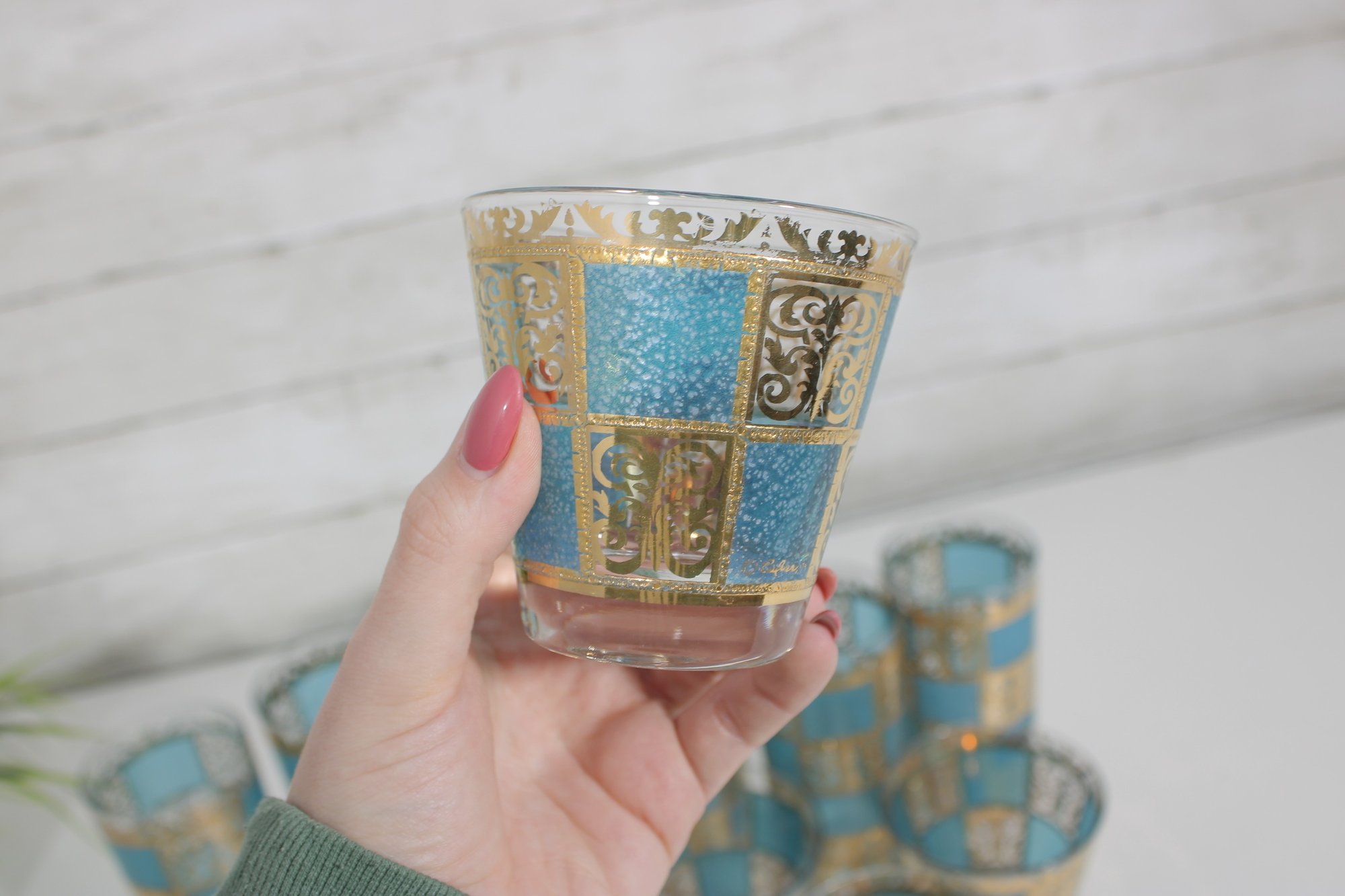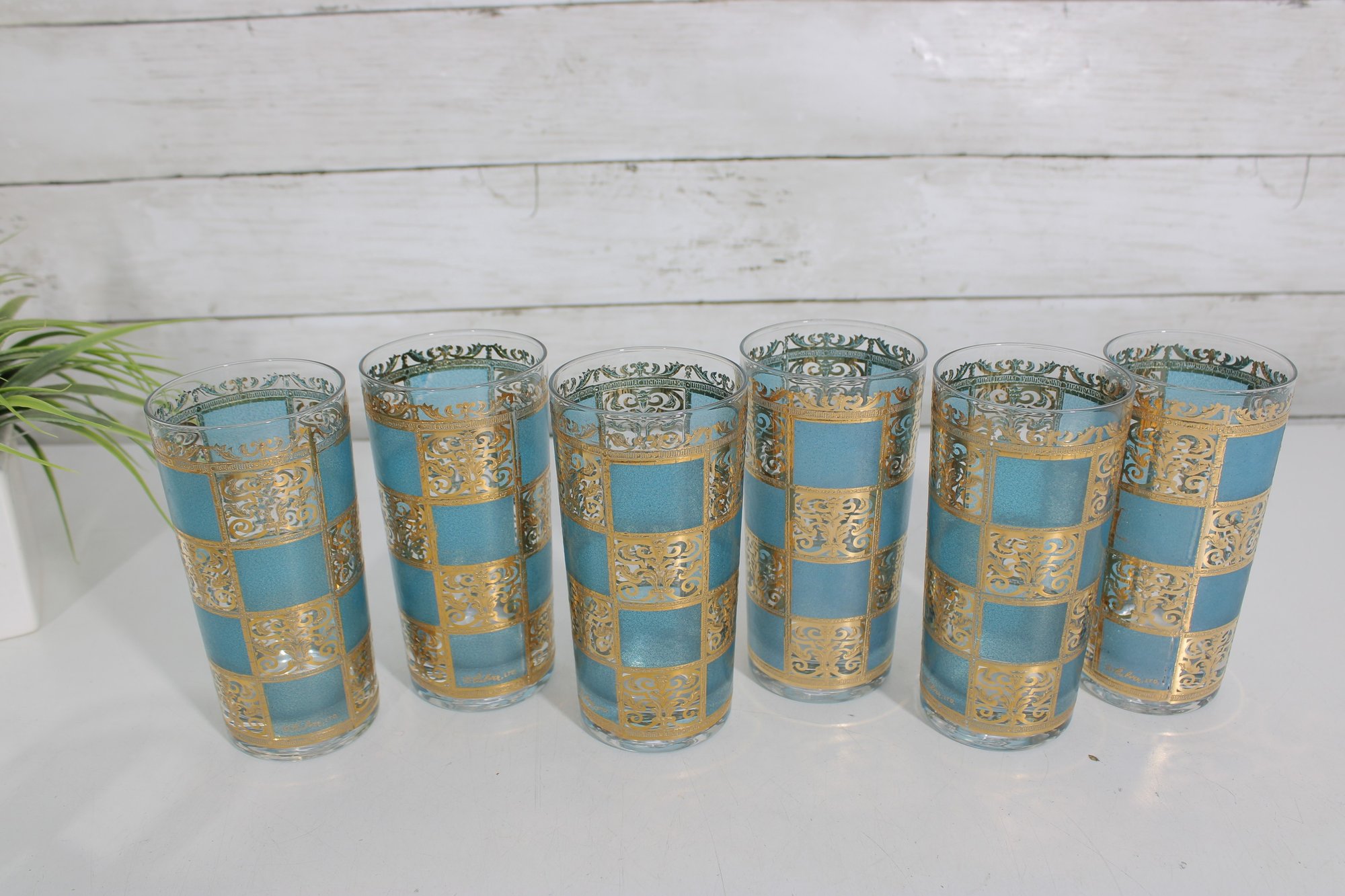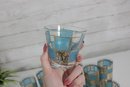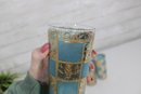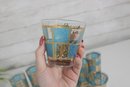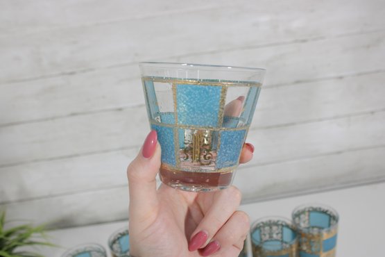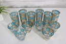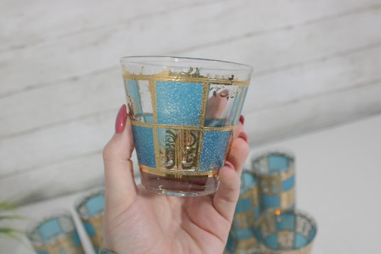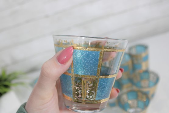 Stunning vintage Culver barware set in the highly sought-after “Carnival” pattern, featuring vibrant turquoise panels with intricate gold overlay detailing. This mid-century modern design is bold, glamorous, and instantly recognizable.