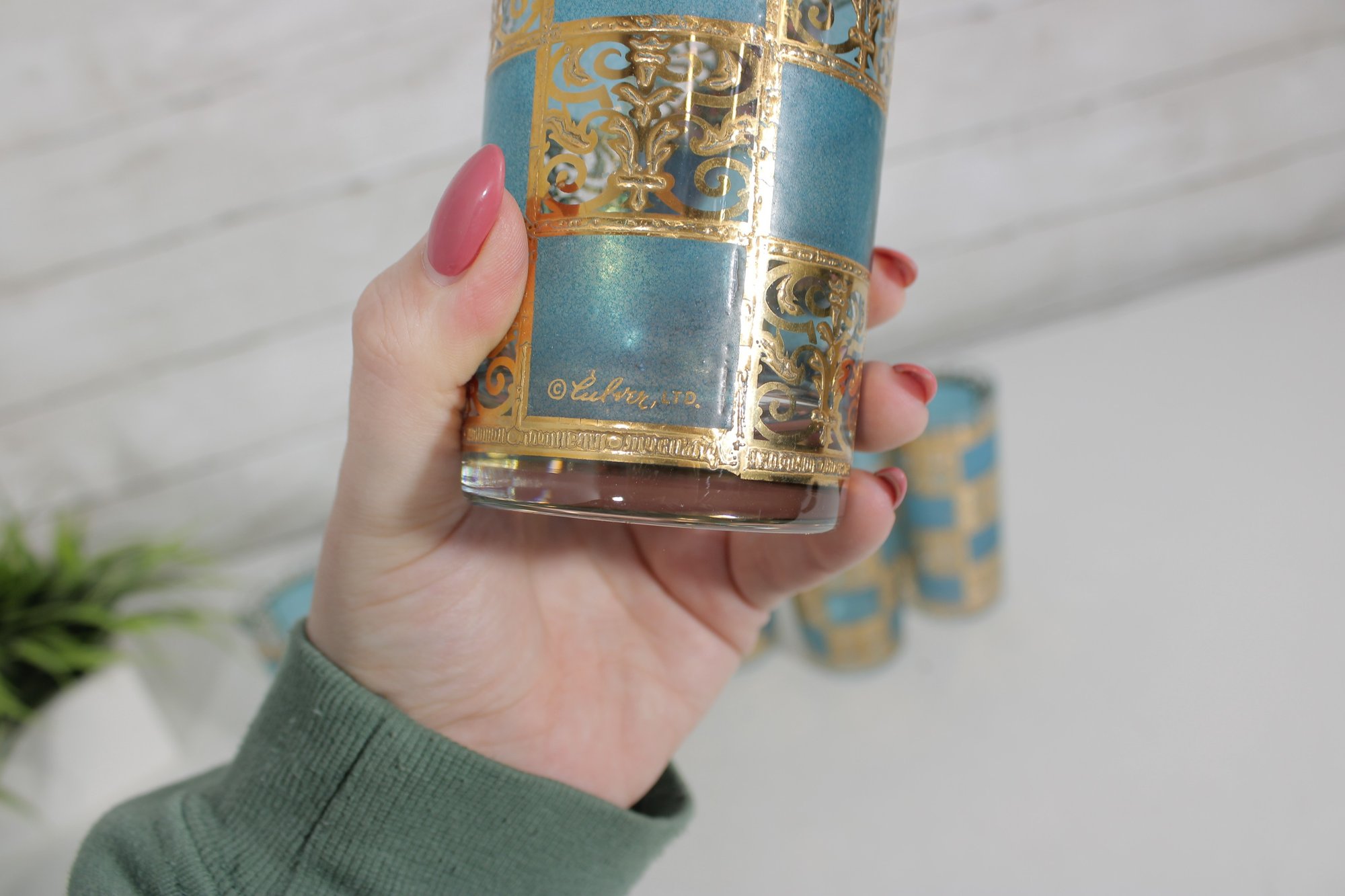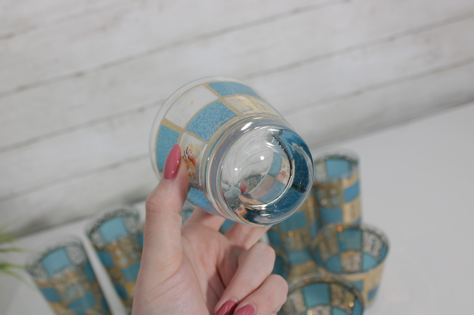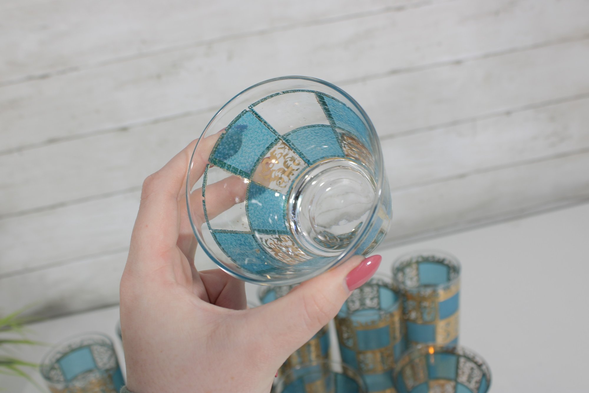 Stunning vintage Culver barware set in the highly sought-after “Carnival” pattern, featuring vibrant turquoise panels with intricate gold overlay detailing. This mid-century modern design is bold, glamorous, and instantly recognizable.