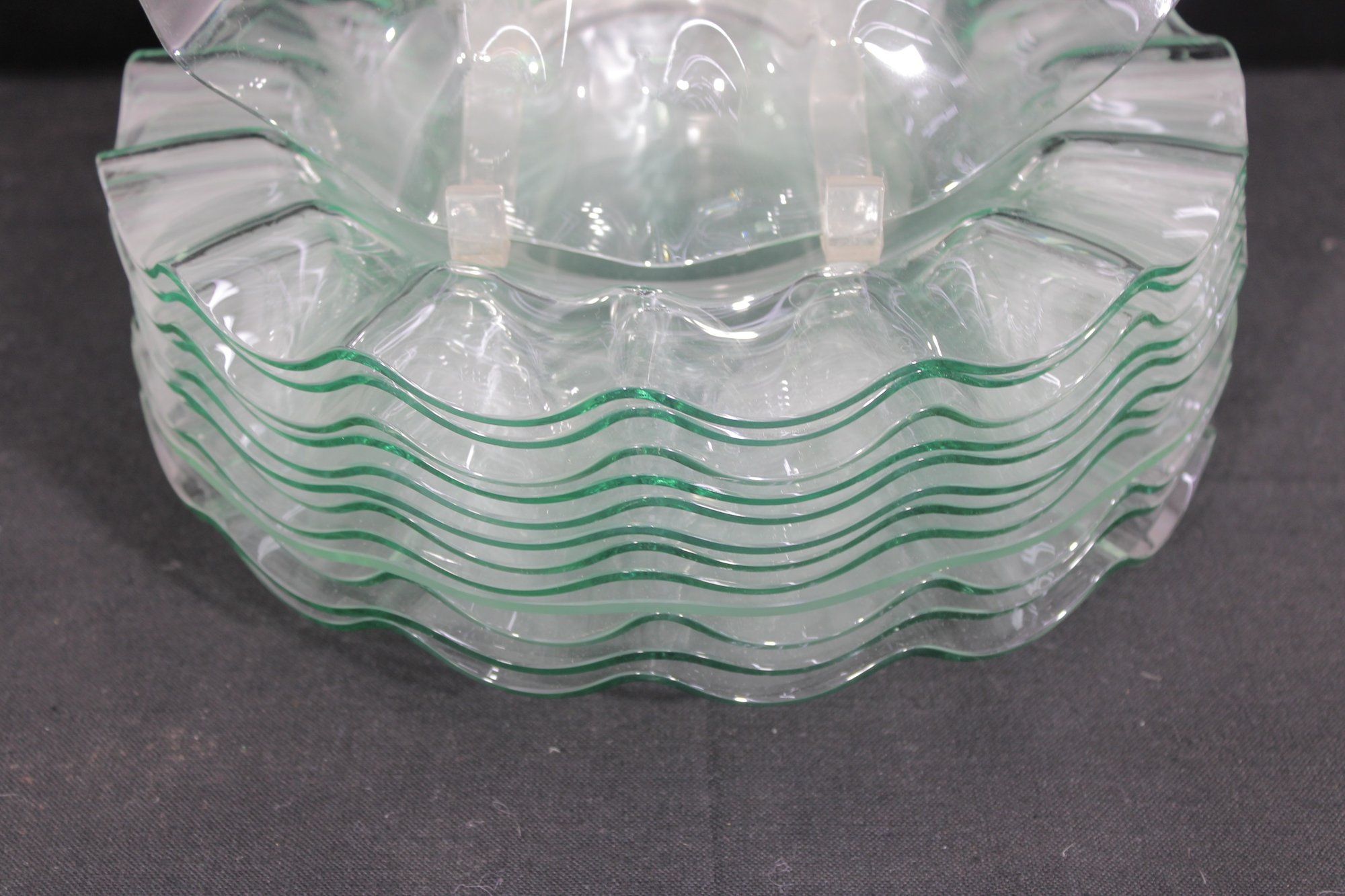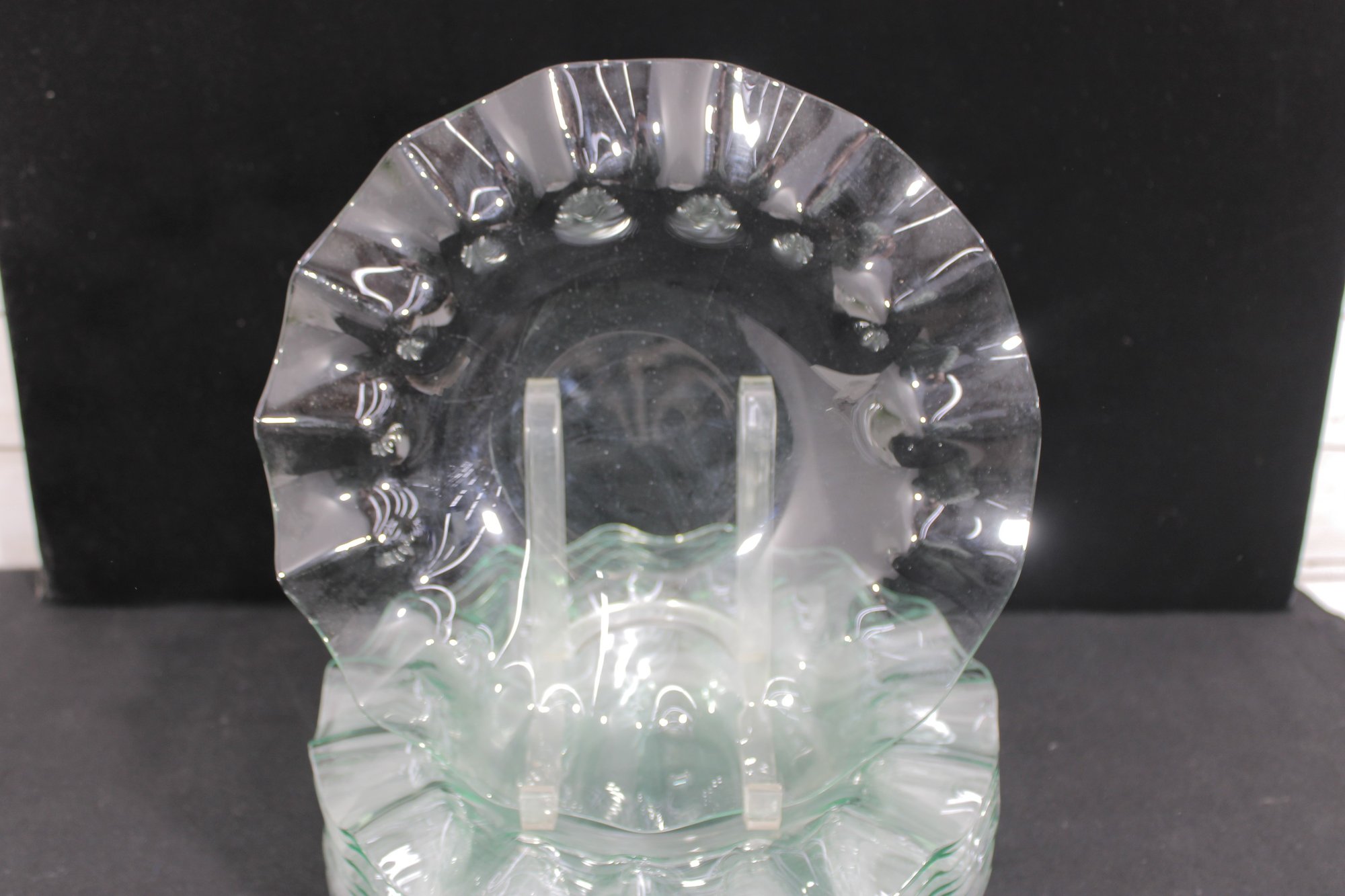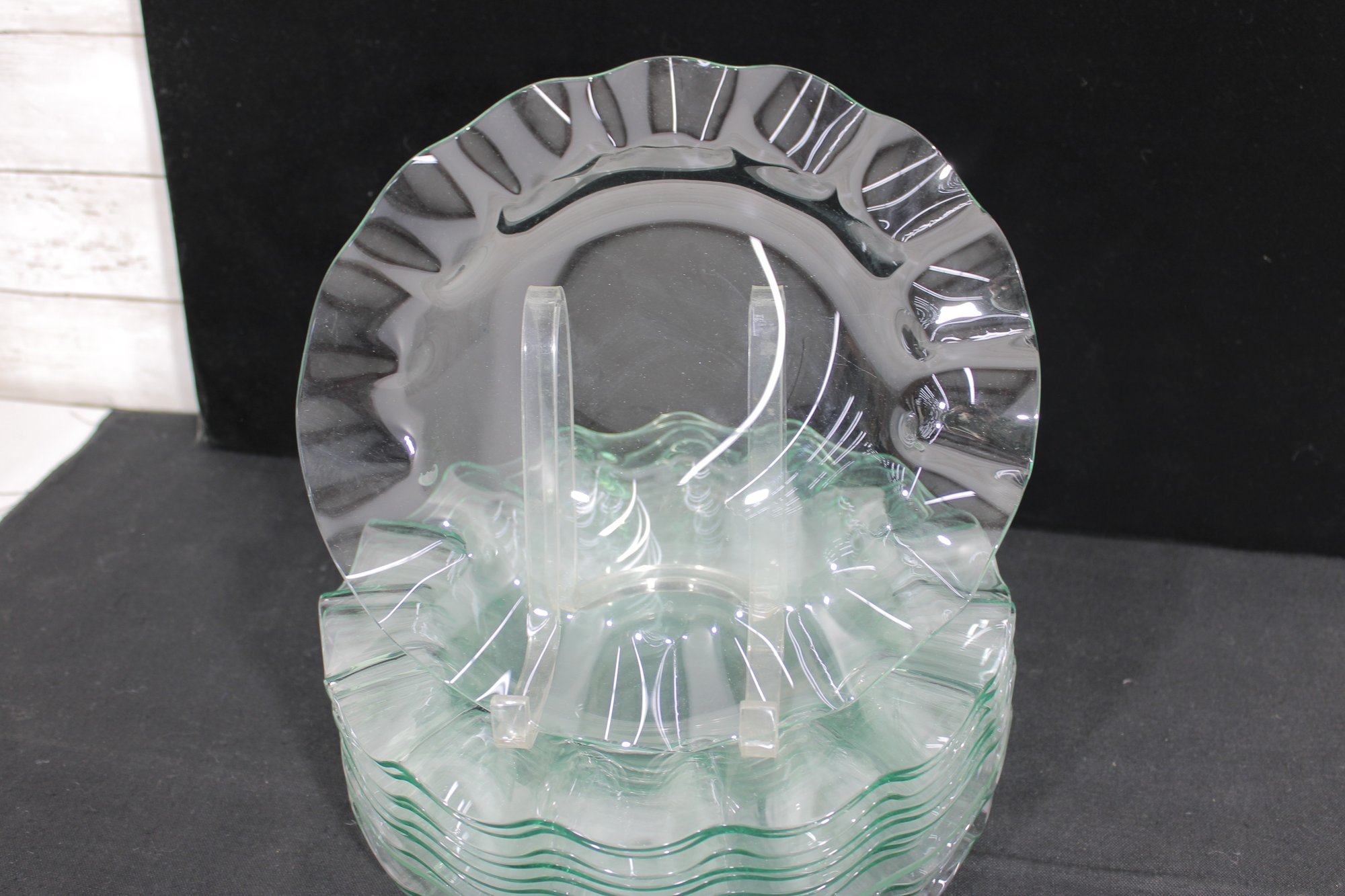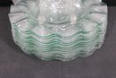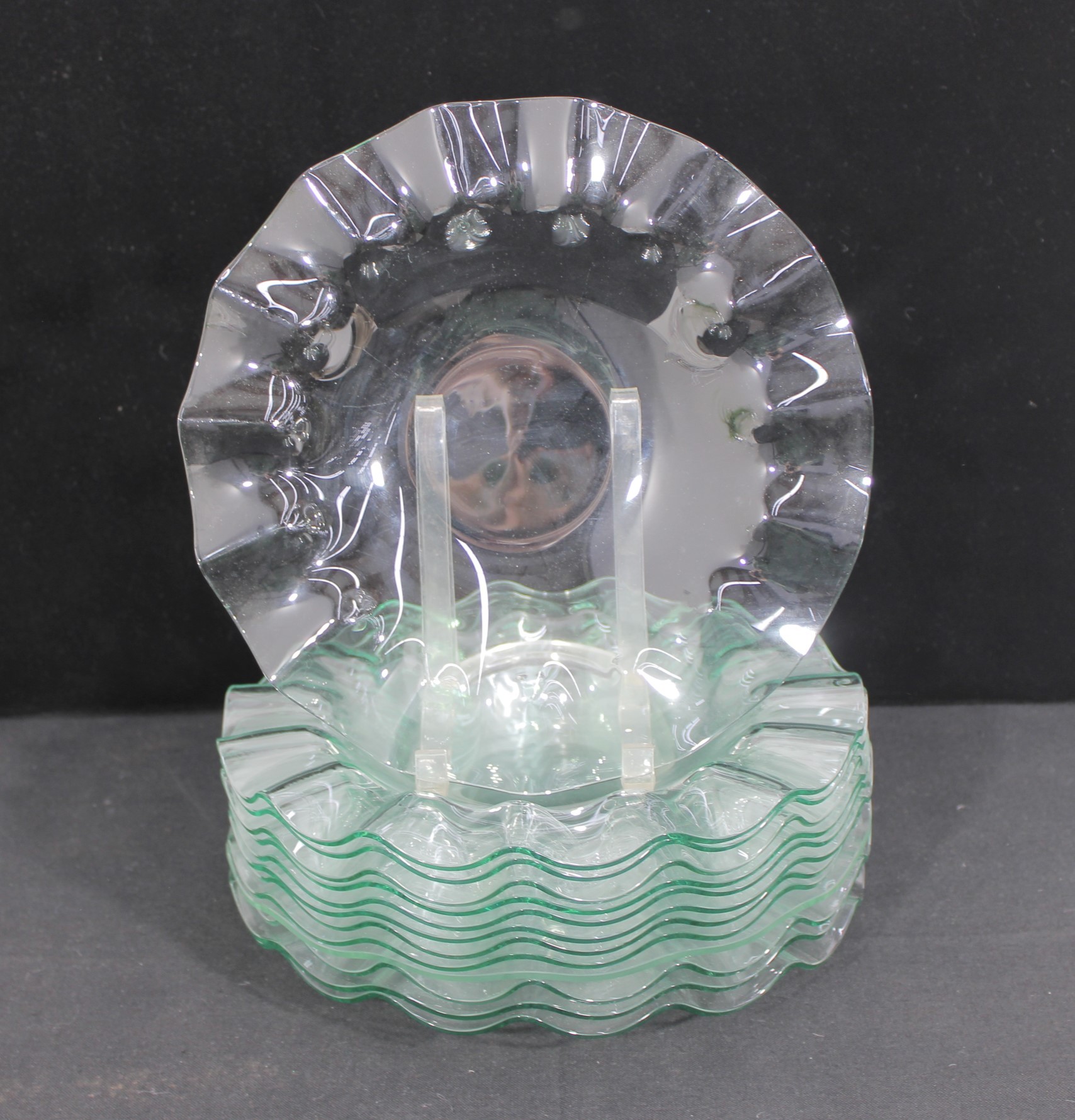 Striking set of twelve vintage clear glass plates featuring a sculptural ruffled rim design. Each plate measures approximately 11" in diameter and showcases a flowing, wave-like edge that adds movement and elegance to any table setting.