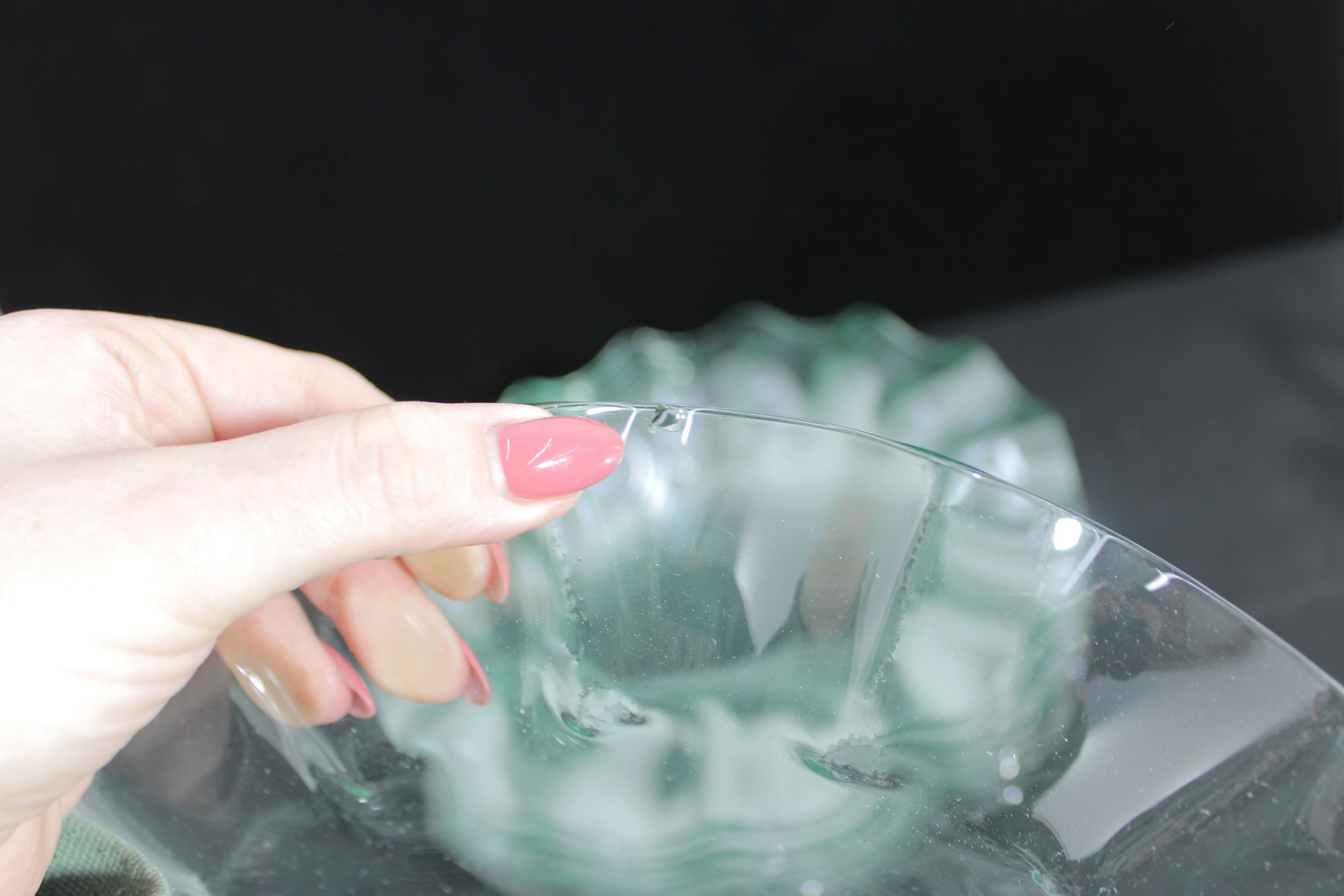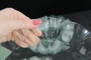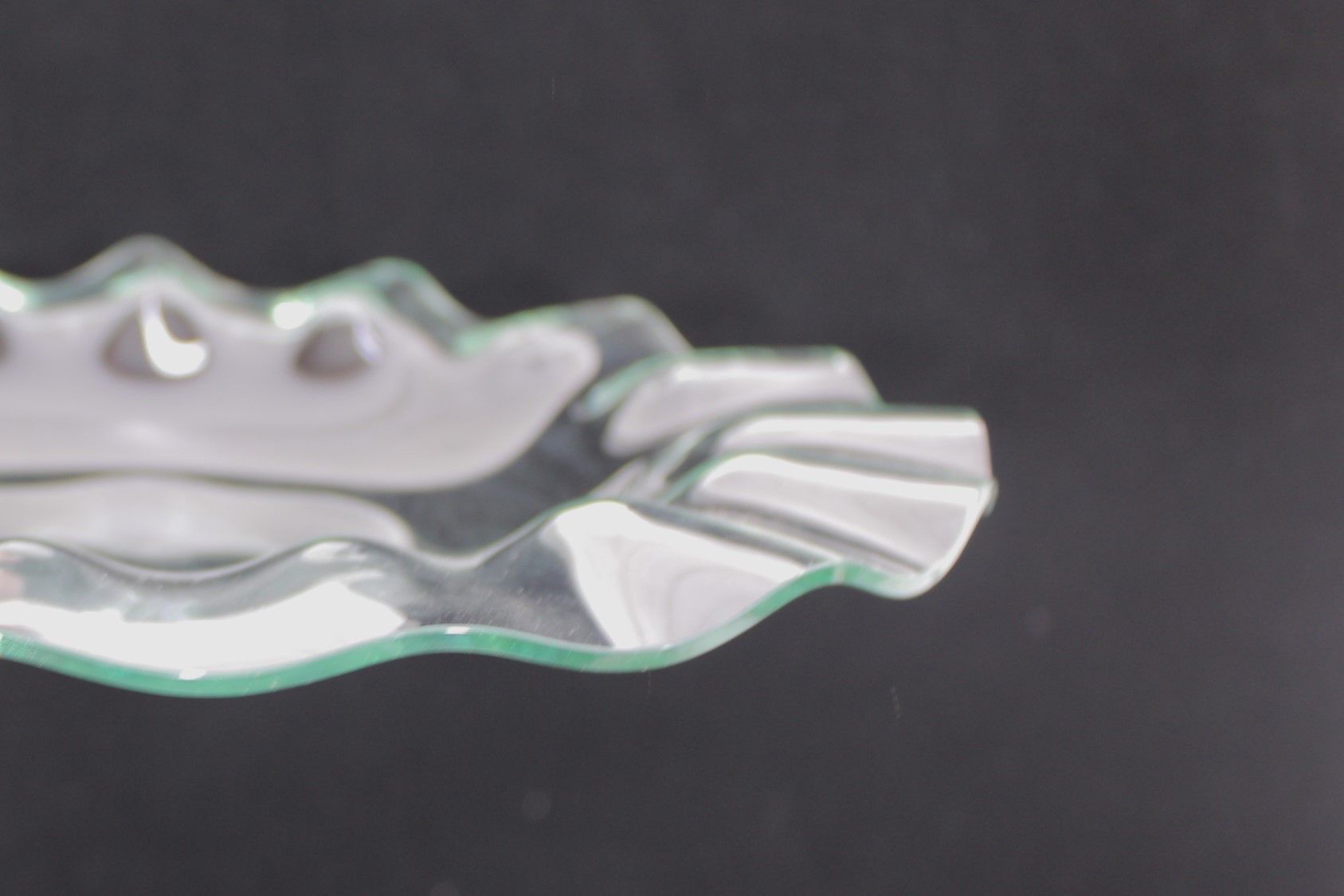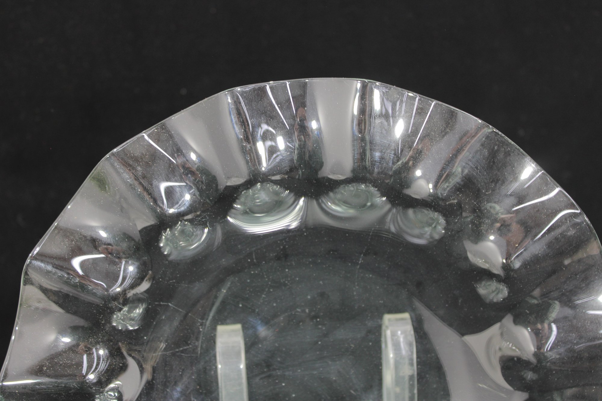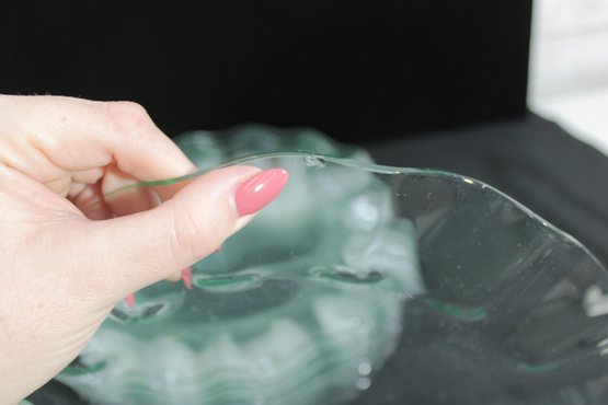 Striking set of twelve vintage clear glass plates featuring a sculptural ruffled rim design. Each plate measures approximately 11" in diameter and showcases a flowing, wave-like edge that adds movement and elegance to any table setting.