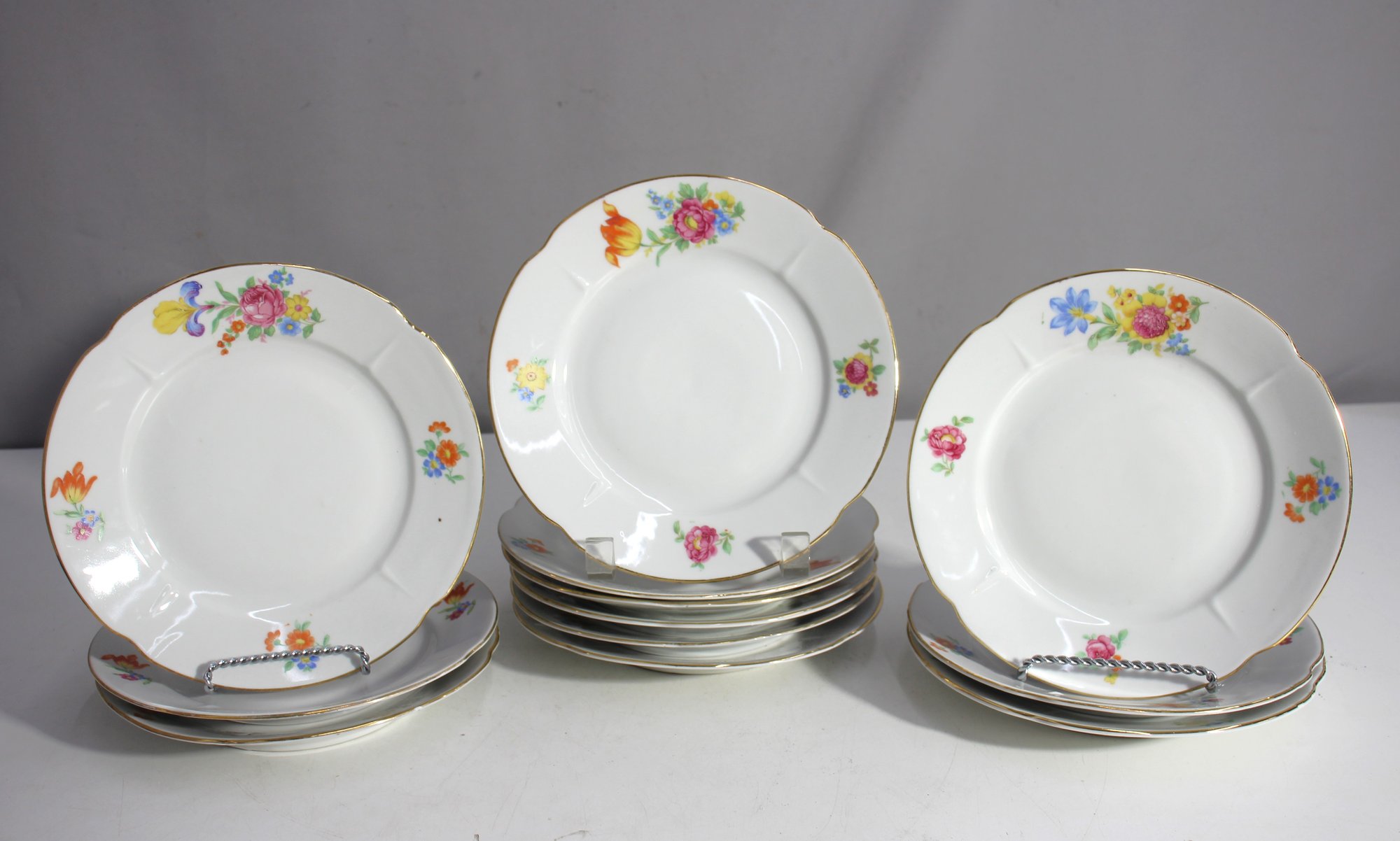 This is a beautiful set of 12 vintage 7.5" round porcelain plates, each featuring a delicate floral design in vibrant colors and accented with gold trim. Manufactured by Crown USA, these plates are perfect for collectors or for adding a touch of elegance to your table setting. In good vintage condition with minimal signs of wear. A charming addition to any collection!