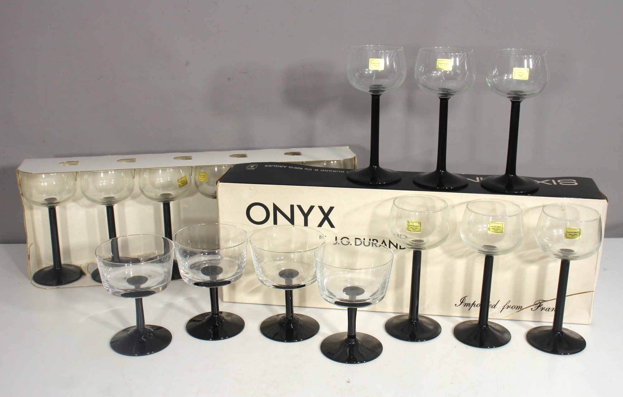 this stunning 12-piece vintage stemware set from the Onyx collection by J.G. Durand, France. Featuring sleek black stems and clear glass bowls, this elegant set includes both 6.5-inch wine glasses and 5-inch cocktail/sherbet glasses—perfect for sophisticated entertaining.