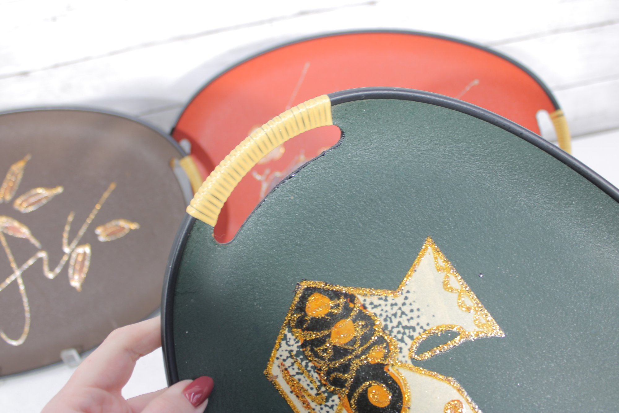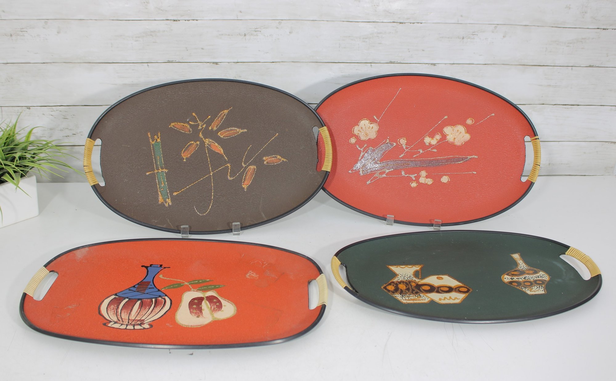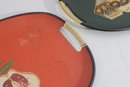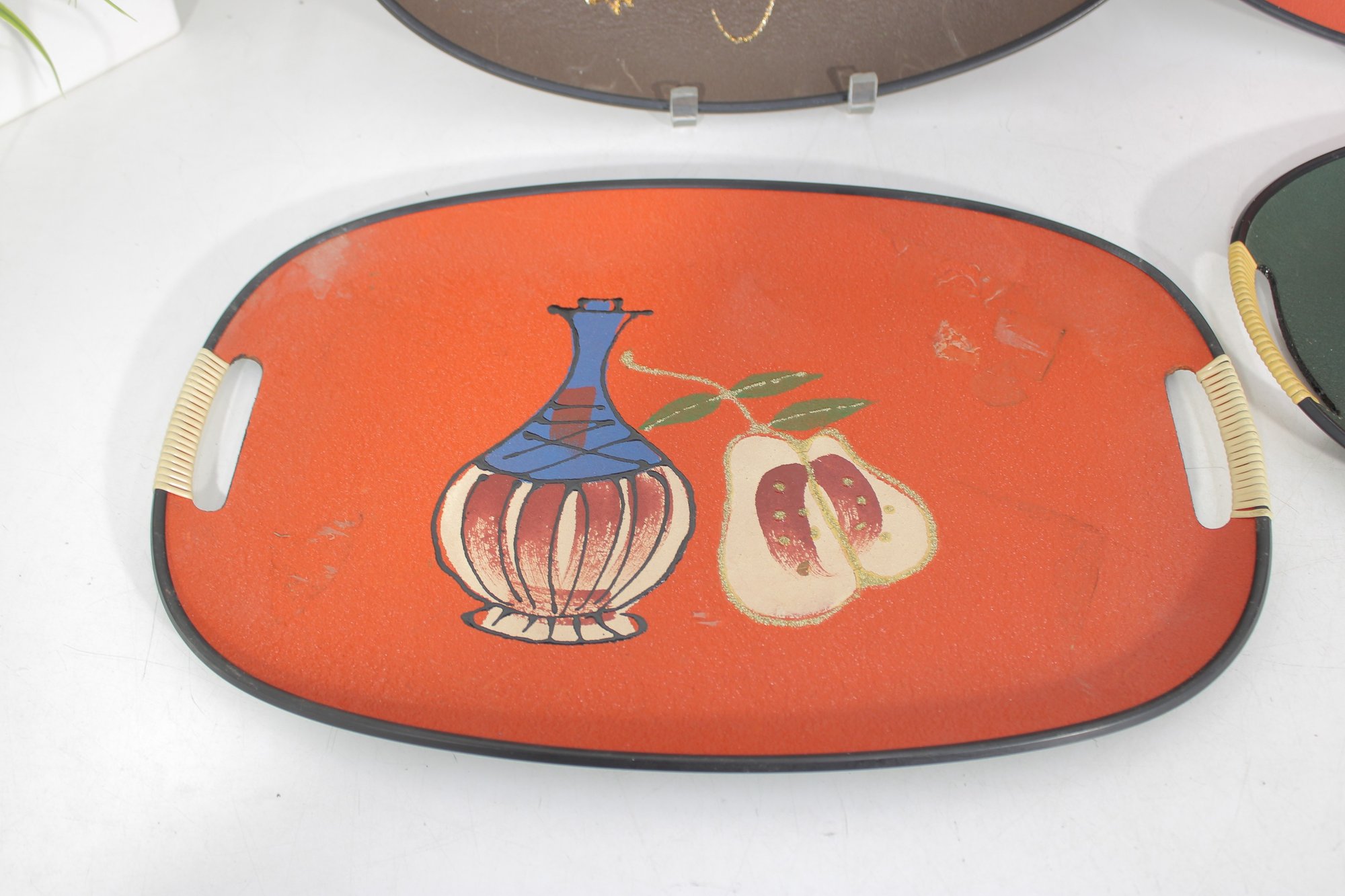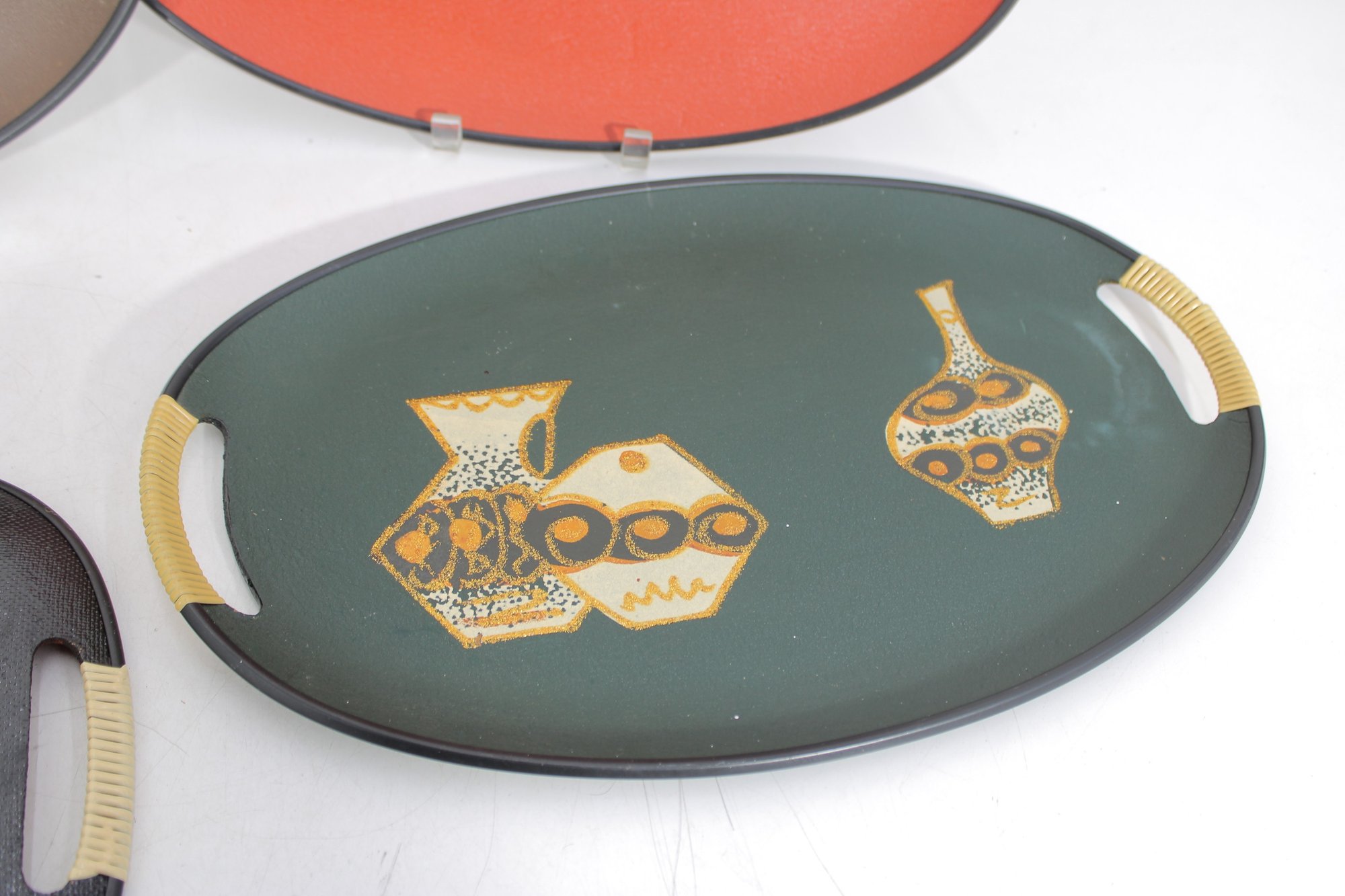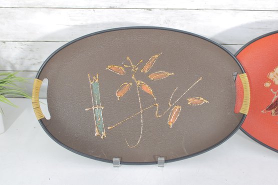 Each tray has integrated side handles with ribbed cream-colored grips and black trim around the edges, enhancing their bold mid-century appeal.