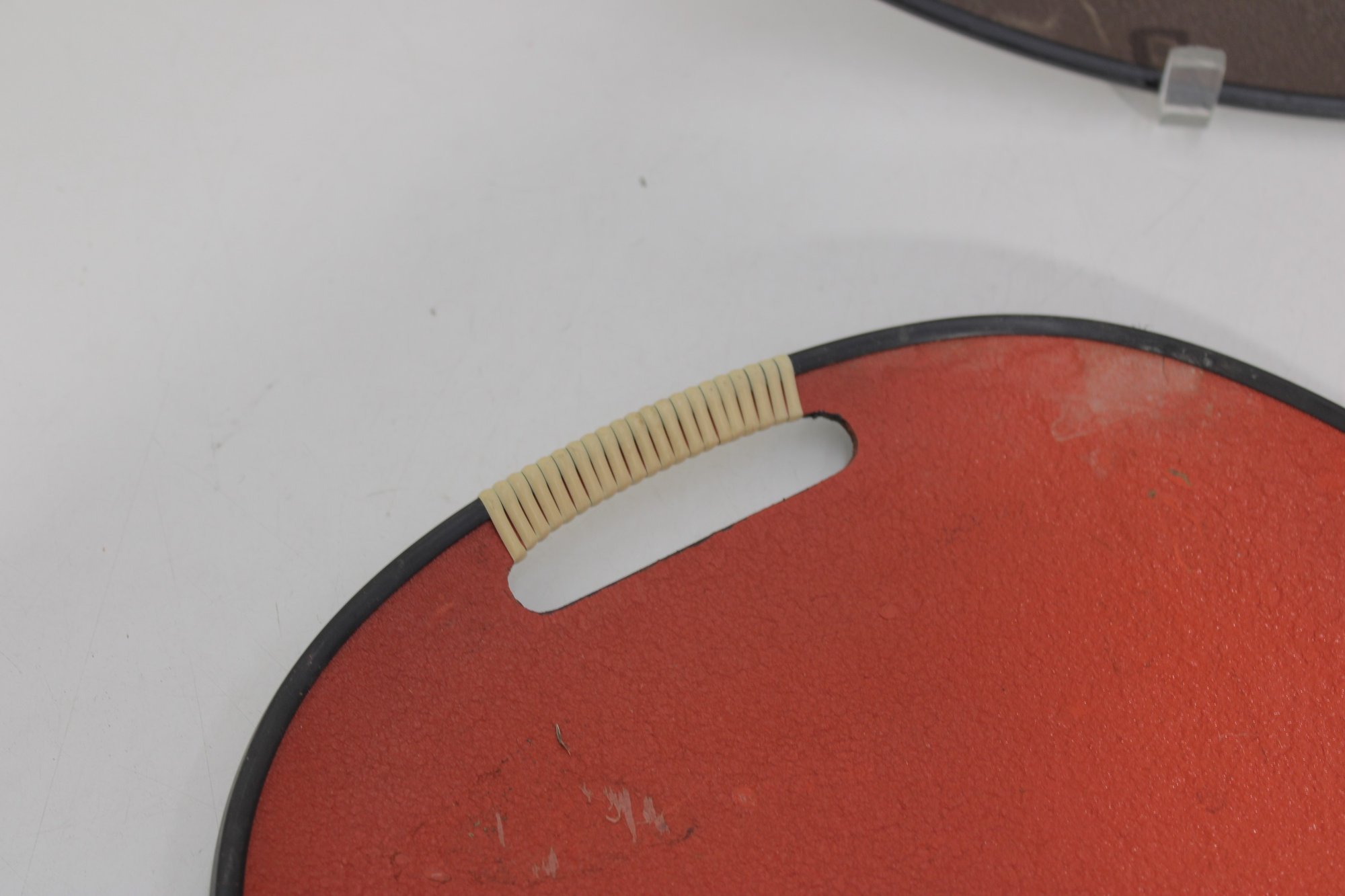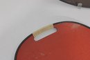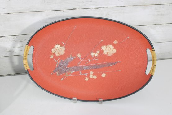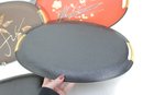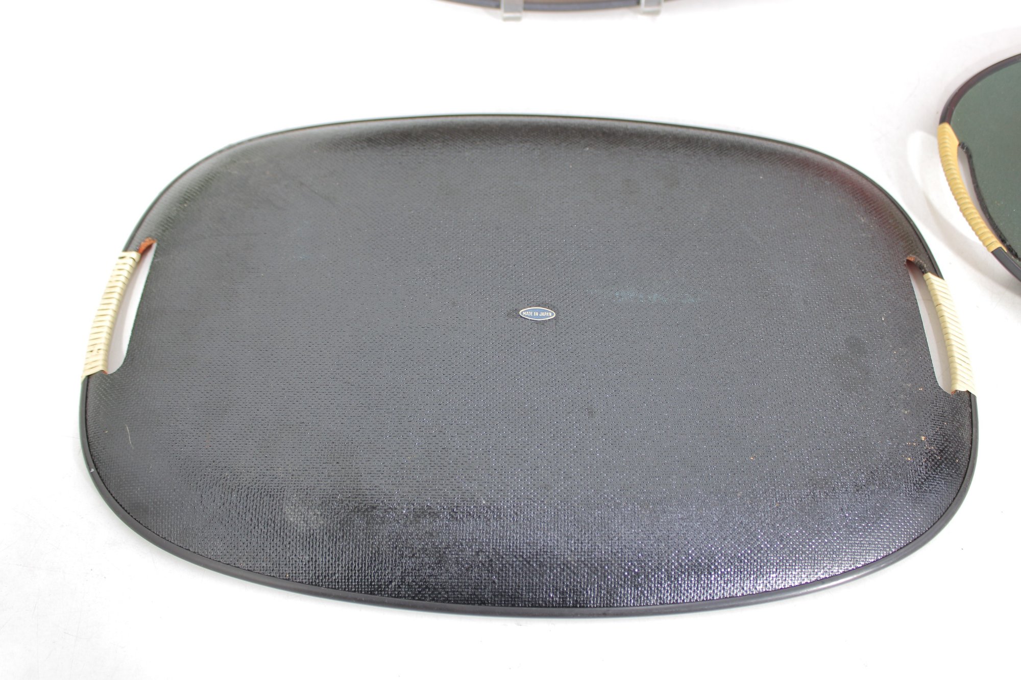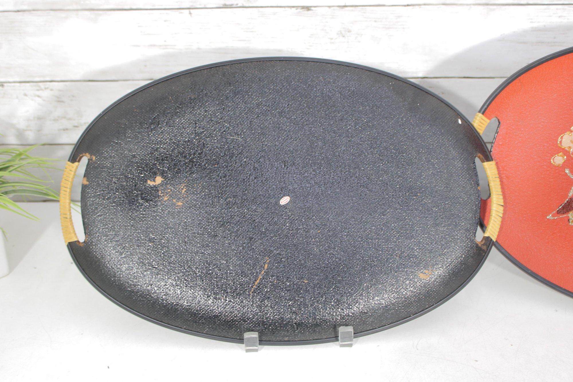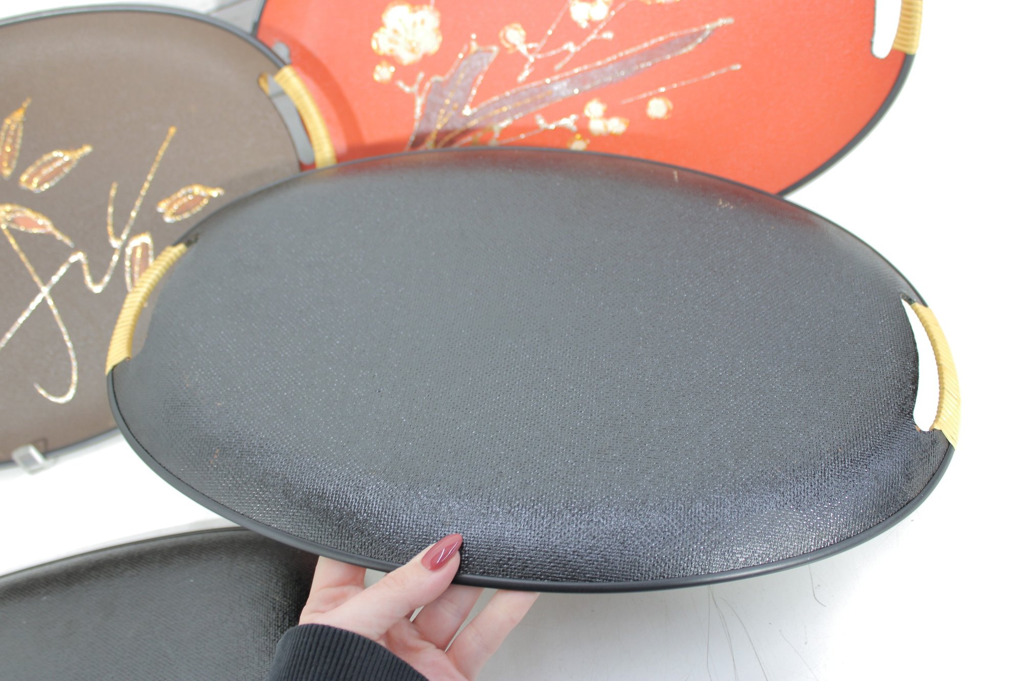 Each tray has integrated side handles with ribbed cream-colored grips and black trim around the edges, enhancing their bold mid-century appeal.