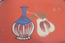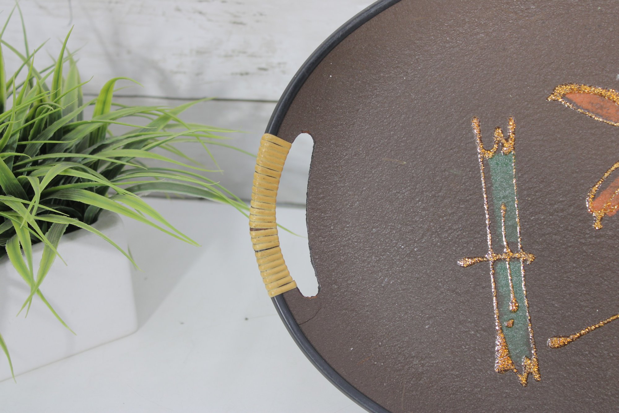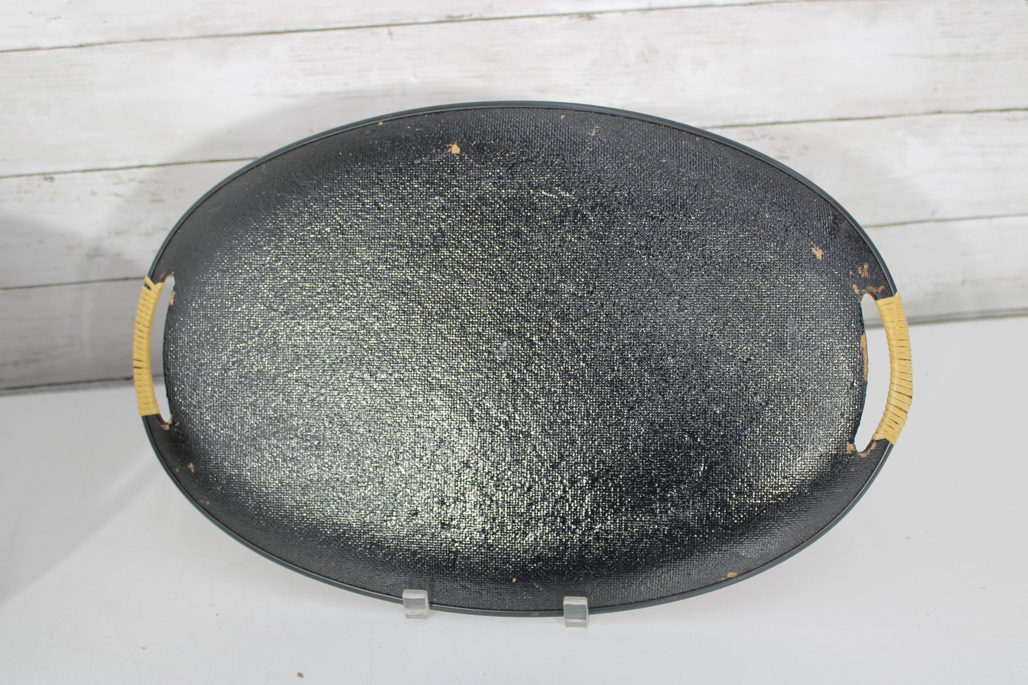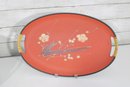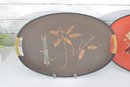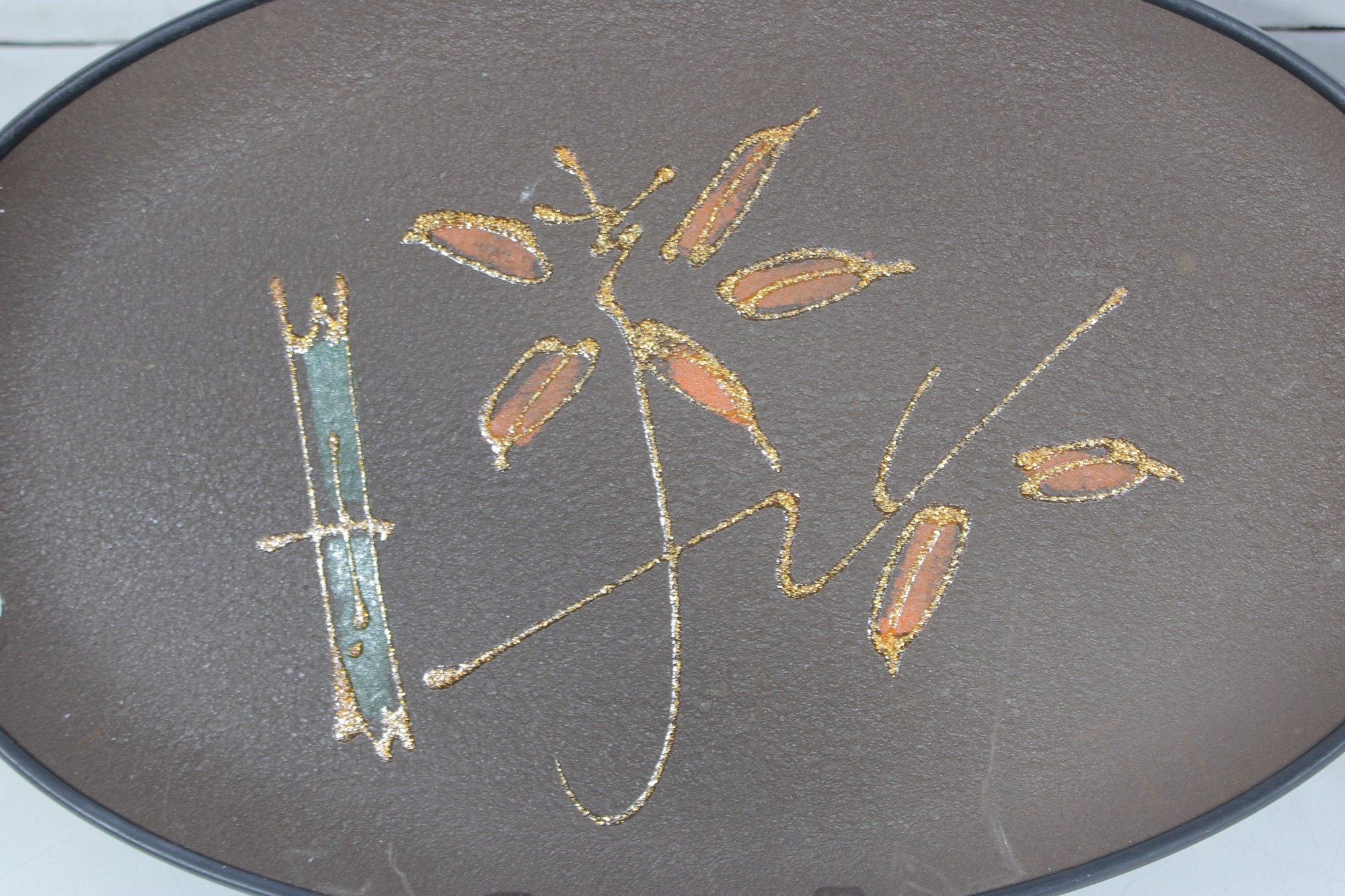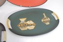 These oval serving trays feature vibrant retro color palettes including orange, brown, and green backgrounds with atomic-era graphics such as stylized vases, fruit, florals, and abstract motifs. The glitter accents throughout the designs give them that classic 1960s cocktail lounge sparkle.