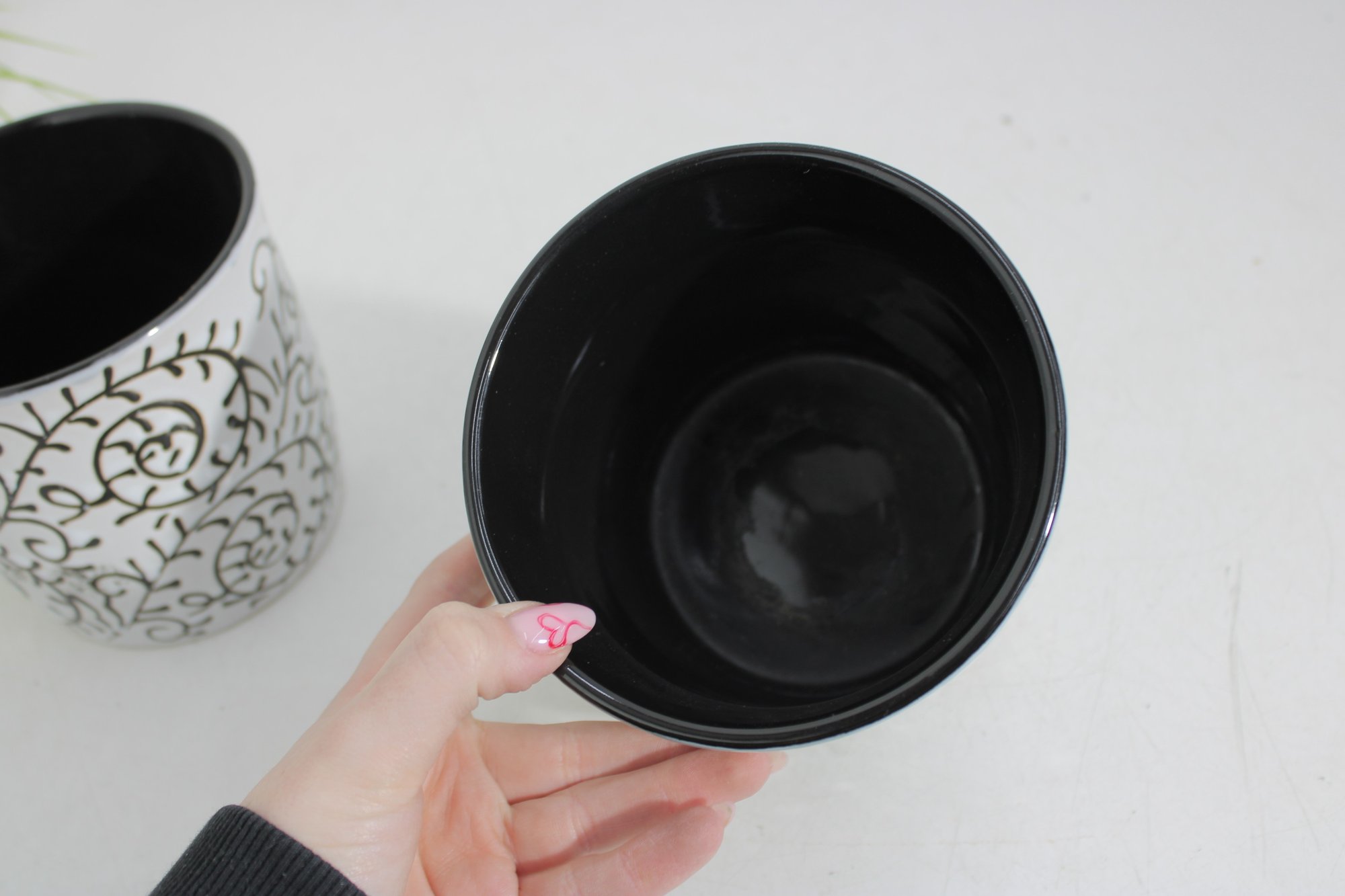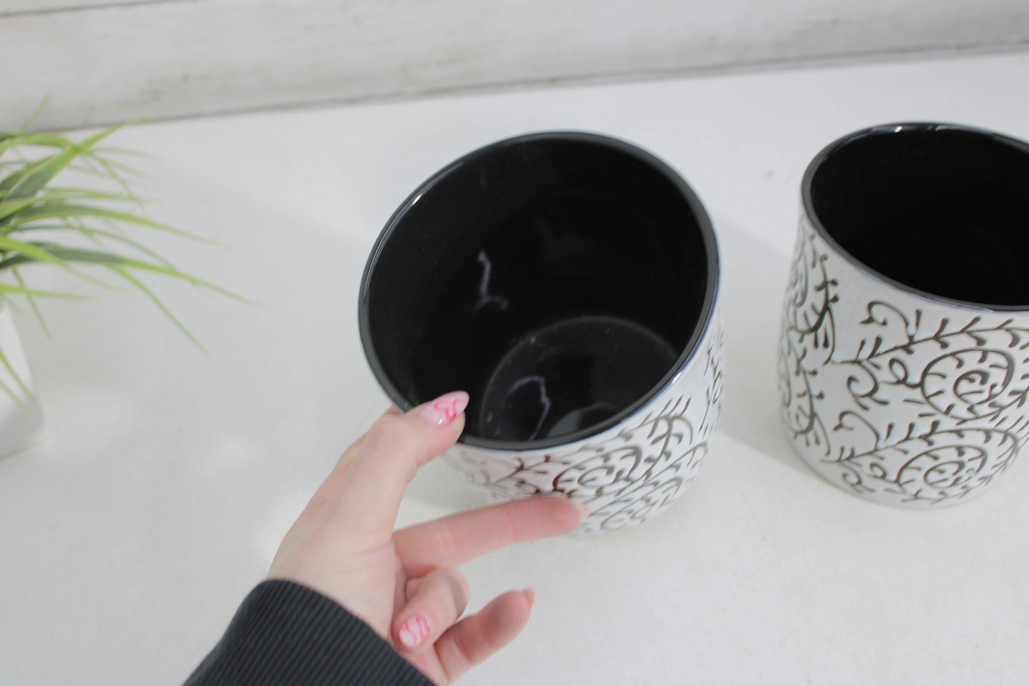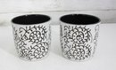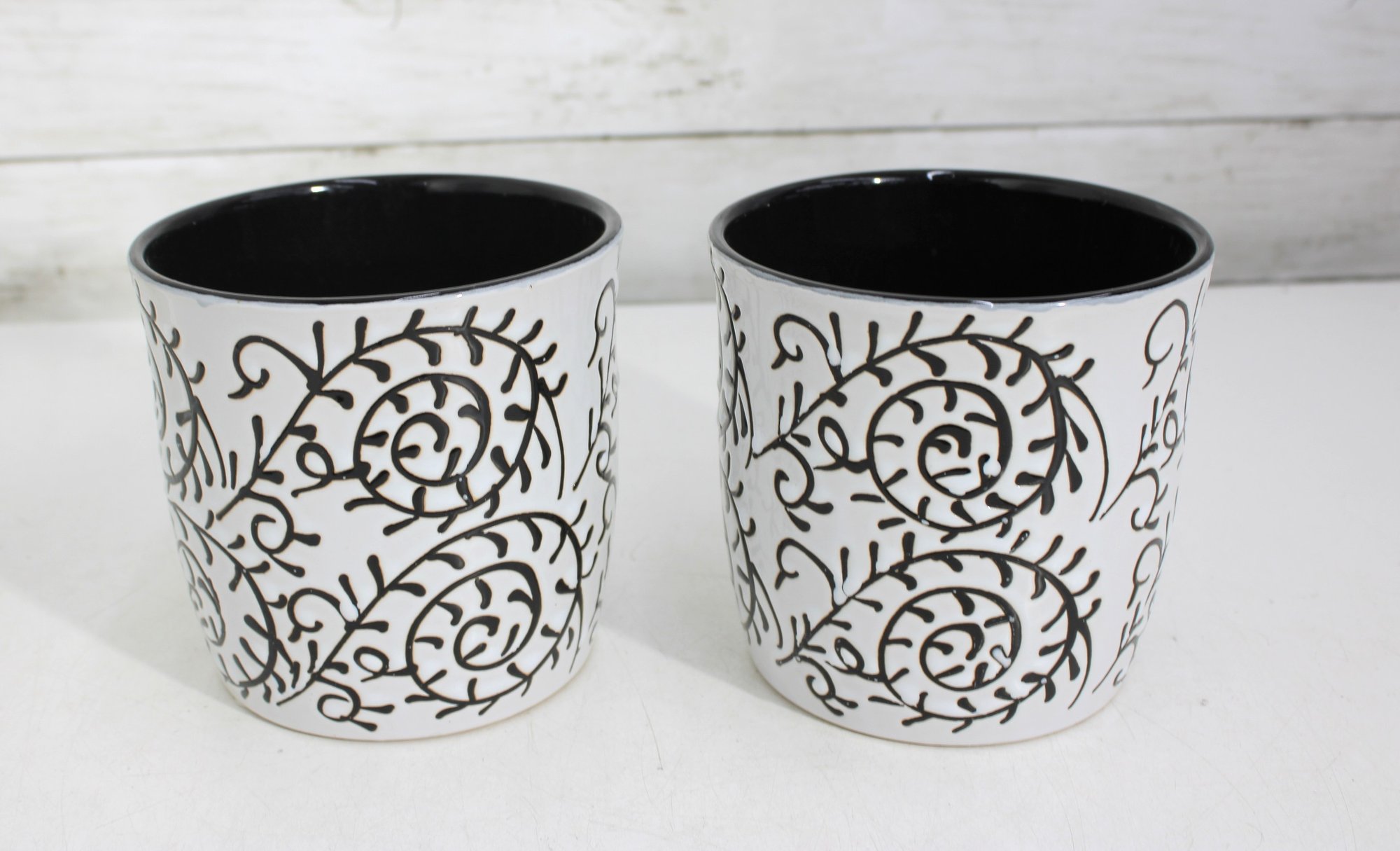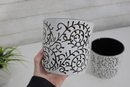set of two ceramic planters featuring a bold black scroll pattern over a white background with contrasting black interiors. The classic color combo and decorative vine-style design make these perfect accent pieces for modern, farmhouse, or eclectic spaces.