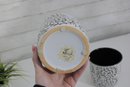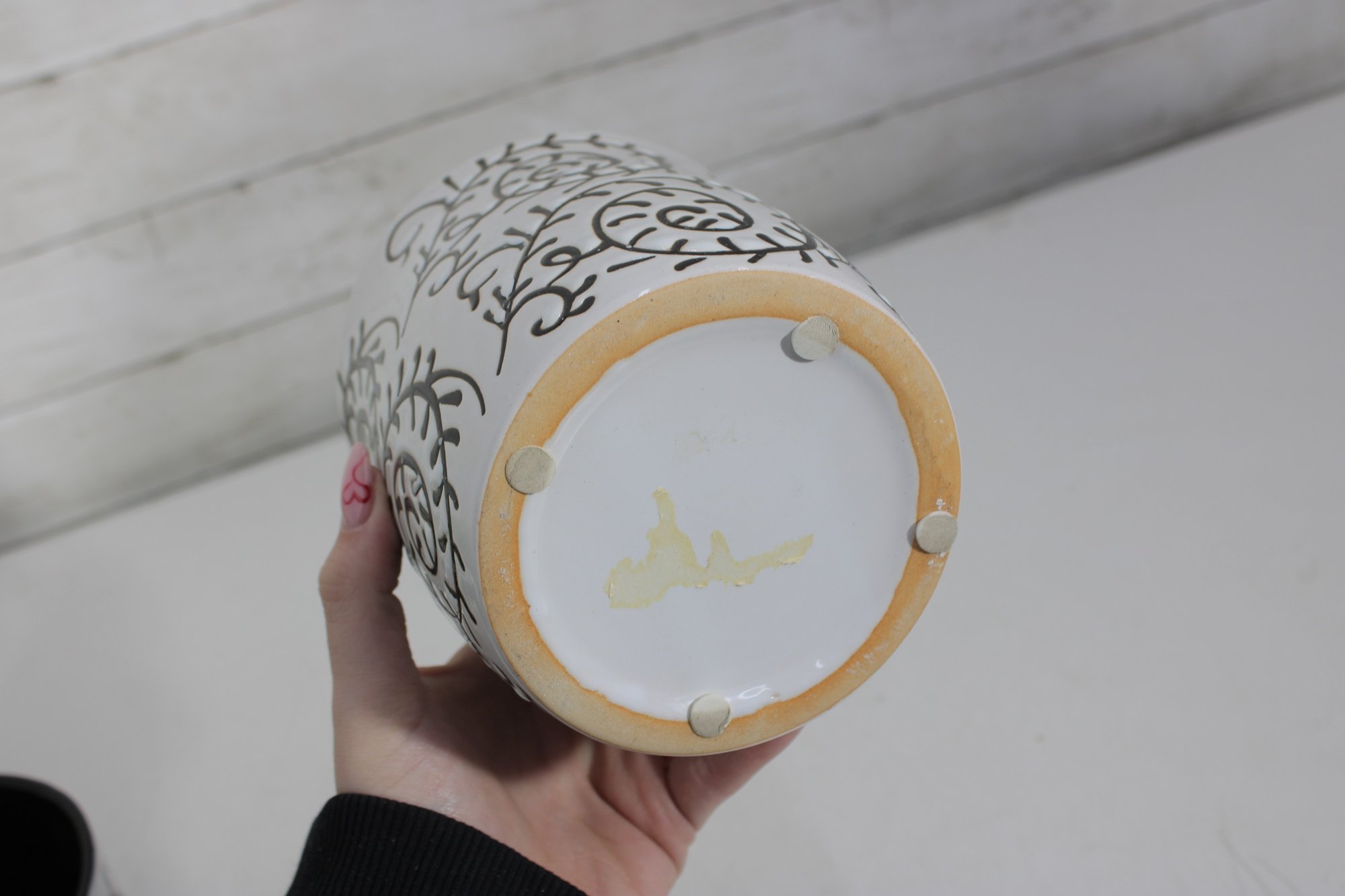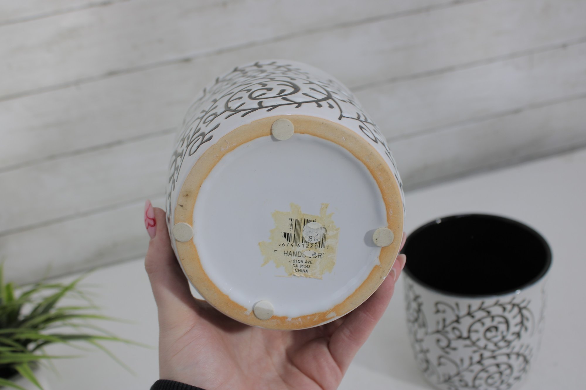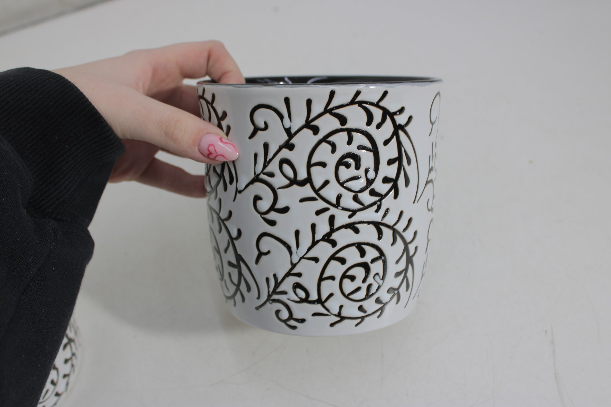 set of two ceramic planters featuring a bold black scroll pattern over a white background with contrasting black interiors. The classic color combo and decorative vine-style design make these perfect accent pieces for modern, farmhouse, or eclectic spaces.