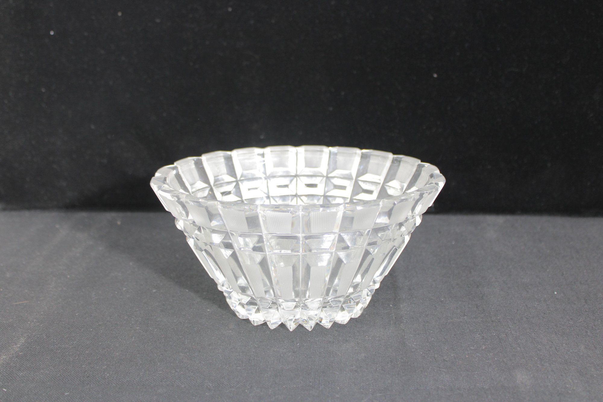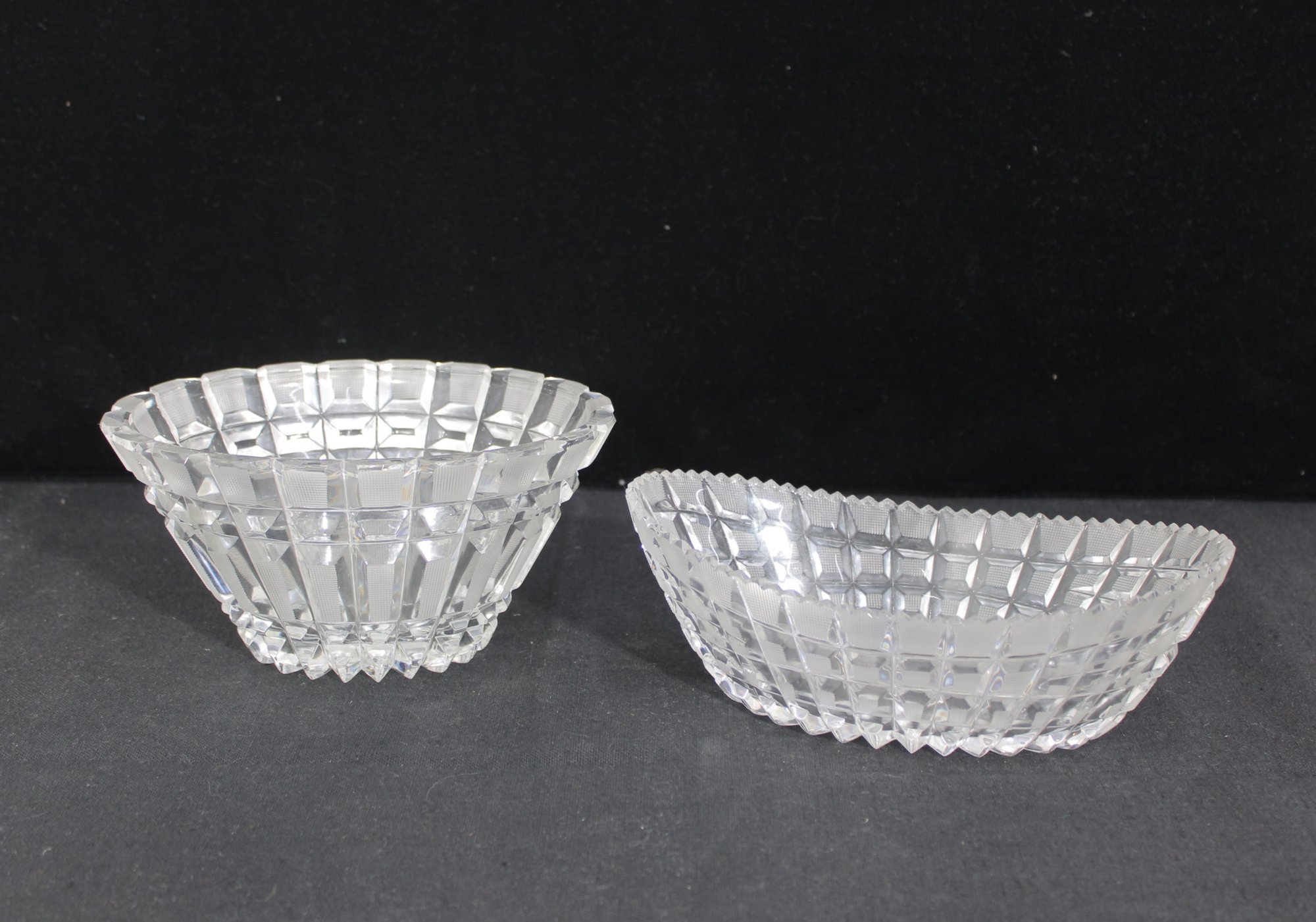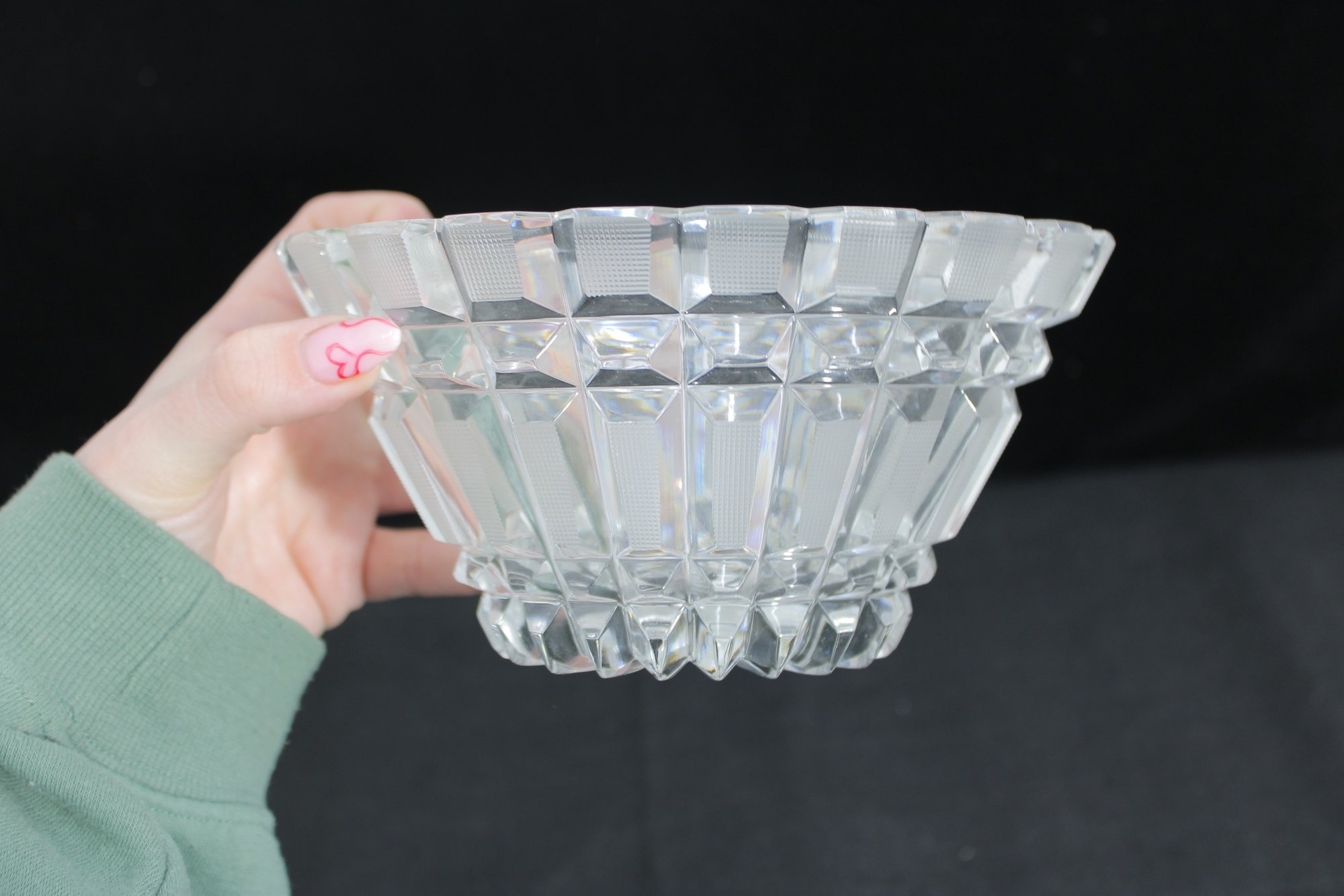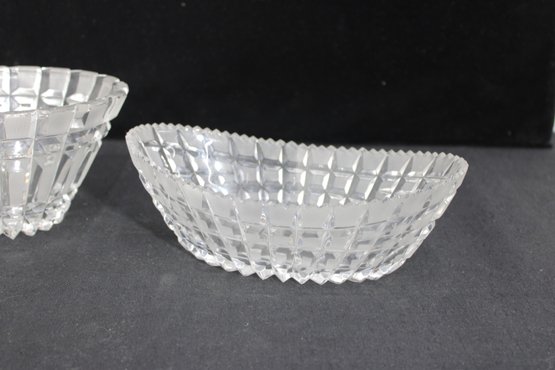 Beautiful set of two cut glass/crystal bowls featuring a striking geometric pattern that reflects light from every angle. These elegant pieces work wonderfully as candy dishes, nut bowls, trinket holders, or decorative accents for a table, shelf, or display cabinet.