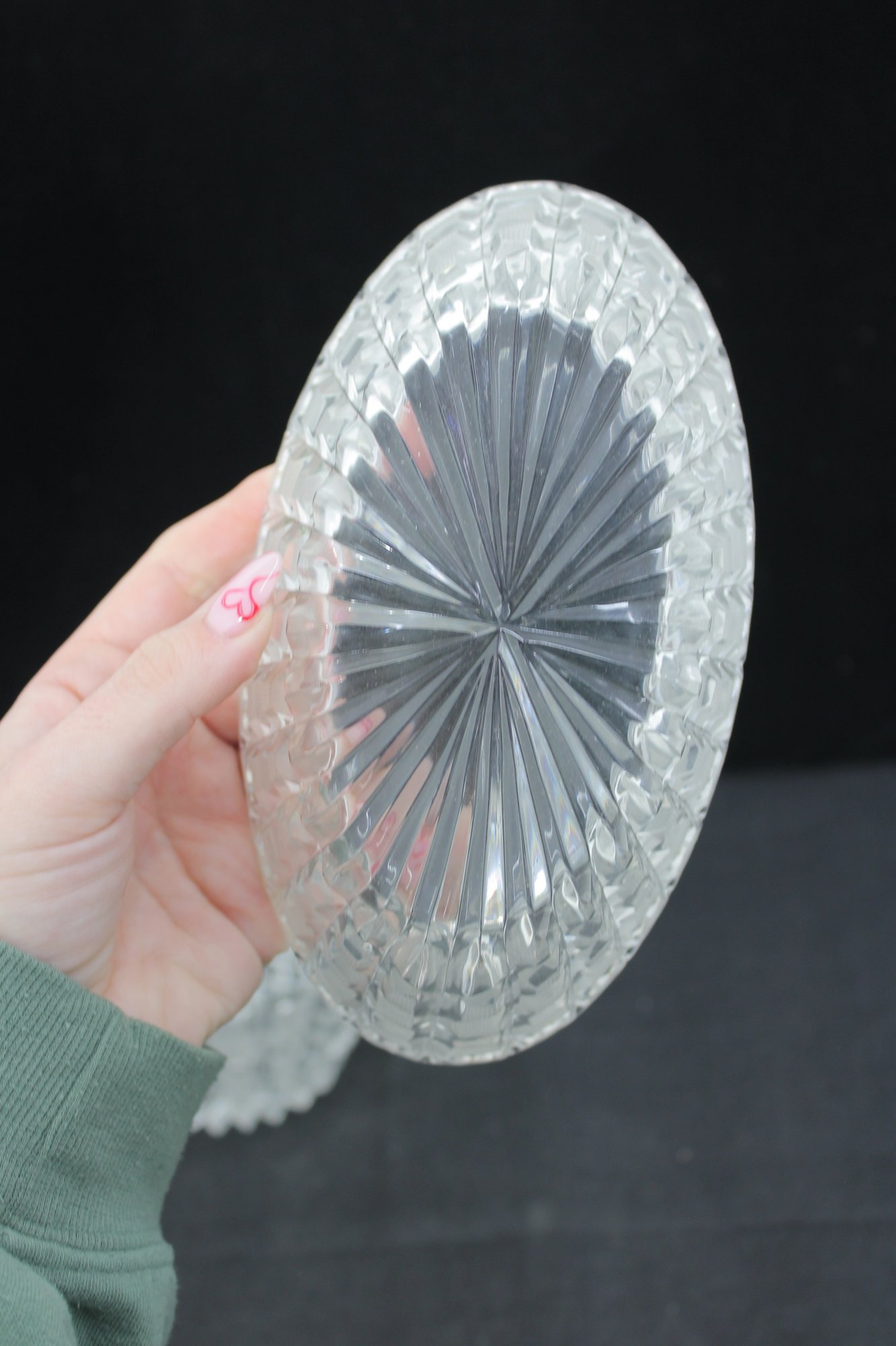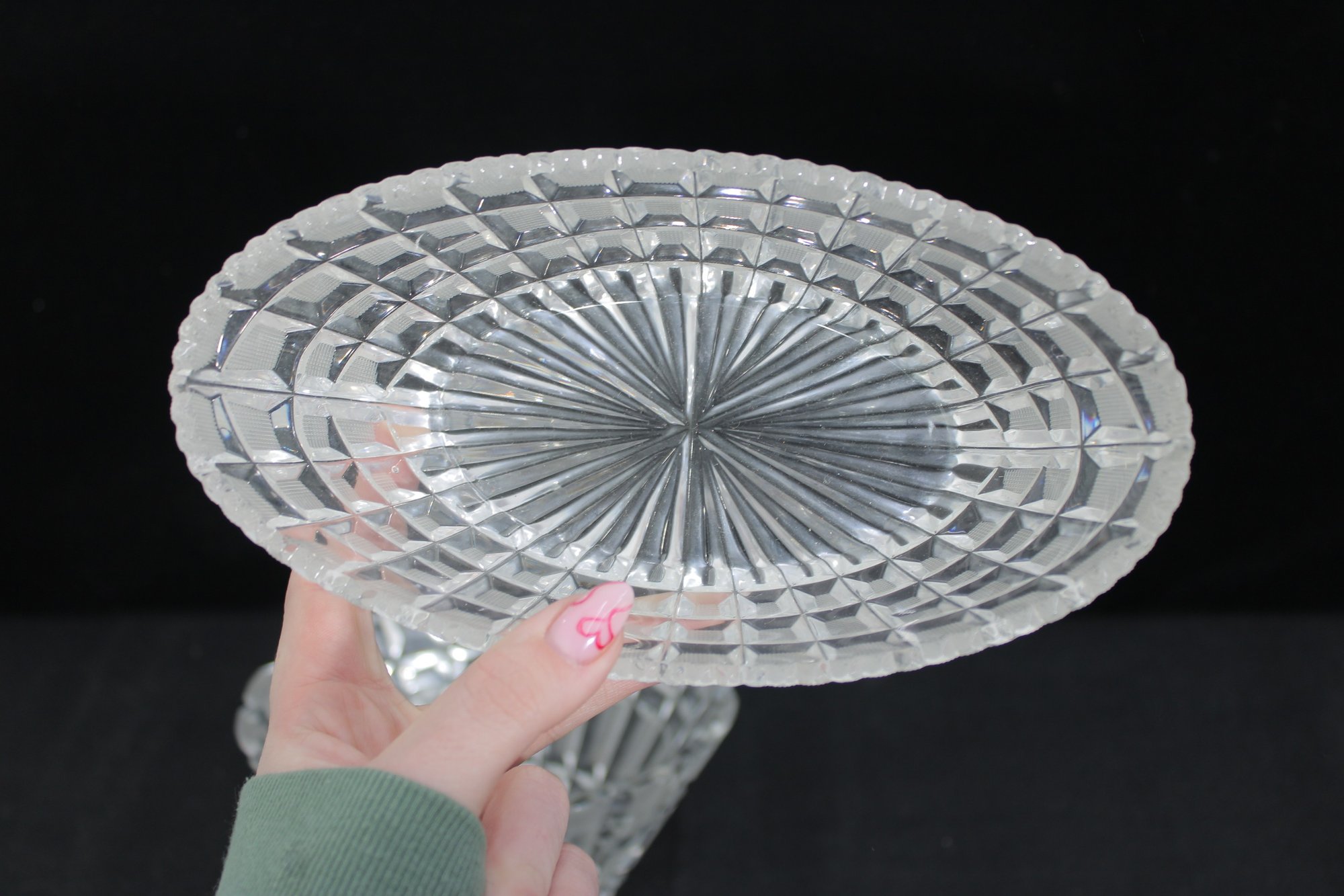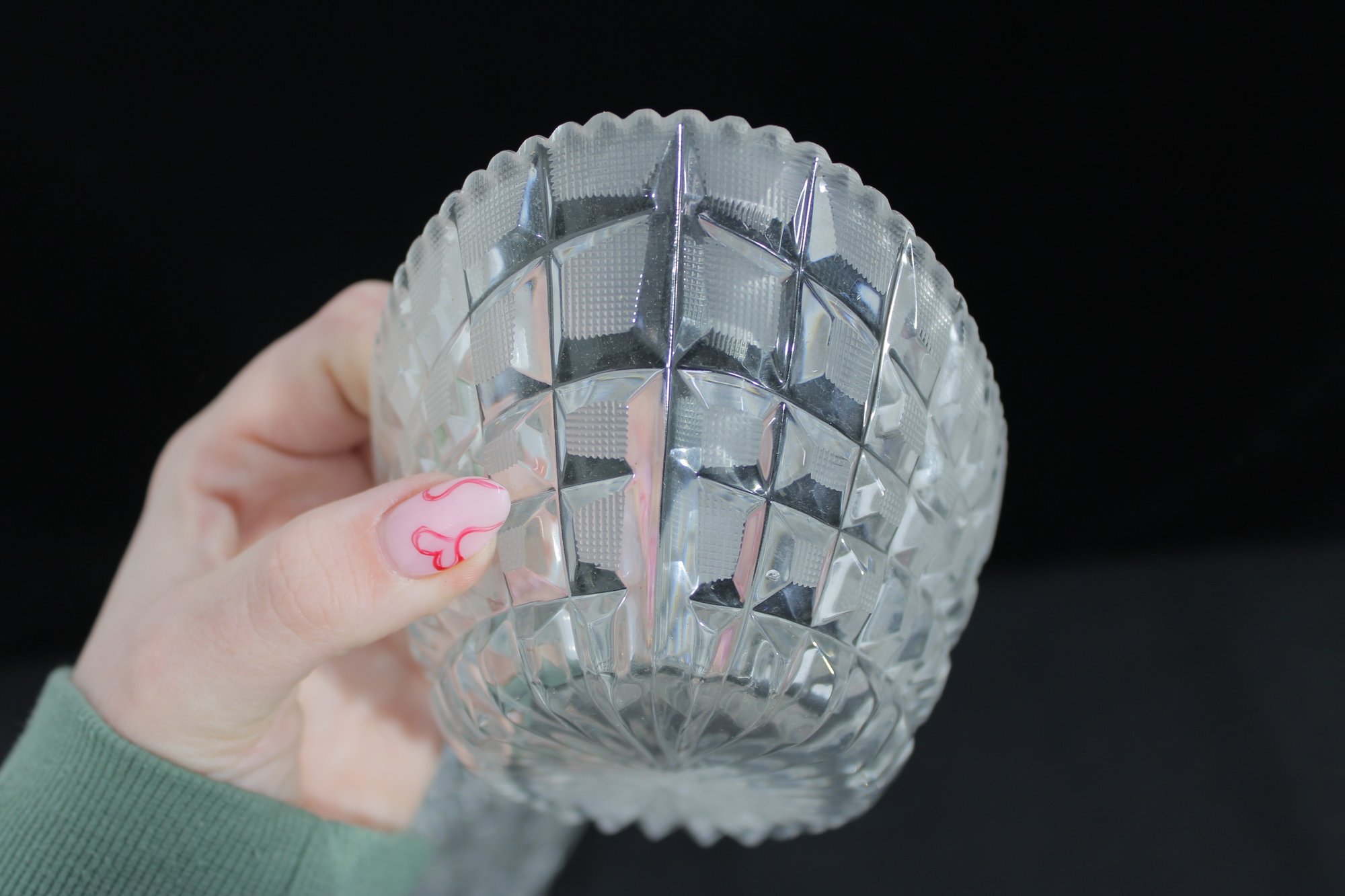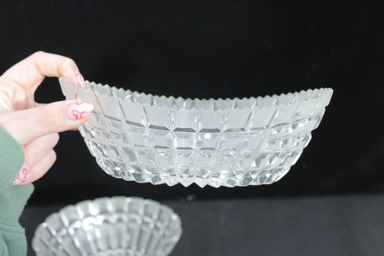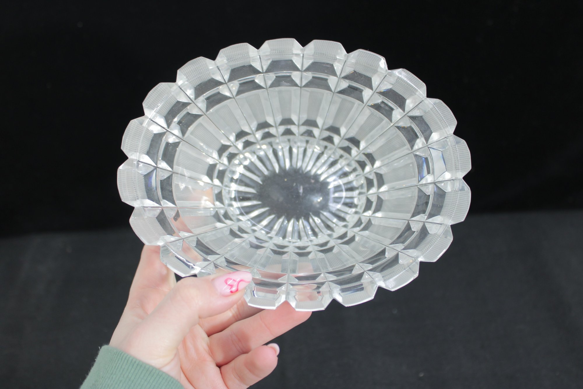 Beautiful set of two cut glass/crystal bowls featuring a striking geometric pattern that reflects light from every angle. These elegant pieces work wonderfully as candy dishes, nut bowls, trinket holders, or decorative accents for a table, shelf, or display cabinet.