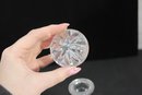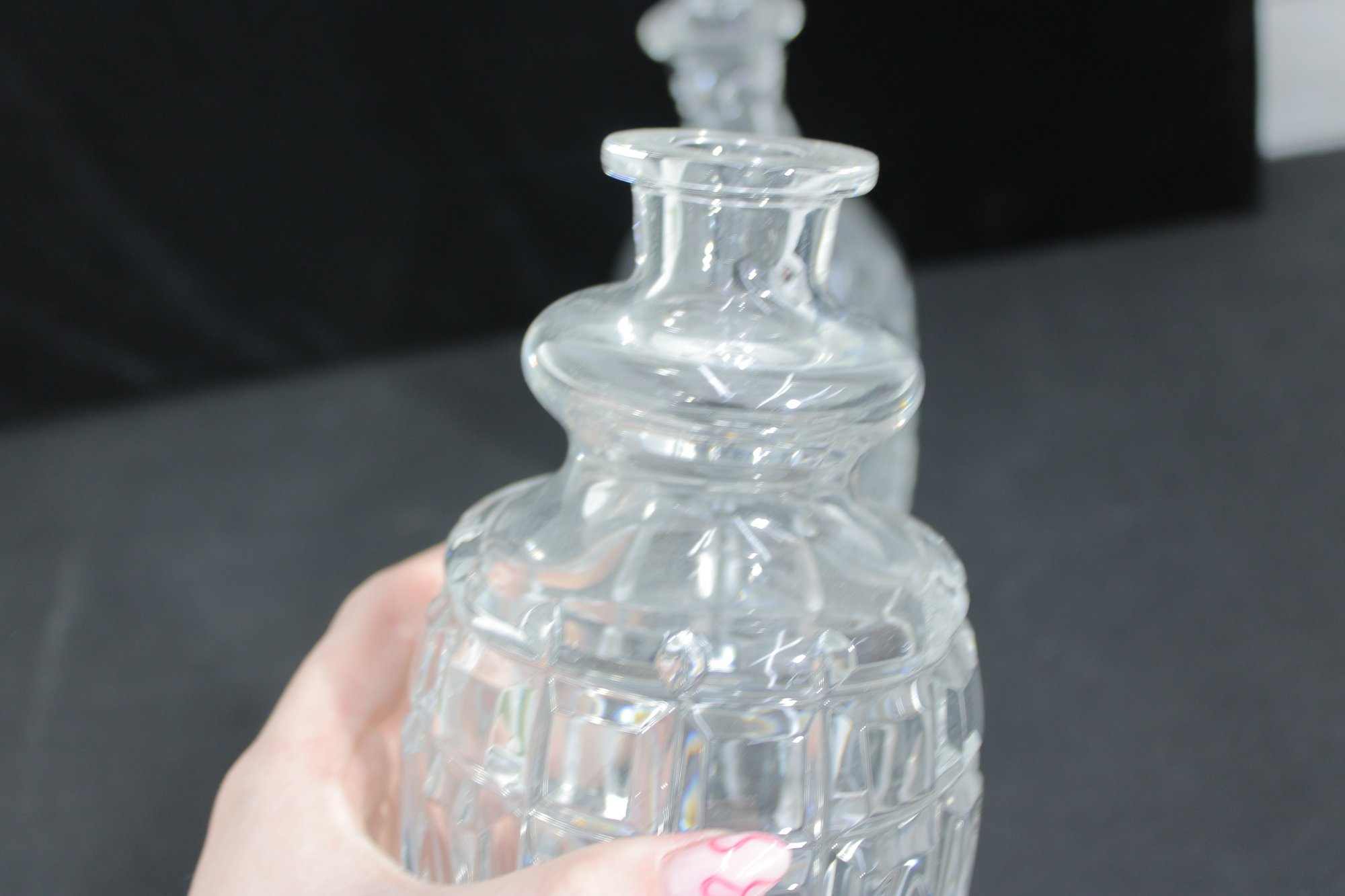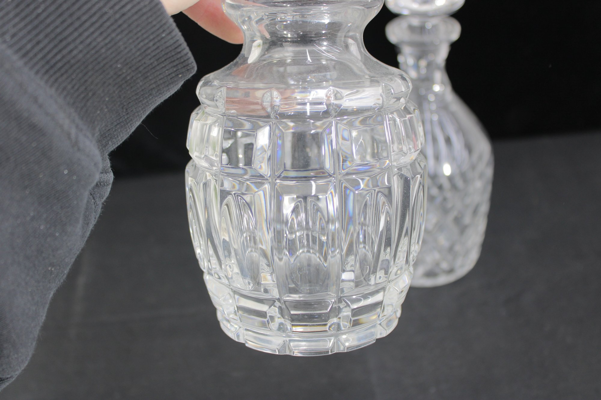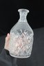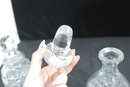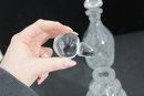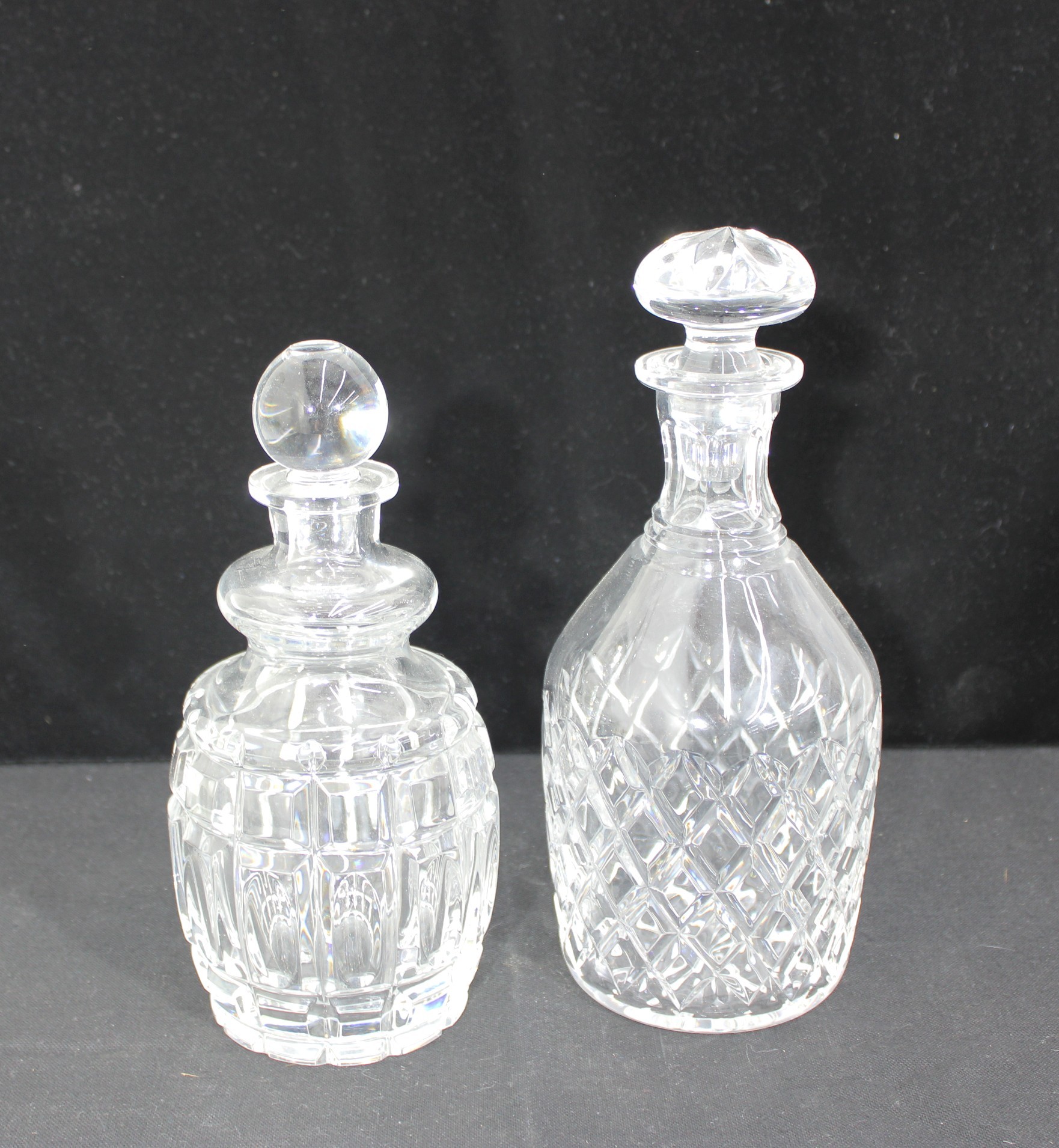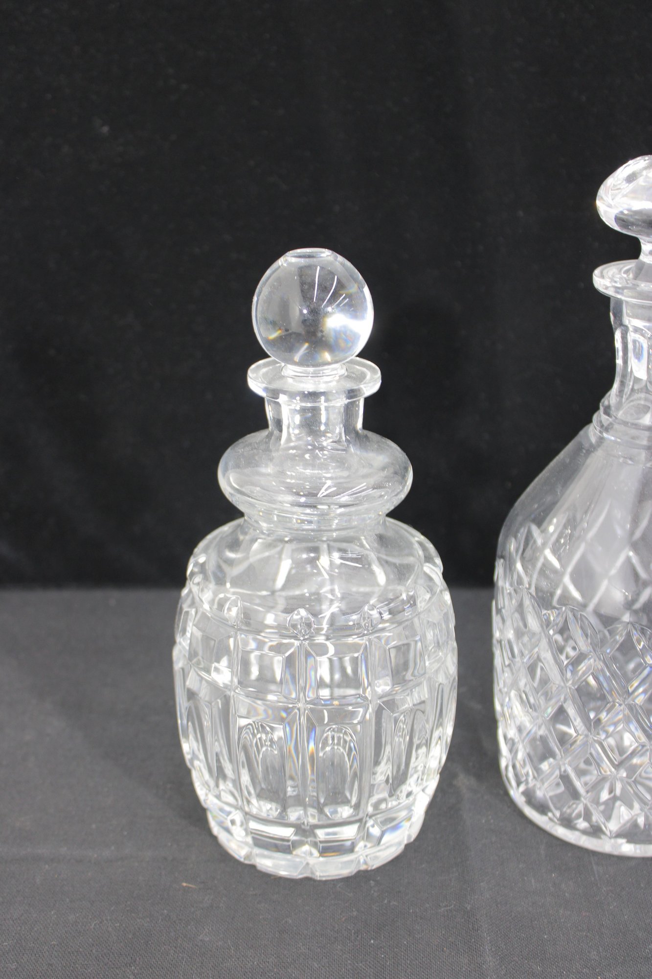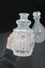 a set of two cut glass crystal decanters, each featuring elegant faceted patterns and matching glass stoppers. These timeless pieces bring classic sophistication to any home bar, dining room, or display cabinet.