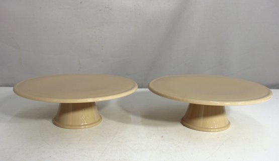 This set of two Essentials cake stands is perfect for displaying cakes, pastries, or desserts with an elegant and timeless presentation. Each stand measures 10.5 inches in diameter and 3.5 inches high, featuring a sturdy pedestal base with a smooth, glossy finish in a neutral beige tone.