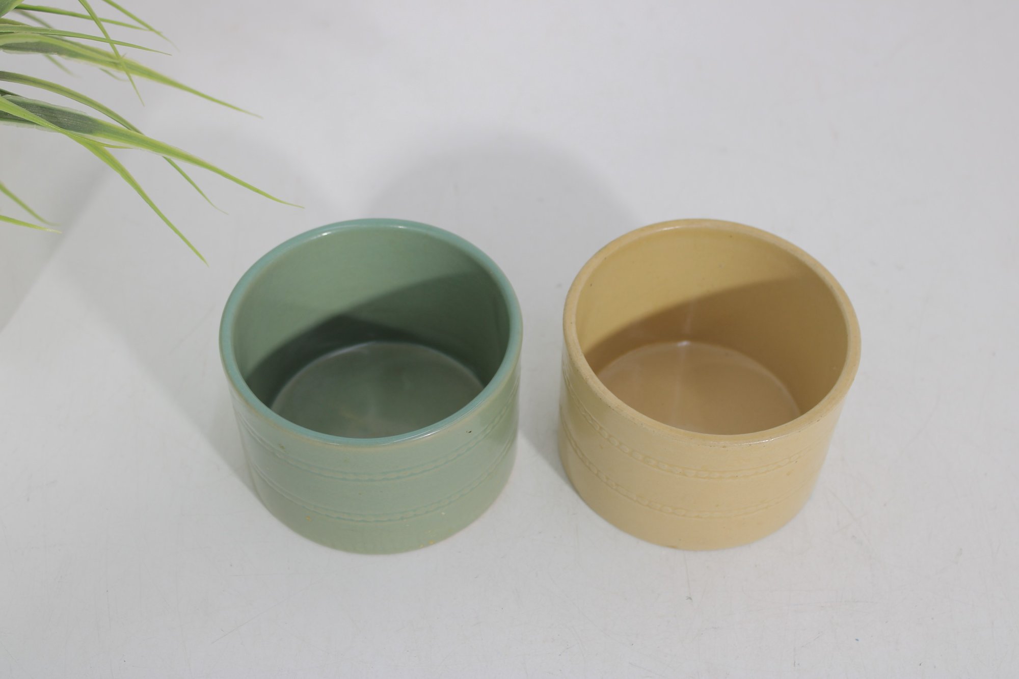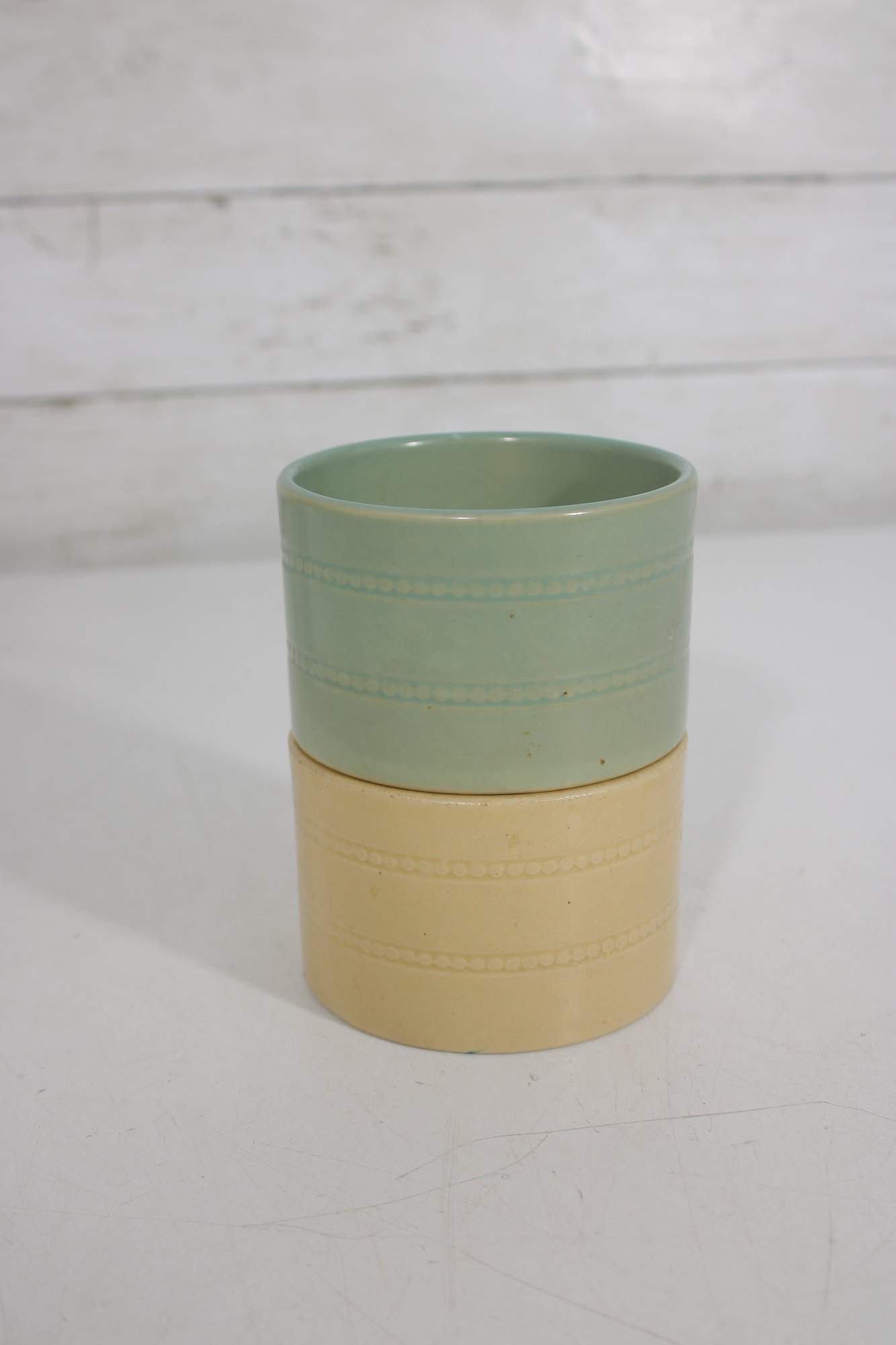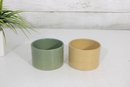 Charming set of two Over and Back ramekins in classic yellow ware style, perfect for serving custards, dips, sauces, or small sides. This set includes one soft green and one warm yellow glazed bowl, each featuring subtle banded detailing for a timeless, rustic look.