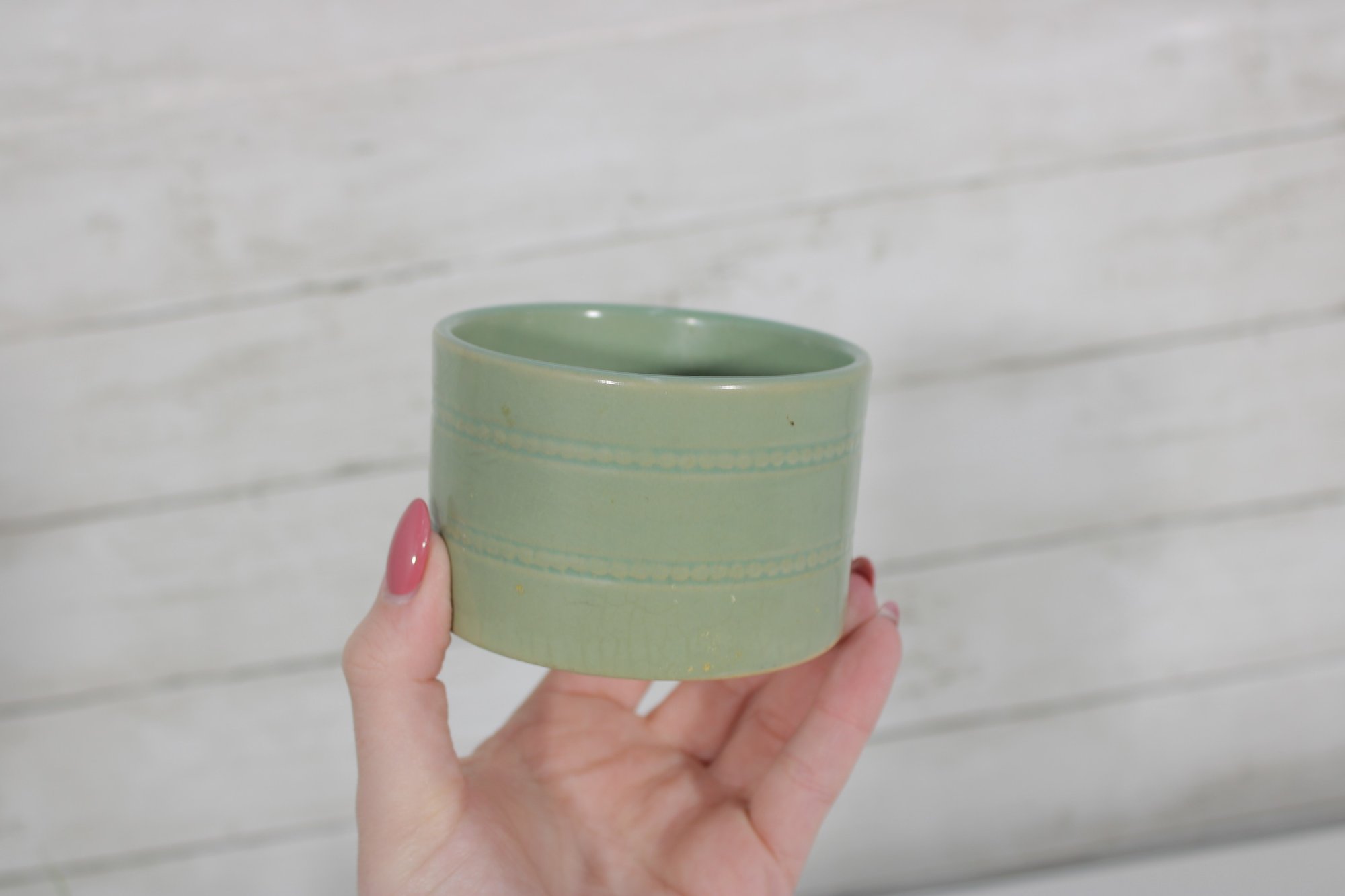 Each ramekin measures approximately 2.5" tall by 3.5" in diameter, making them ideal for individual servings or decorative use in a farmhouse or vintage-inspired kitchen.