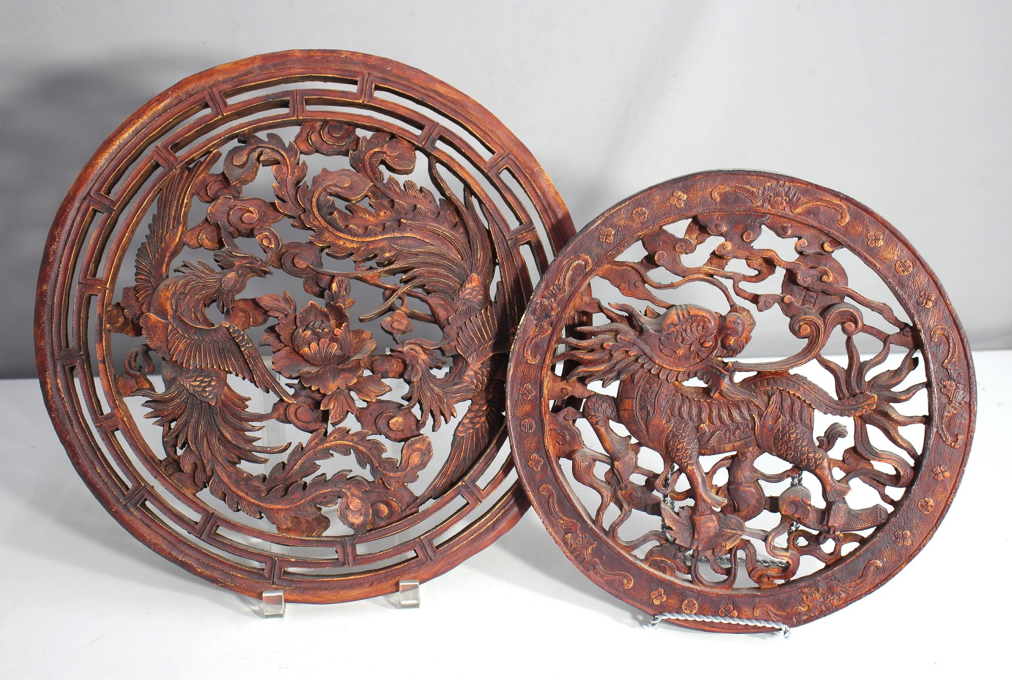 This exquisite pair of round wooden relief panels showcases intricate dragon carvings, symbolizing strength and prosperity. Each panel features detailed craftsmanship with delicate openwork, highlighting the swirling movements and majestic presence of the dragons. Perfect as wall art, these panels bring a touch of elegance and cultural significance to any space.