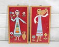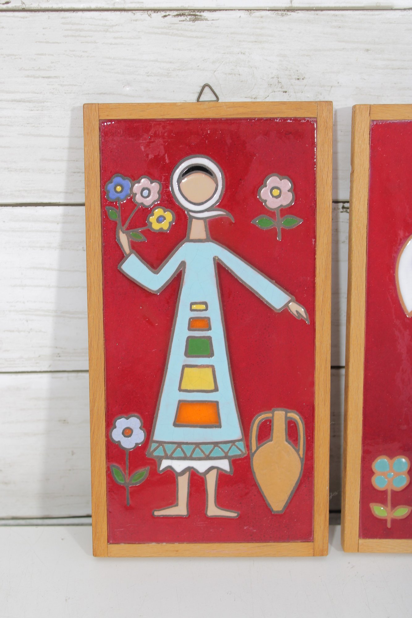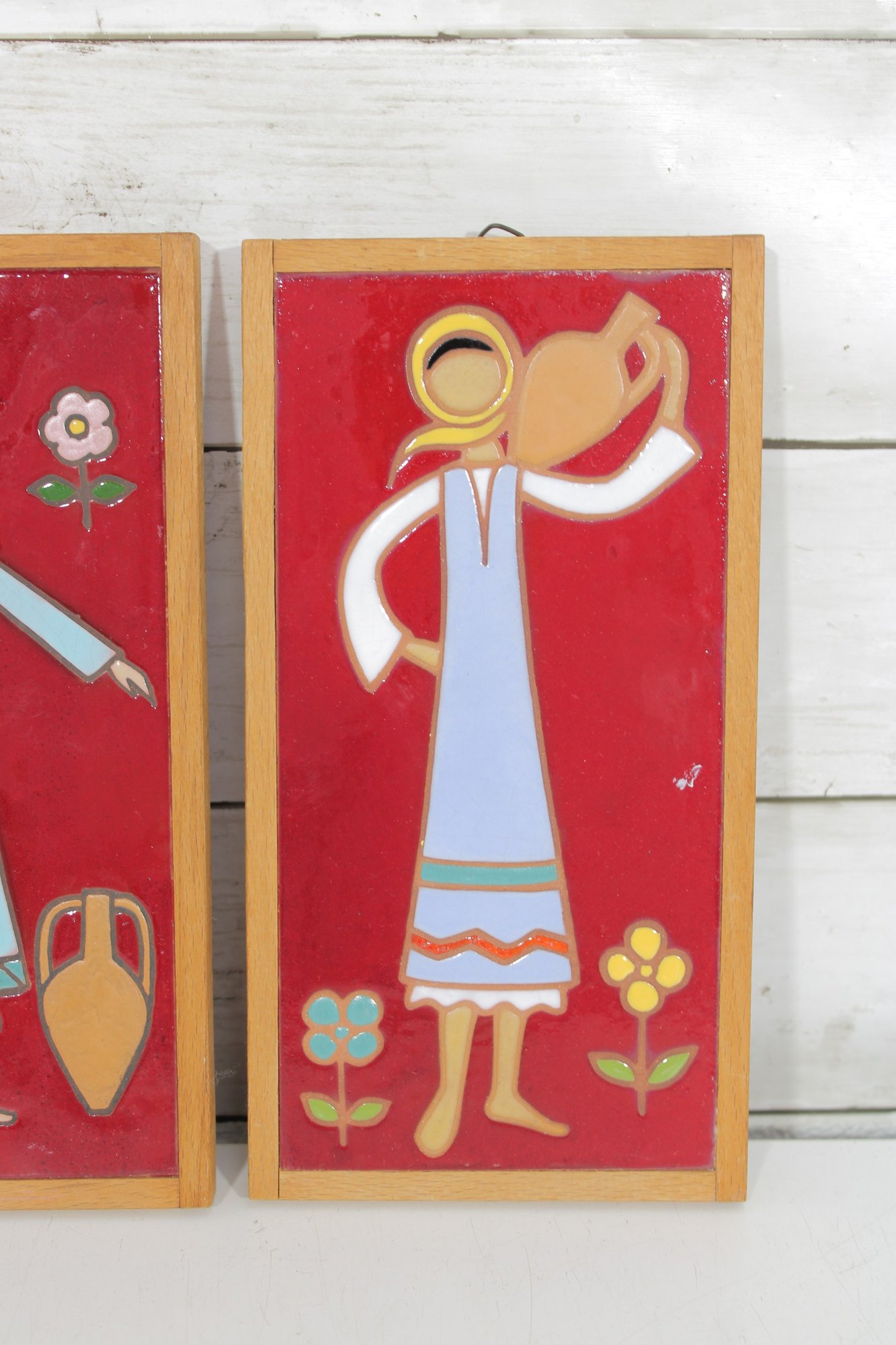 set of two vintage ceramic hanging tiles by E. Mixandidou, featuring stylized female figures in a bold folk-modern design. Each panel is set against a vibrant red background with colorful floral accents and simple geometric detailing.