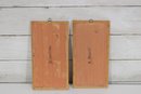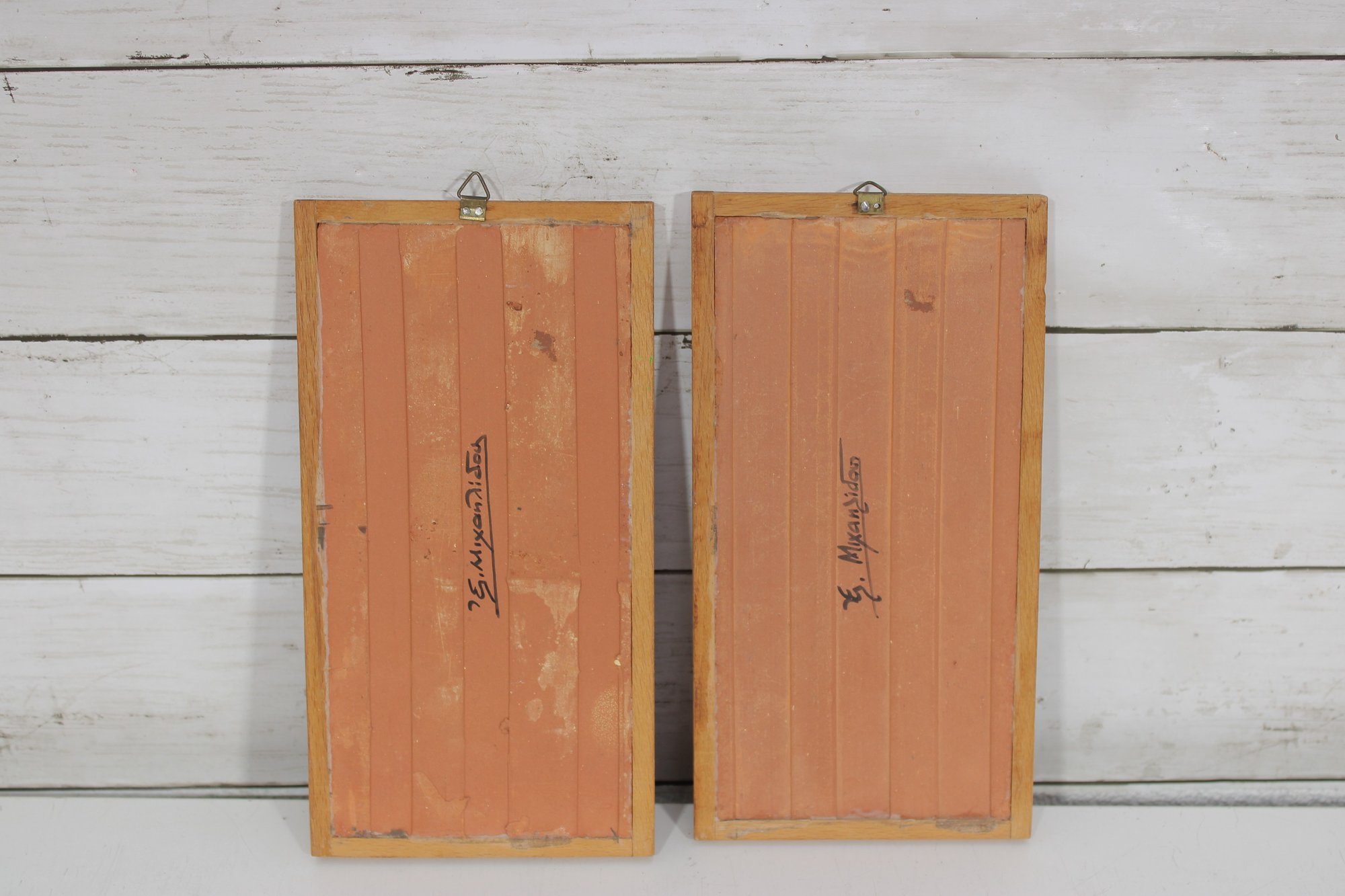 The figures are rendered in a minimalist, elongated style—one holding flowers and the other carrying a vessel—typical of Mixandidou’s distinctive artistic approach. Both tiles are framed in wood and include metal hangers for easy wall display.