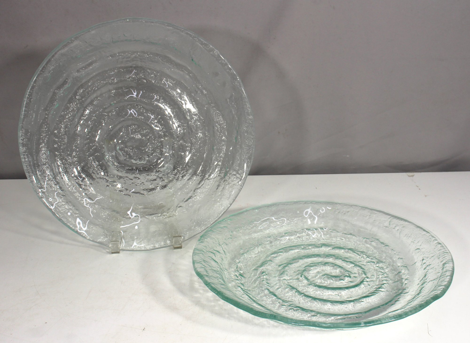 Add a touch of elegance to your table setting with this stunning pair of textured glass plates. Featuring a captivating swirl design, these plates measure approximately 13.5 inches in diameter and offer a unique, artisan-crafted aesthetic. Their clear glass construction allows them to complement any décor, making them perfect for serving, display, or decorative use. These plates are in excellent condition with no visible chips or cracks. Don't miss out on this stylish and functional set!