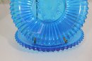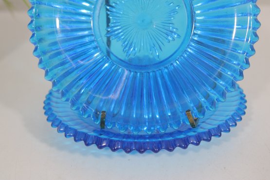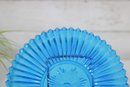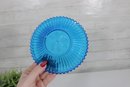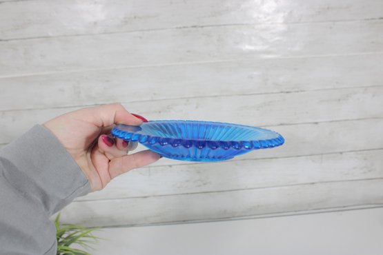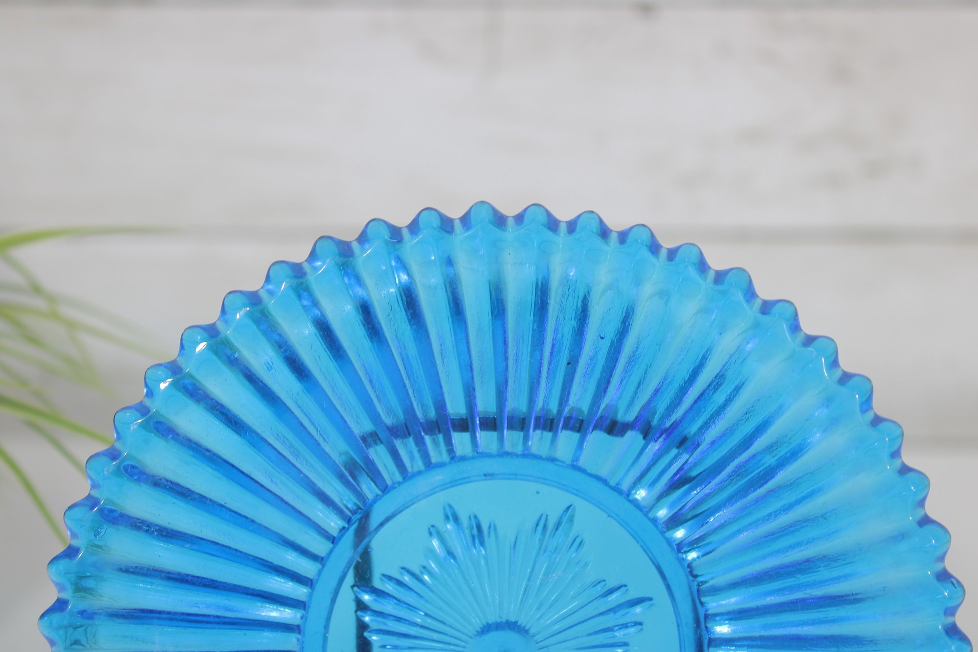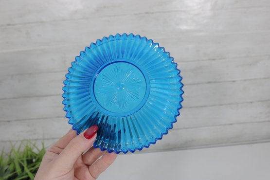The vibrant blue color catches the light beautifully, giving these plates a luminous, almost glowing appearance. Their vintage-inspired design makes them perfect for decorative use, small serving dishes, or as accent pieces in a glass collection.