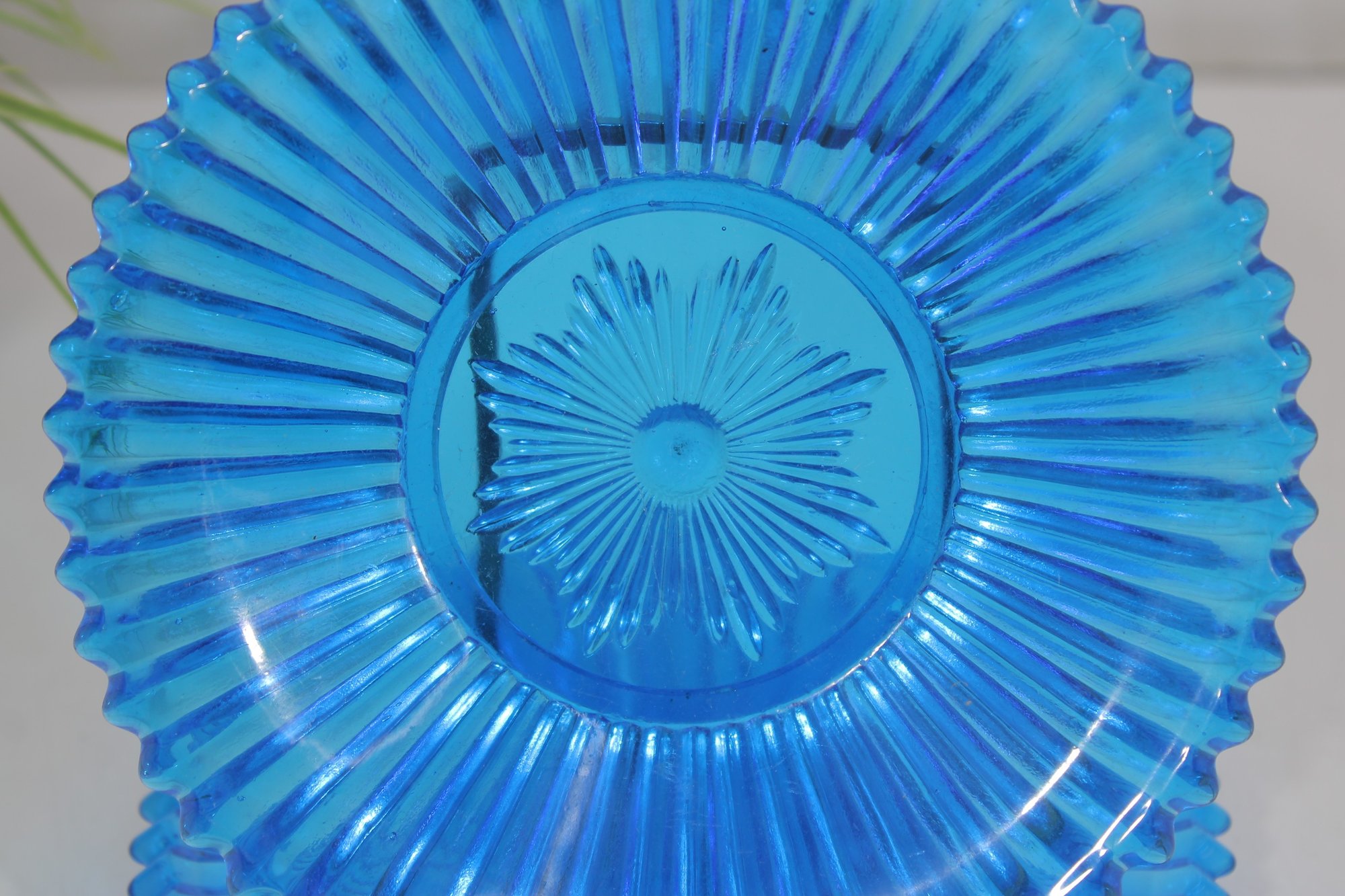 this stunning set of two turquoise blue art glass plates. Each piece measures approximately 6" in diameter and features a striking starburst pattern at the center, radiating outward into a beautifully ribbed, scalloped edge.