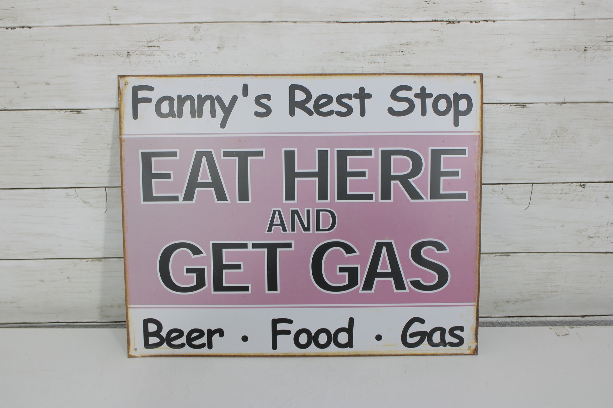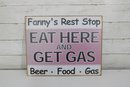 “Fanny’s Rest Stop – Eat Here and Get Gas” – Measures approximately 12" x 15" and mimics a vintage roadside diner sign with bold lettering and playful personality.