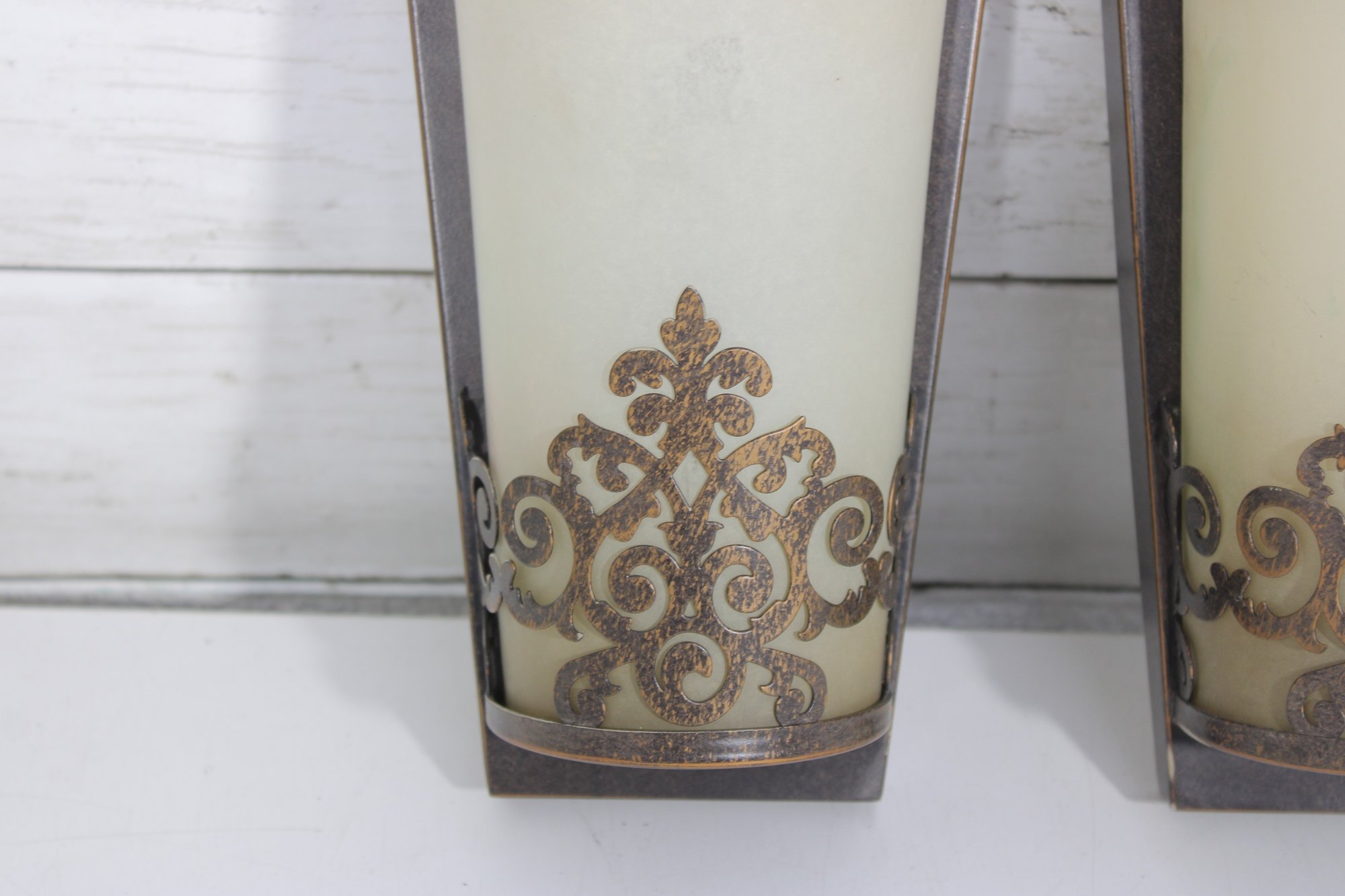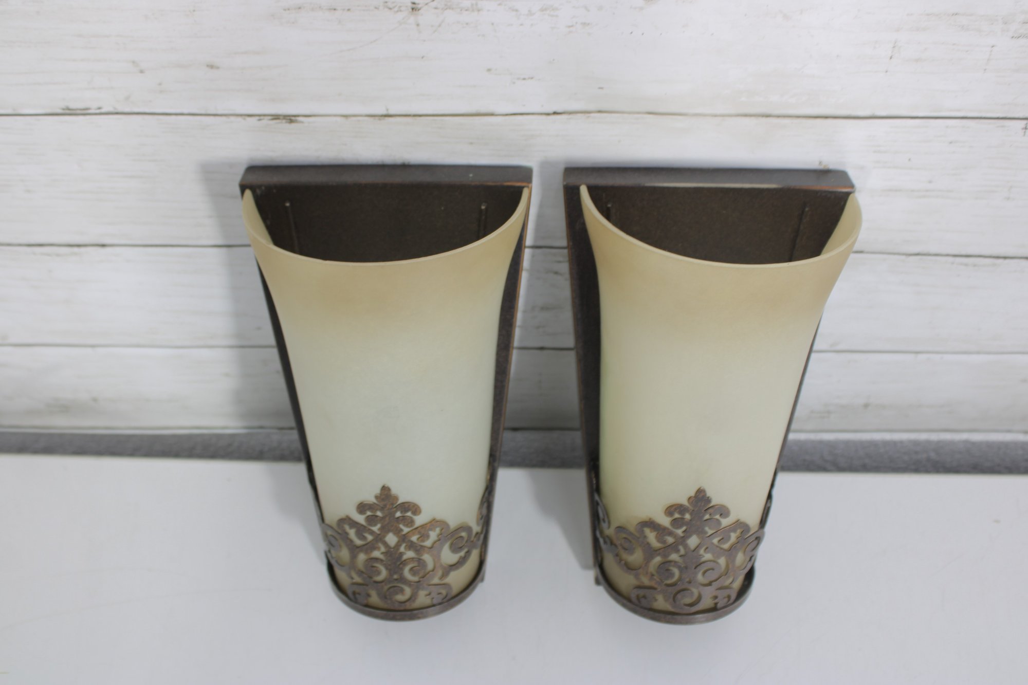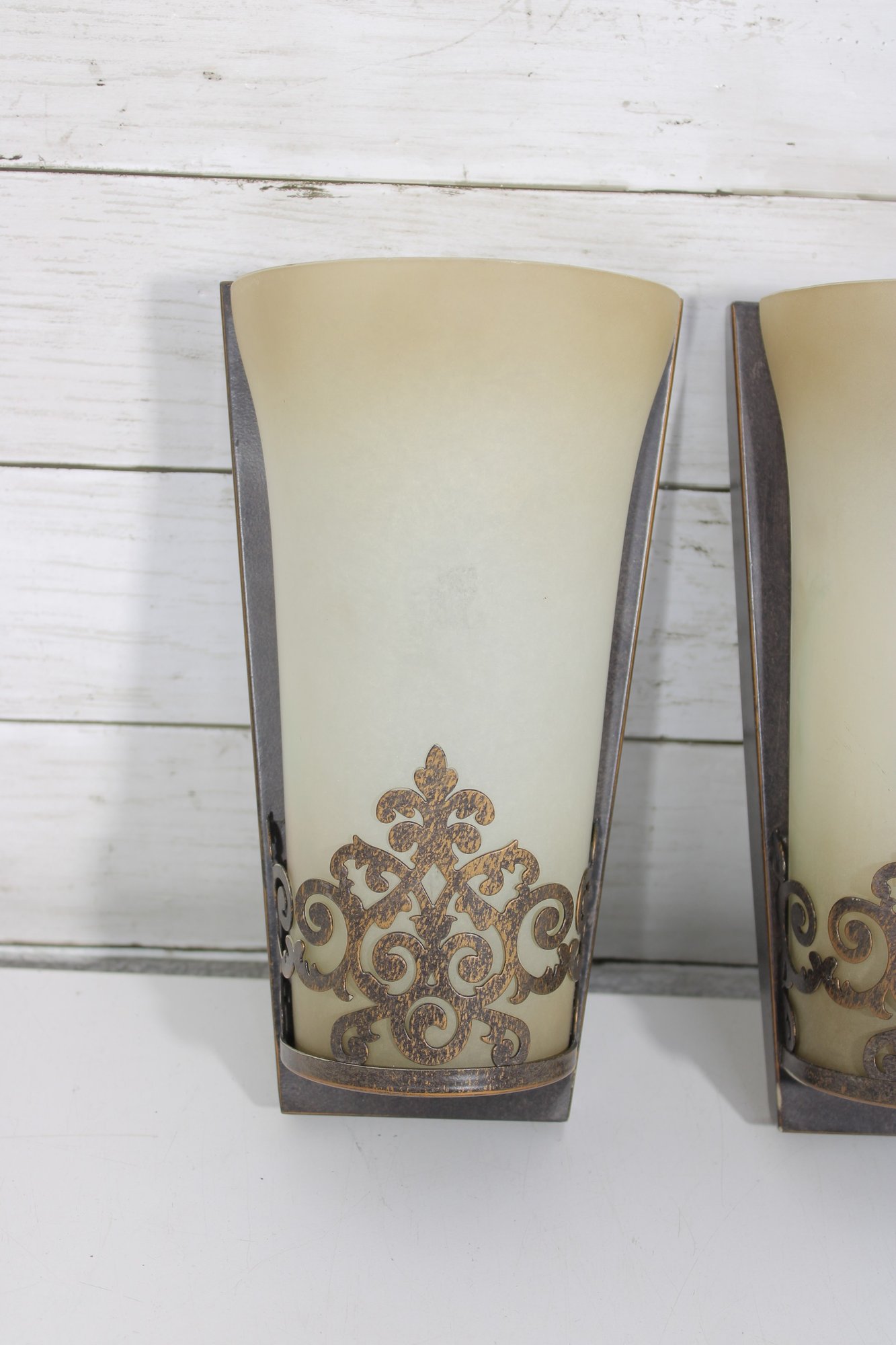 set of two wall sconce light fixtures featuring softly curved frosted glass shades accented with an ornate bronze-tone scroll motif. The warm neutral tones and classic design make these sconces a perfect fit for traditional, transitional, or vintage-inspired interiors.