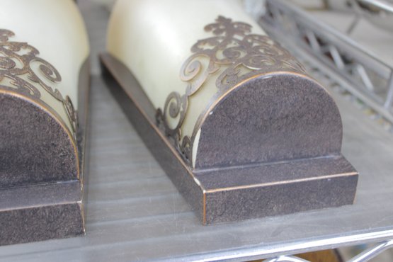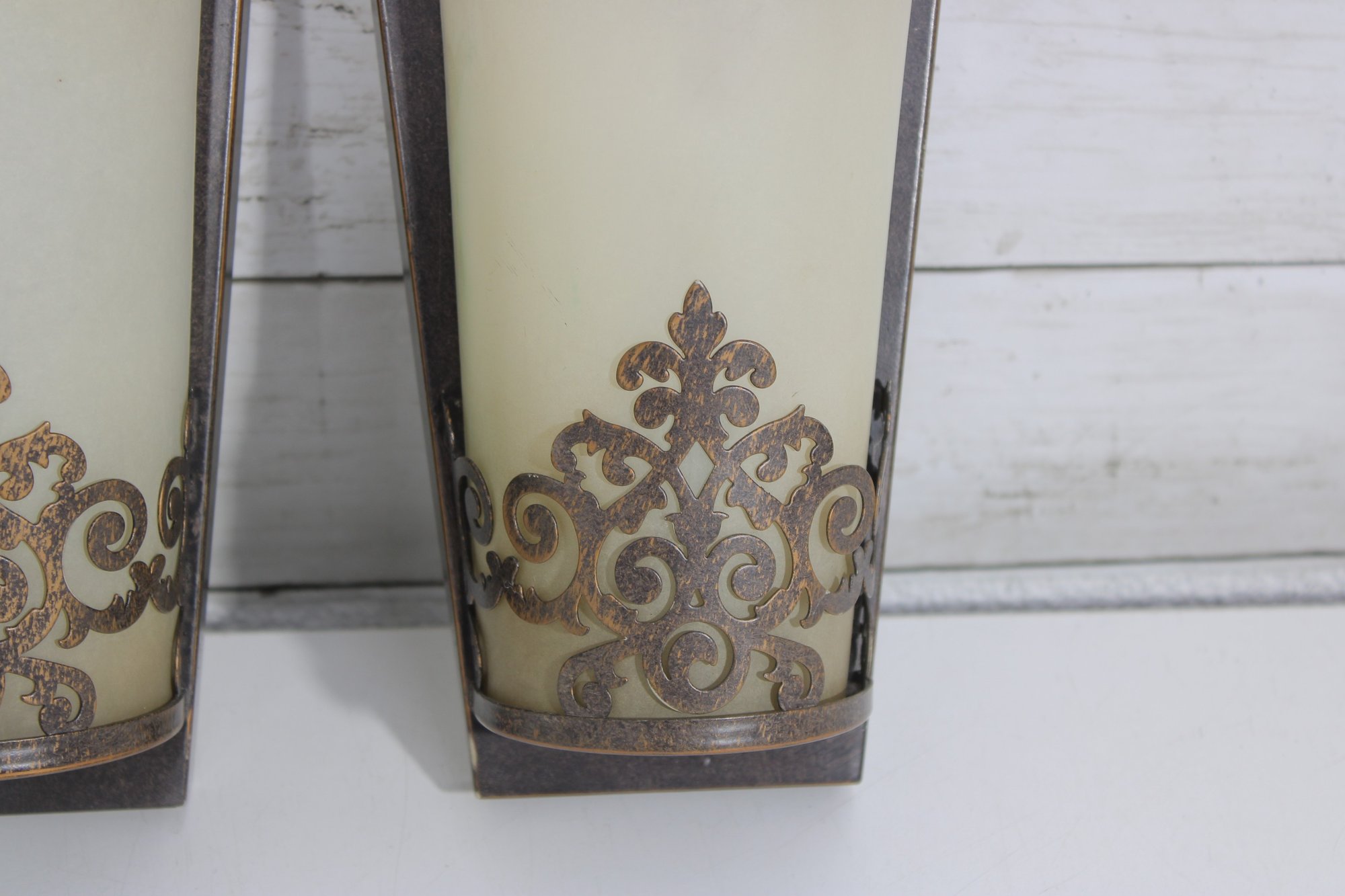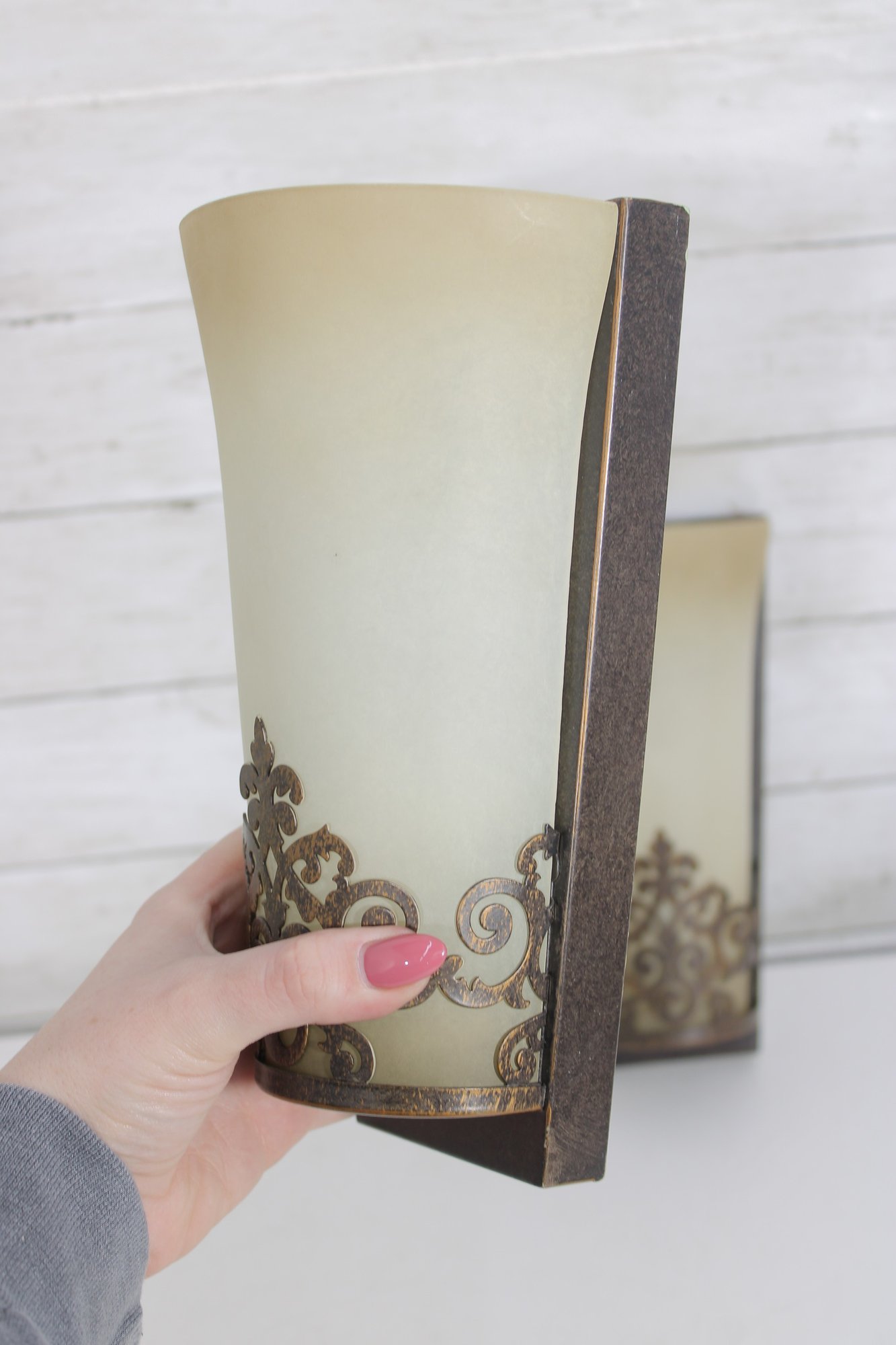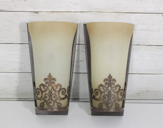 set of two wall sconce light fixtures featuring softly curved frosted glass shades accented with an ornate bronze-tone scroll motif. The warm neutral tones and classic design make these sconces a perfect fit for traditional, transitional, or vintage-inspired interiors.