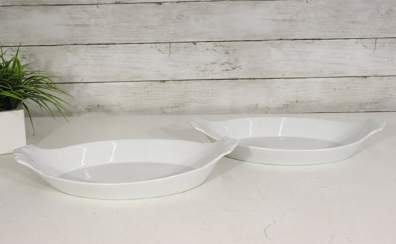 this set of two white porcelain oval baking dishes brings timeless style to your kitchen or dining table. Each dish measures 14 inches long by 8 inches wide, offering generous space for baking, roasting, or serving your favorite dishes.