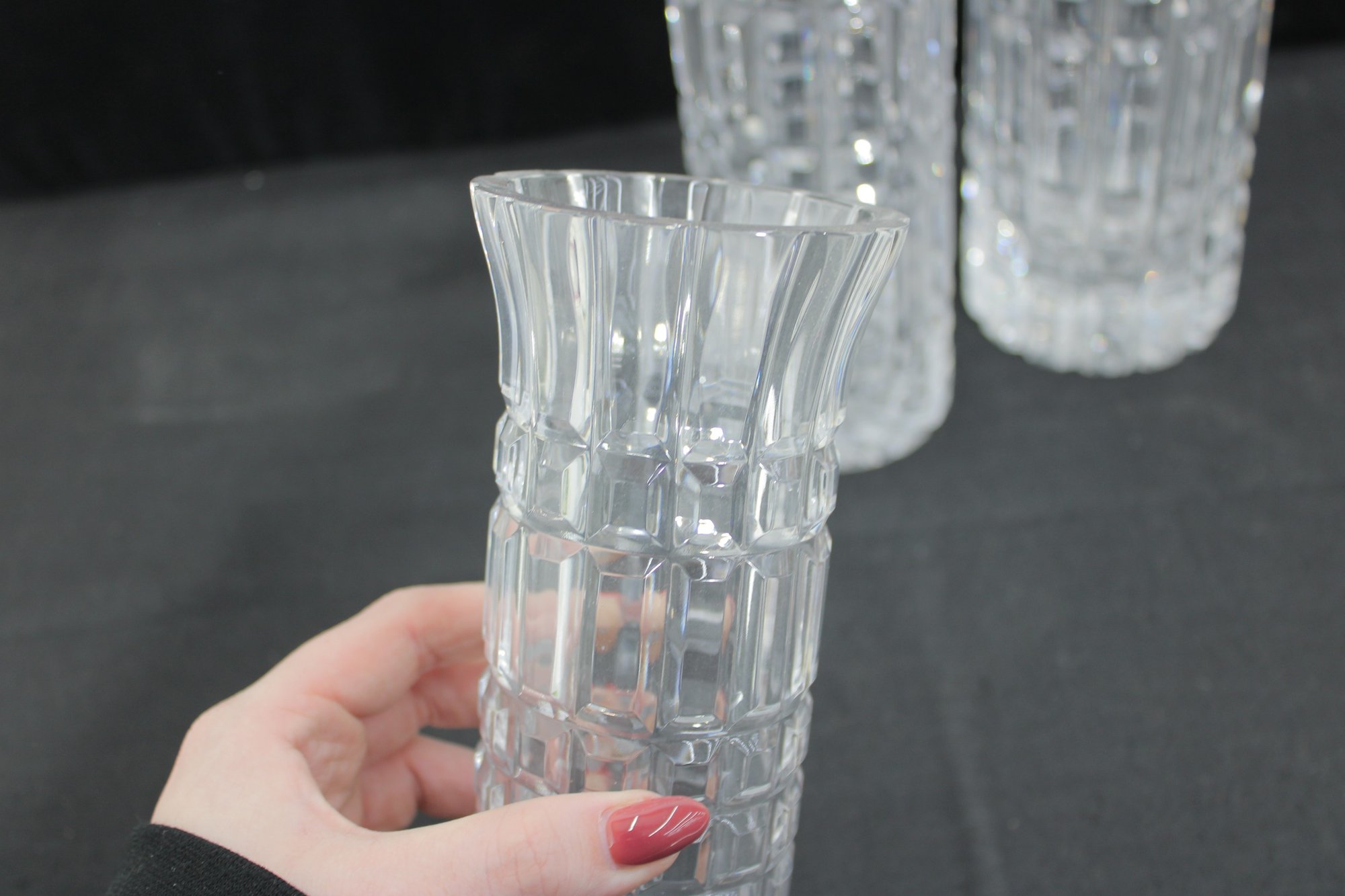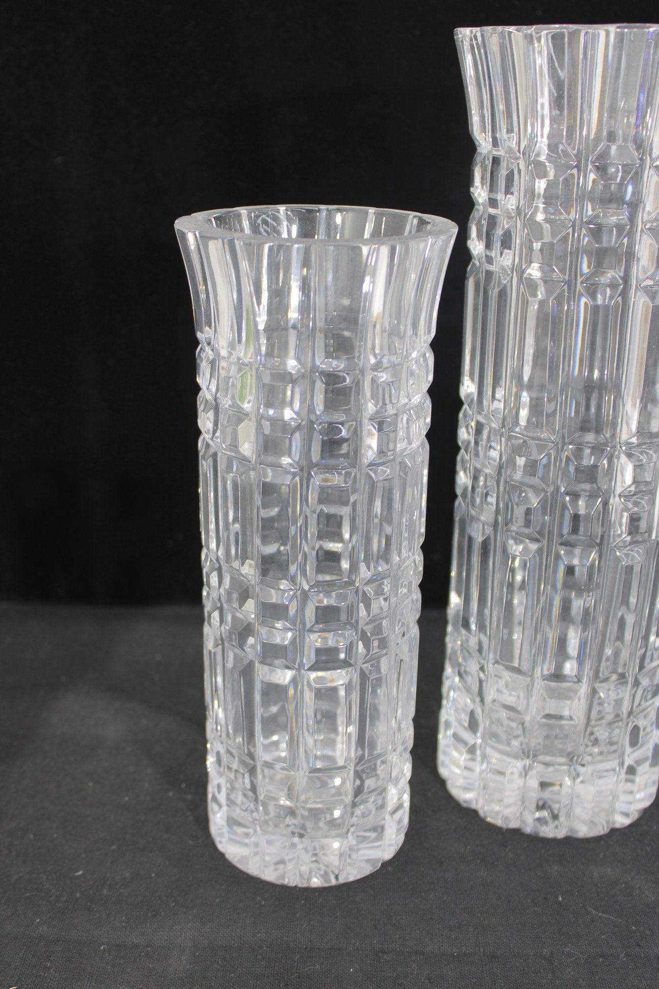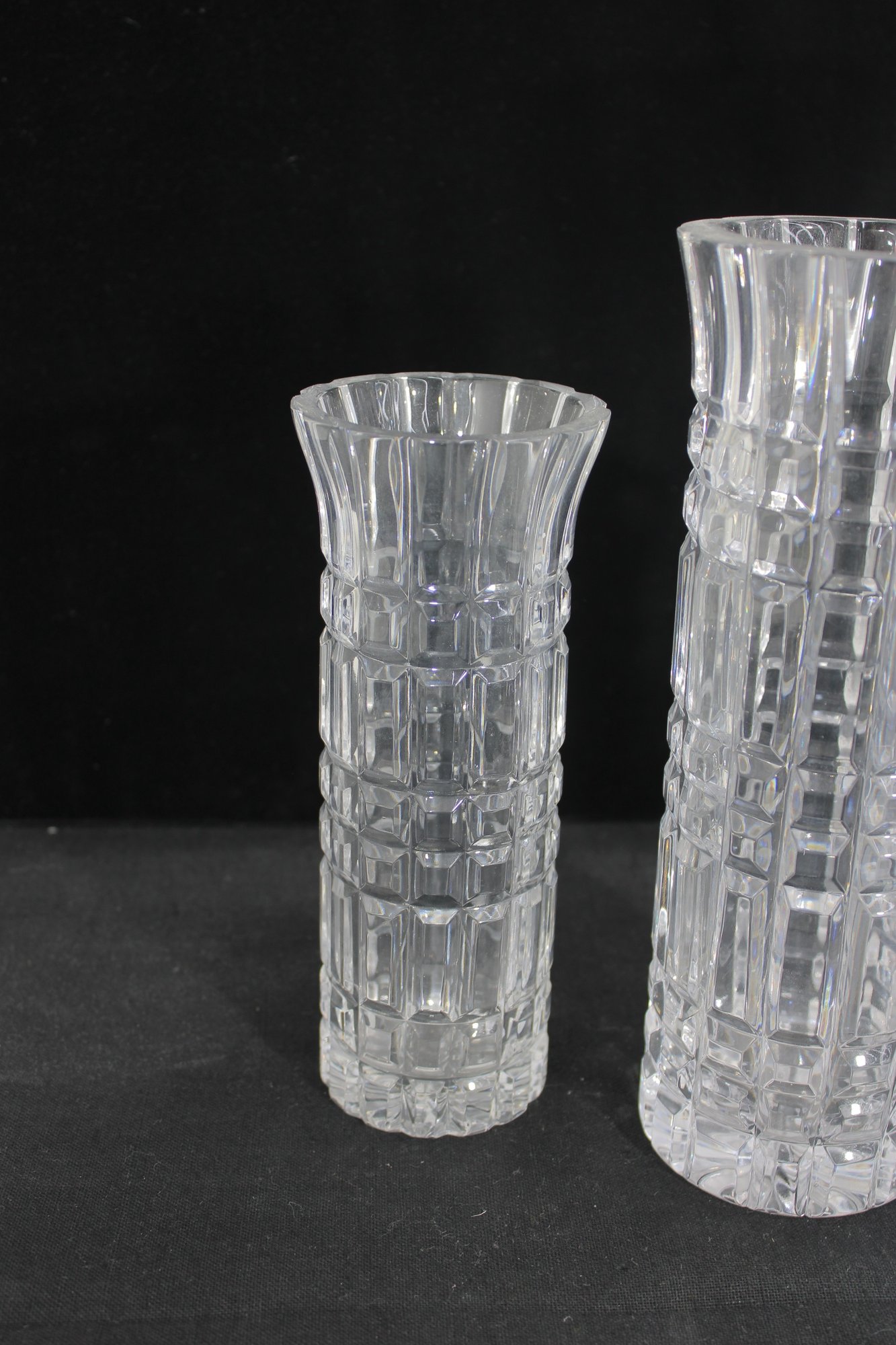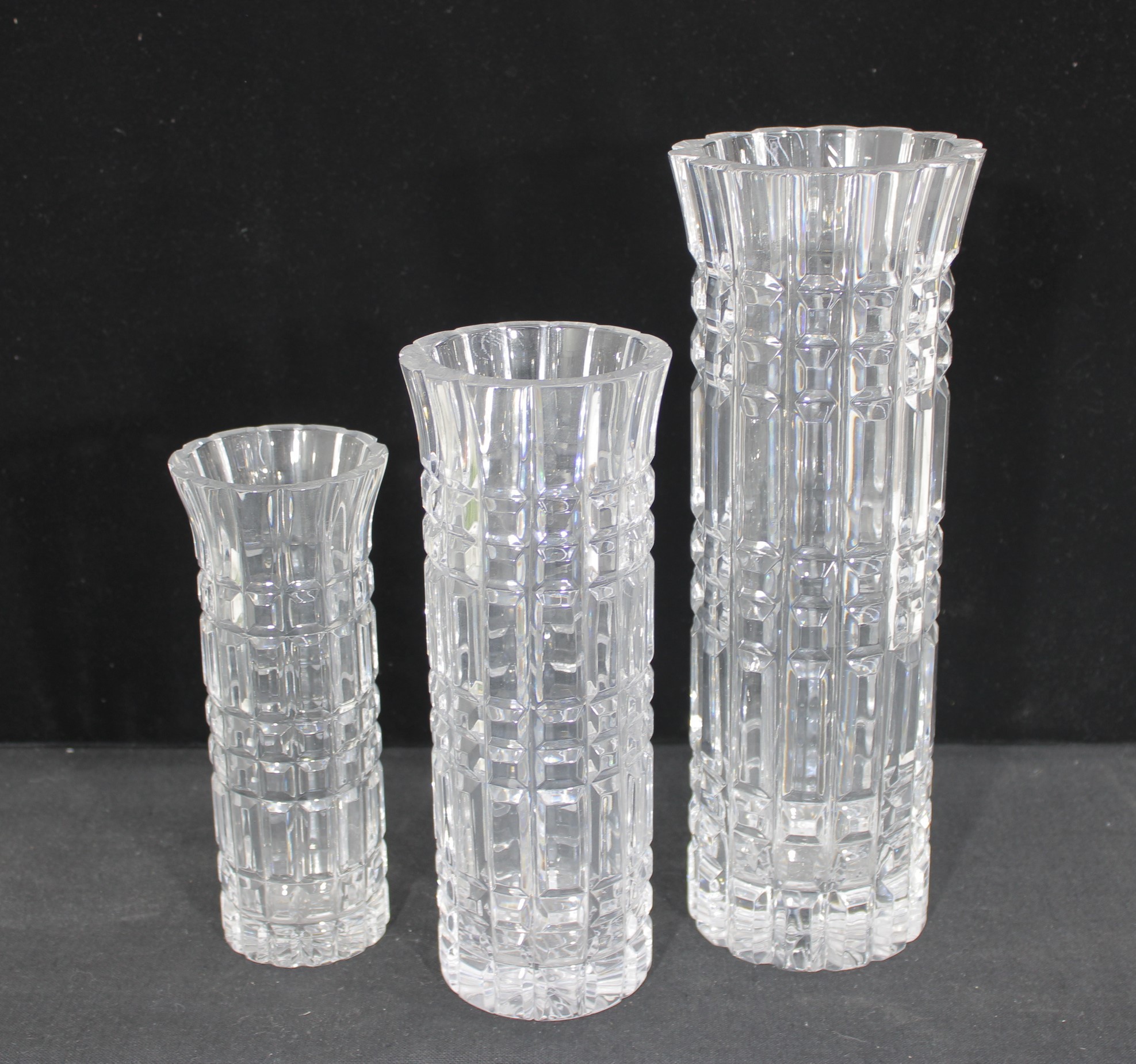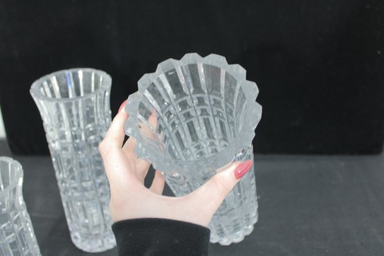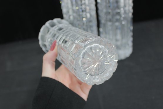 Each vase showcases a striking geometric cut pattern with vertical and horizontal facets that catch and reflect the light beautifully. The flared rims and thick bases give these pieces a substantial, high-quality feel.